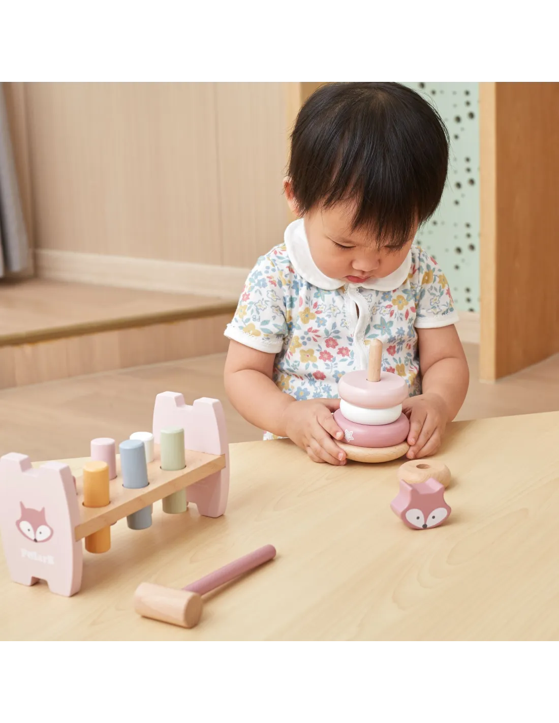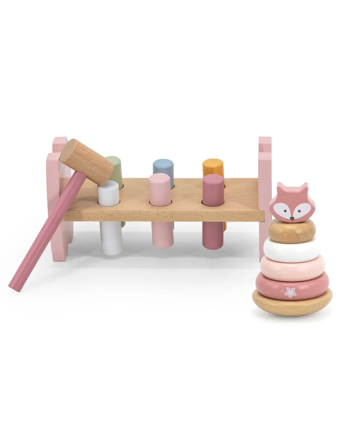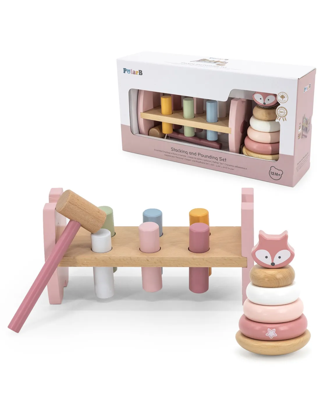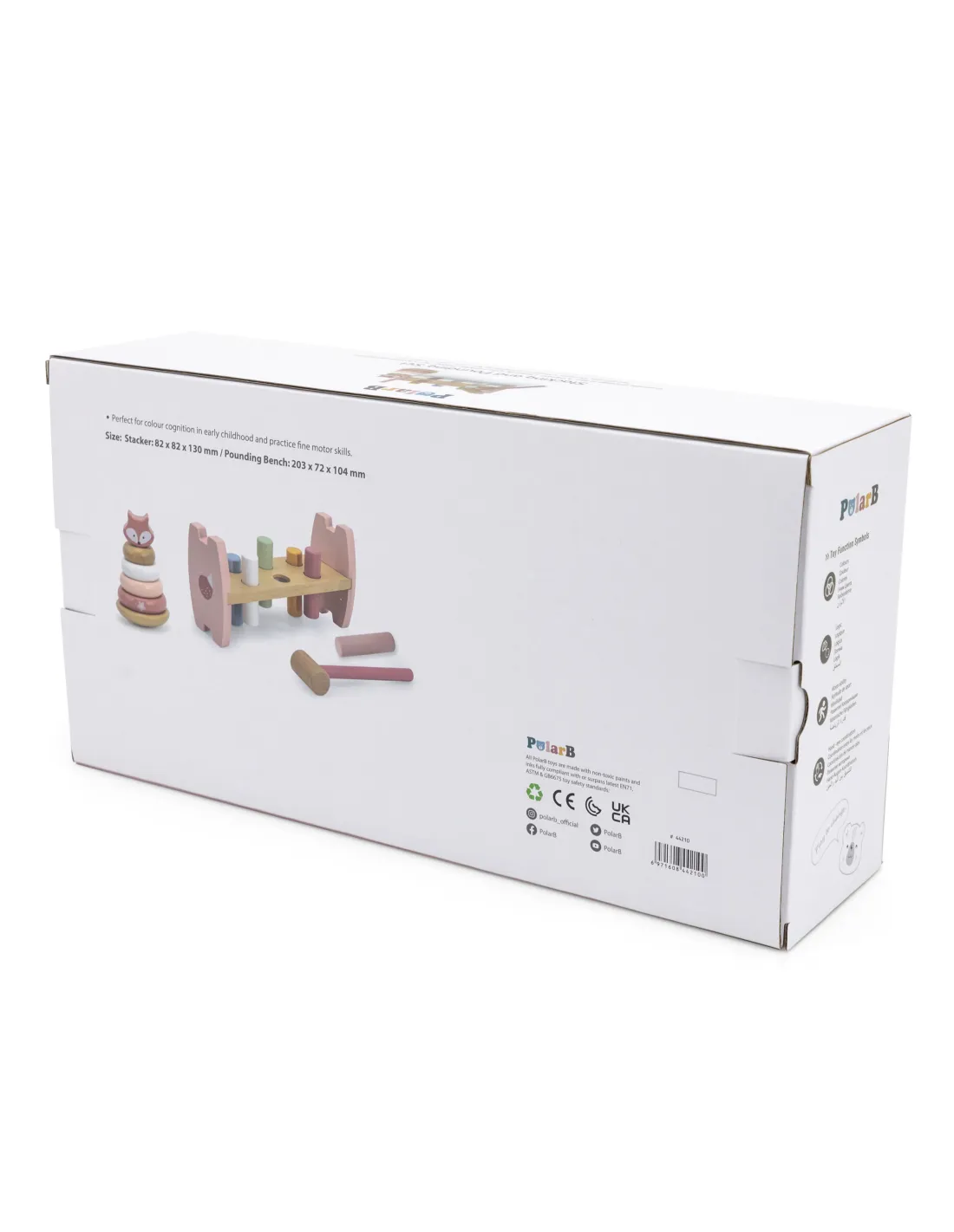 Šis „Viga“ „PolarB“ serijos rinkinys apima du pastelinės spalvos medinius žaislus: mokomąją piramidę bei plaktuką ir štampą. Abu žaislai ne tik užims jūsų vaiką, bet ir prisidės prie smulkiosios motorikos įgūdžių, loginio mąstymo bei spalvų pažinimo ugdymo. Laikas, praleistas žaidžiant su šiais žaislais, padės jūsų vaikui išugdyti tikslius rankų judesius, o tai vėliau palengvins rašymo mokymąsi.
