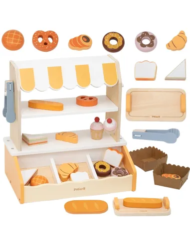 This charming wooden Mini Bakery from VIGA is the perfect toy for role-play! The set includes a realistic stand/stall with a striped roof and 16 wooden accessories imitating delicious baked goods. Children can take on the role of a real baker or salesperson , serving croissants, doughnuts, toast, muffins, and many other treats to customers. The stand features two display shelves , a special place for bread (imitating a brick oven), and serving tongs , adding an authentic feel to the play. The subtle, pastel colors (natural wood, white, and shades of orange/yellow) make the bakery a beautiful addition to any child's room. Playing the bakery game is great for developing creativity and social skills through interaction and supporting motor skills through manipulating small elements and tongs. The high-quality and durable wooden construction guarantees hours of safe and engaging play. Give your child the chance to run their own small business with VIGA!