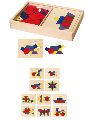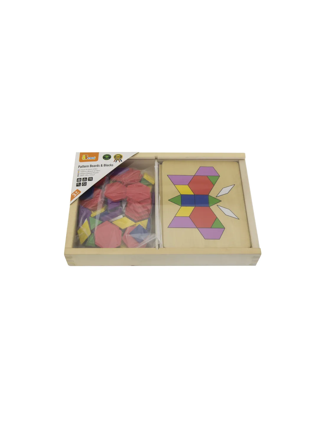 Jūsų vaikas galės suderinti figūras su pridedamais šablonais ir sukurti tokius dalykus kaip laivas, zuikis, drugelis ir kt. Iš viso medinėje dėžutėje, skirtoje blokeliams laikyti, yra 148 detalės ir 10 skirtingų medinių lentelių. Medinis