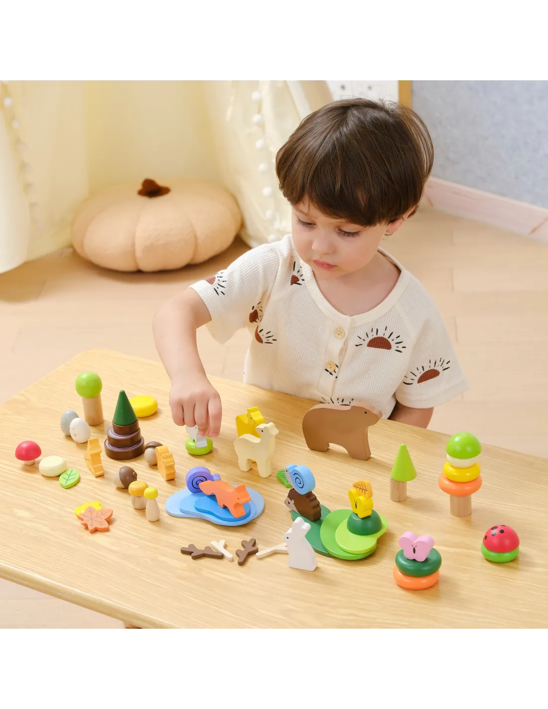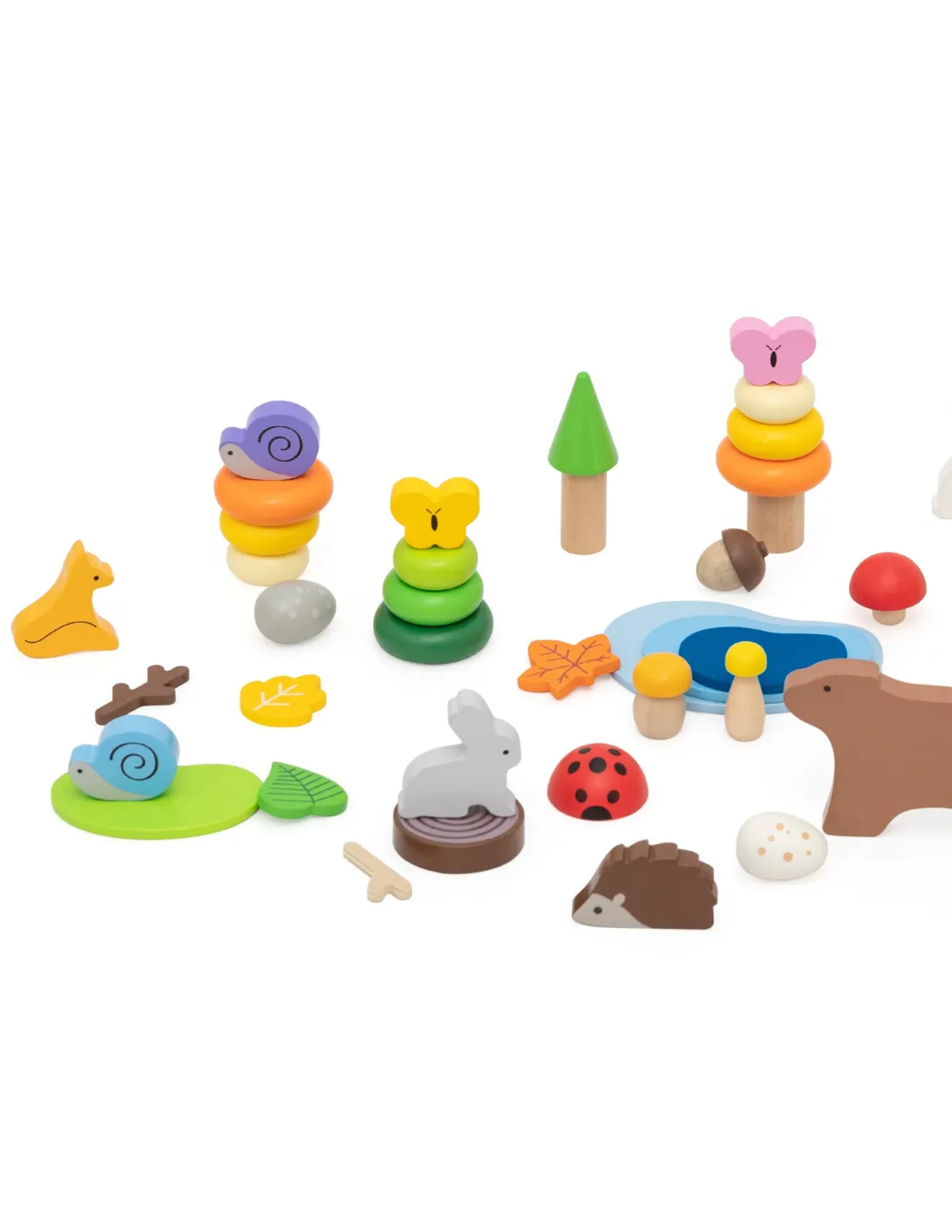 - - Miško tema: gyvūnų figūrėlės (lokys, elnias, lapė, kiškis, sraigė, drugelis, boružė) ir gamtos elementai (medžiai, ežeras, grybai, lapai)