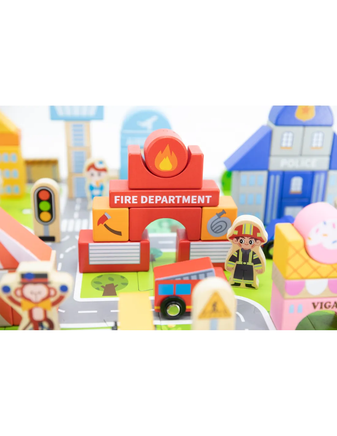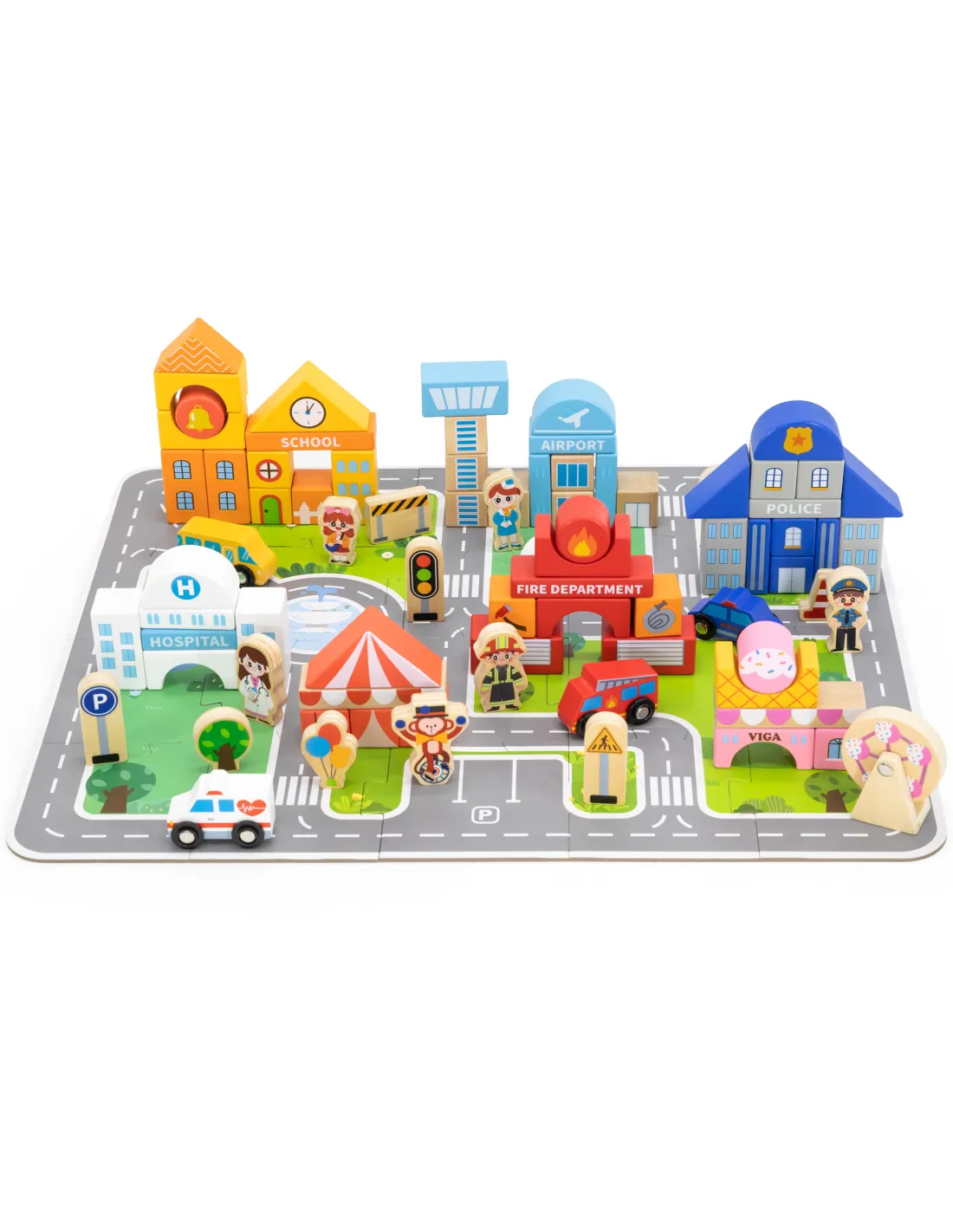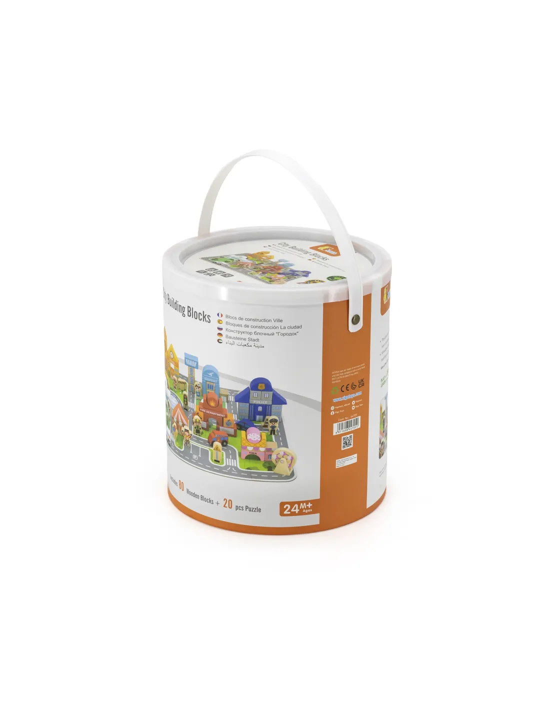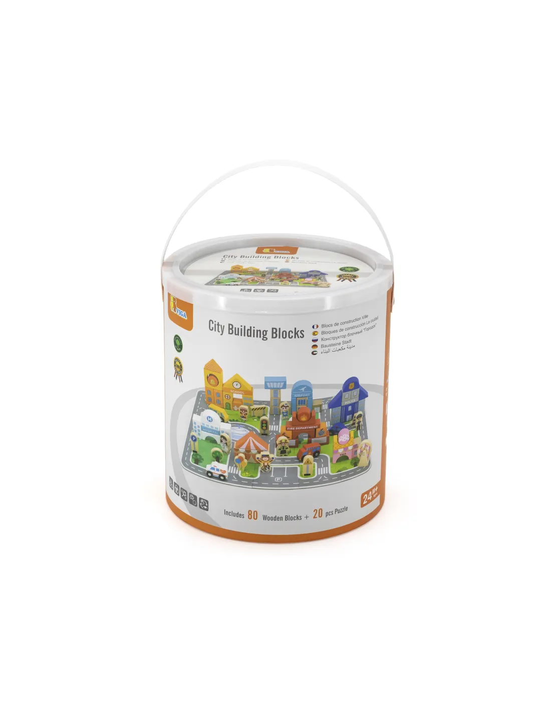 „Viga“ medinis miesto statybų rinkinys – tai puikus žaislas būsimiems architektams, norintiems sukurti savo miesto planą. Išskleiskite modelį ir naudodami įvairių formų bei gražių spalvų blokelius pastatykite miestą! Rinkinyje yra 60 blokelių, iš kurių galima pastatyti mokyklą, ligoninę, policijos nuovadą, gaisrinę, oro uostą, saldainių parduotuvę ir cirką, o paskui juos išdėstyti bet kurioje miesto lentos vietoje. Be pačių pastatų, rinkinyje yra 5 transporto priemonės, 6 figūrėlės, vaizduojančios įvairių profesijų atstovus, atitinkančius miesto pastatus, bei papildomi priedai, įskaitant kelio ženklus ir medžius. Viskas patogiai supakuota į kibirėlį, kad būtų lengva laikyti.
