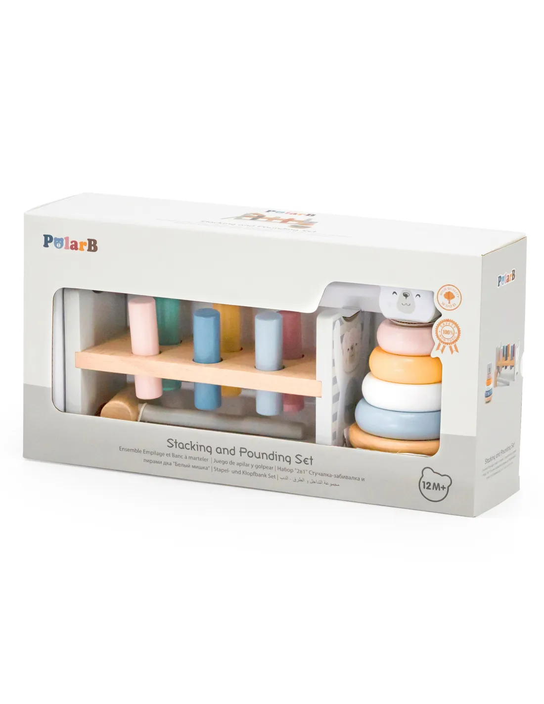 Šis „Viga“ „PolarB“ serijos rinkinys apima du pastelinės spalvos medinius žaislus: mokomąją piramidę bei plaktuką ir štampą. Abu žaislai ne tik pramogaus jūsų vaiką, bet ir prisidės prie smulkiosios motorikos įgūdžių, loginio mąstymo bei spalvų pažinimo ugdymo. Laikas, praleistas žaidžiant su šiais žaislais, padės jūsų vaikui išugdyti tikslius rankų judesius, o tai vėliau palengvins rašymo mokymąsi.