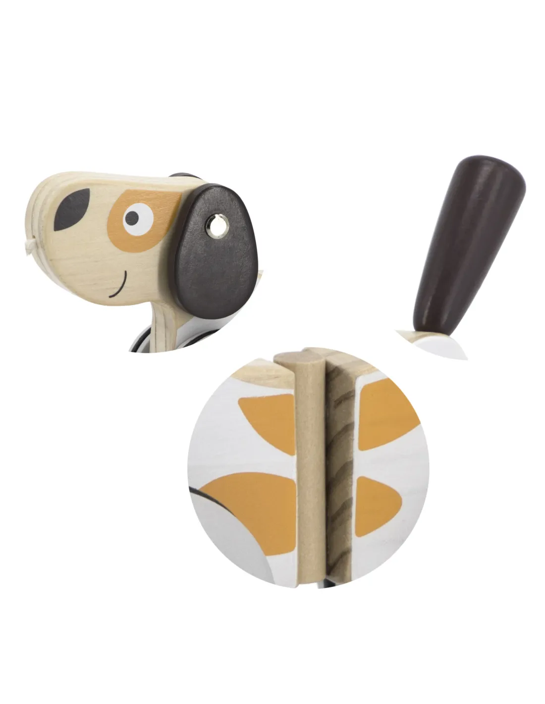 Mažas šuniukas turi pavadėlį, leidžiantį jį vedžioti kilimu ir už jo ribų. Šuo pasivaikščiojimų metu bus labai mandagus ir, svarbiausia, labai tylus – ratukai turi gumines pagalvėles. Pagalvėlės slopins bet kokius spragsėjimo garsus. Kai mažylis patrauks virvelę, šuo pradės judėti ir linksmai vizgins uodegą.