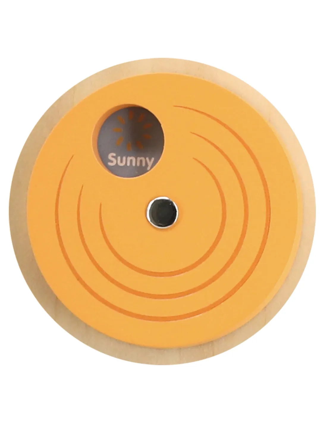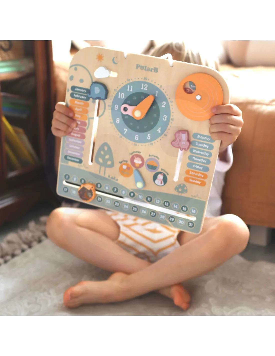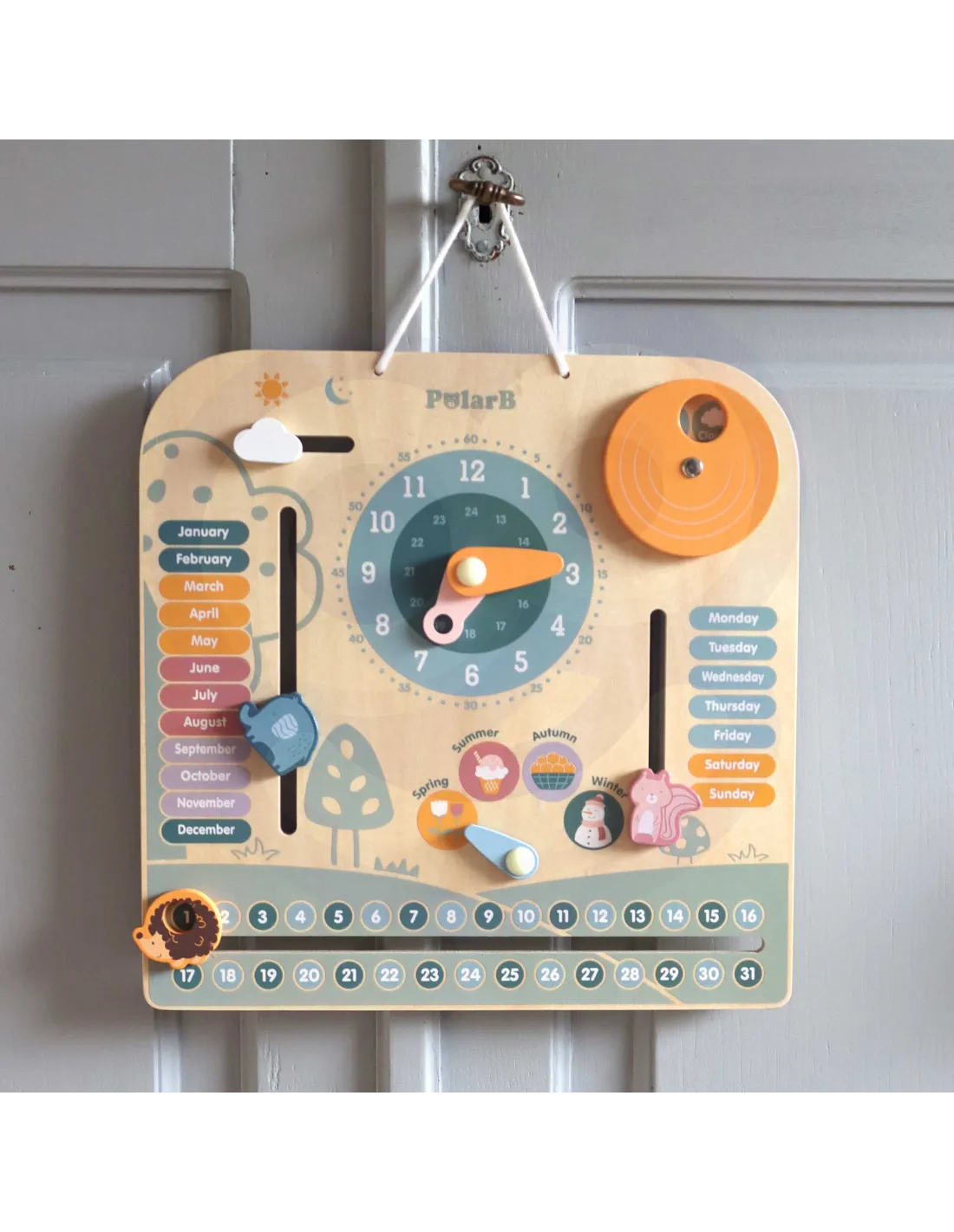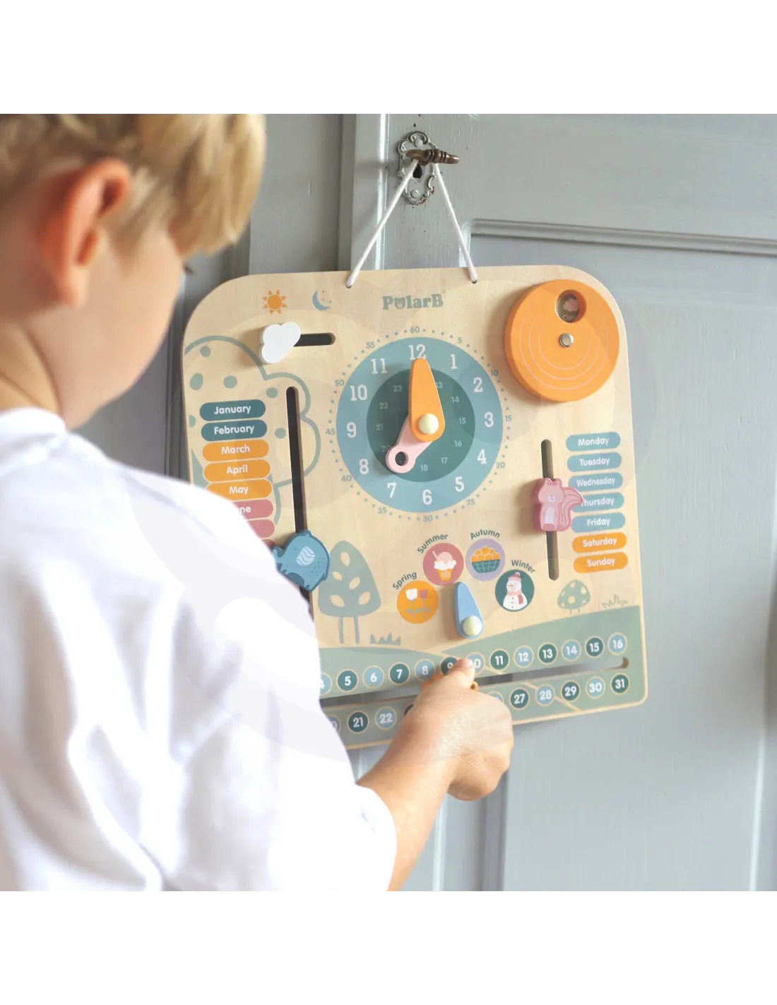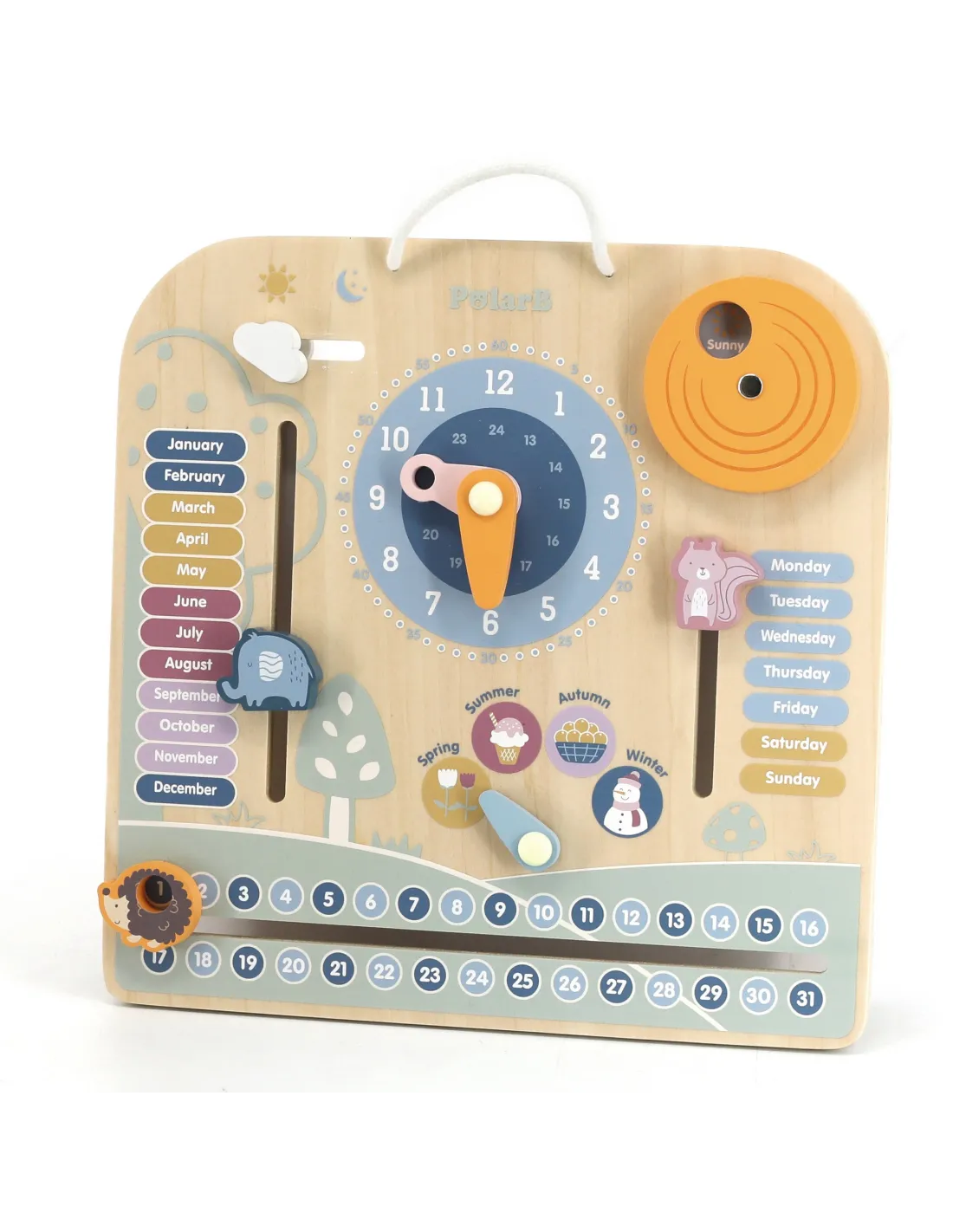 - - a wooden toy with a clock and markings: days of the week, months, seasons and weather,
