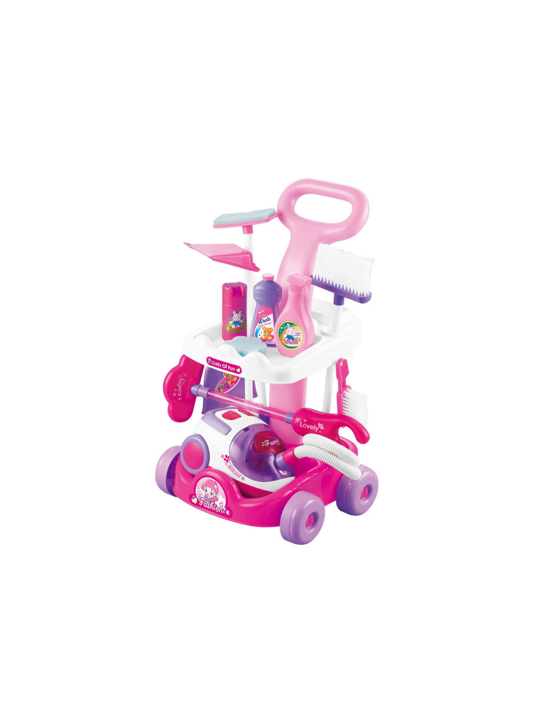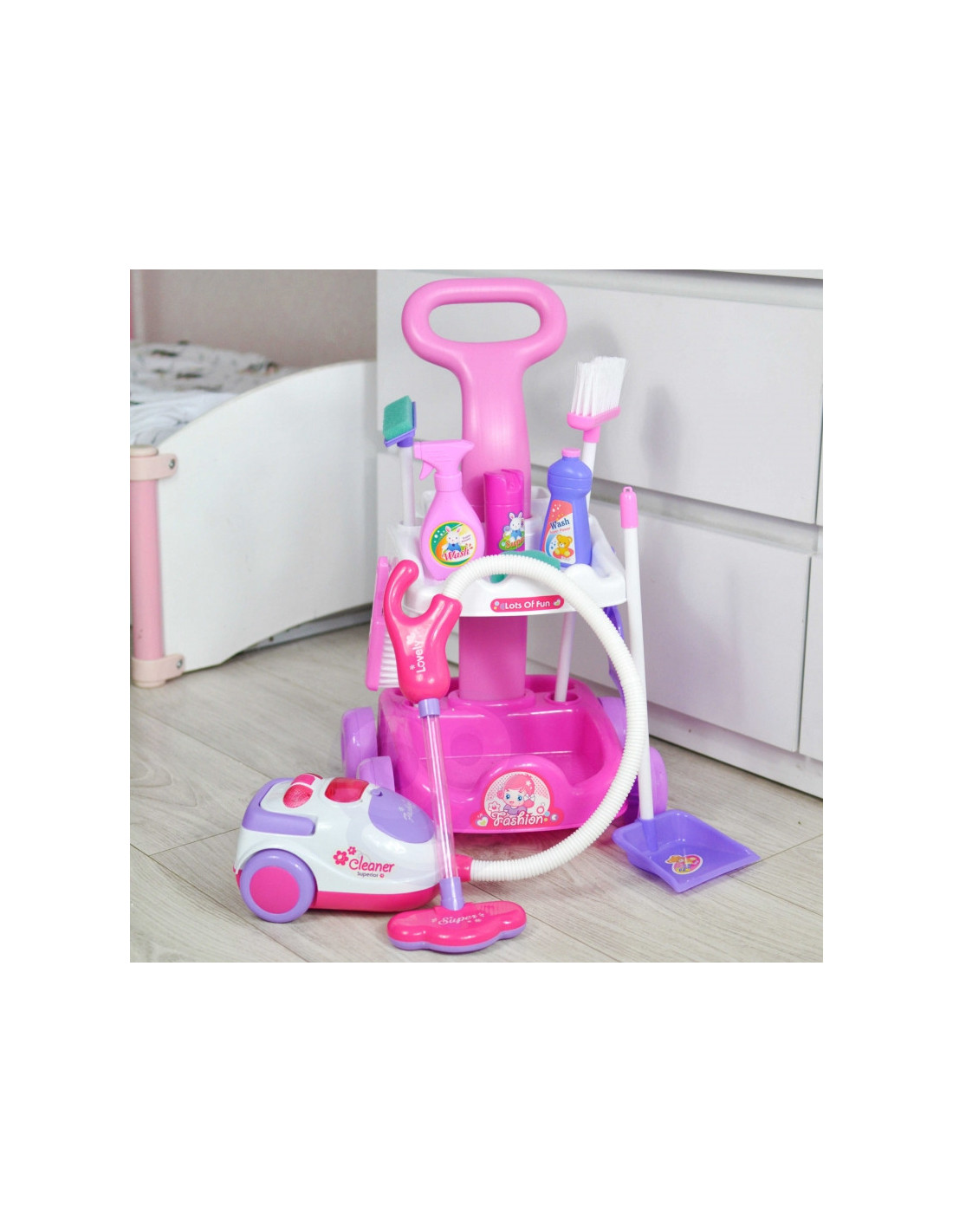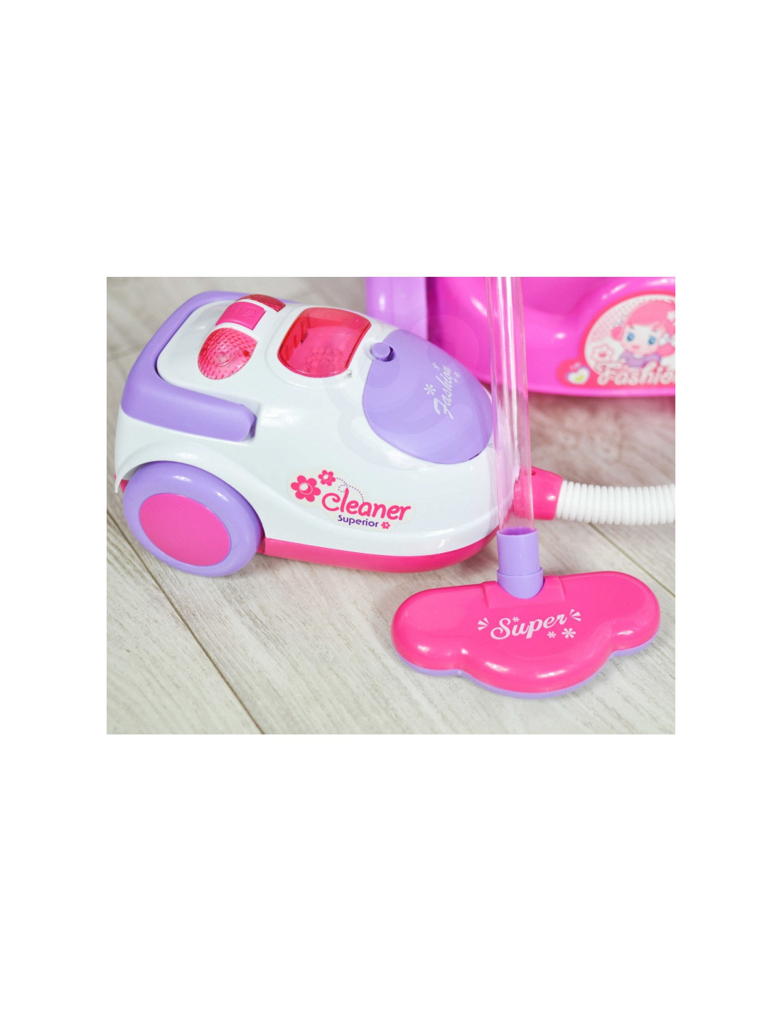Garsaus prekės ženklo „Woopie“ valymo rinkinys – puiki dovana mažai mergaitei. Šis itin profesionalus rinkinys atkartoja tikrus, suaugusiųjų naudojamus valymo įrankius. Rožinė ir balta spalvų vežimėlis aprūpintas papildomais priedais, kad vaikai galėtų padėti tėvams valyti. Dulkių siurblys turi įjungimo/išjungimo jungiklį ir maitinimo indikatoriaus lemputę. Žaidimas su valymu nuo mažens gali būti puikus būdas mokytis apie švarą. Mažyliai mėgsta mėgdžioti suaugusiuosius. Su šiuo rinkiniu tai bus daug lengviau! Savybės: