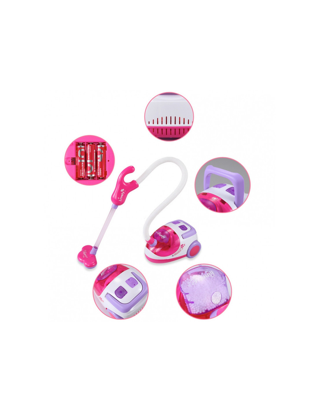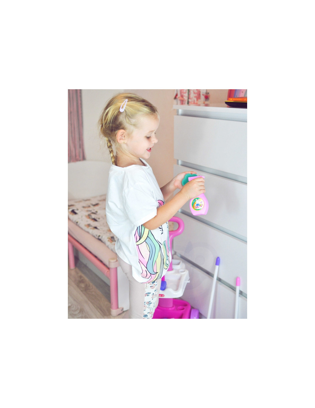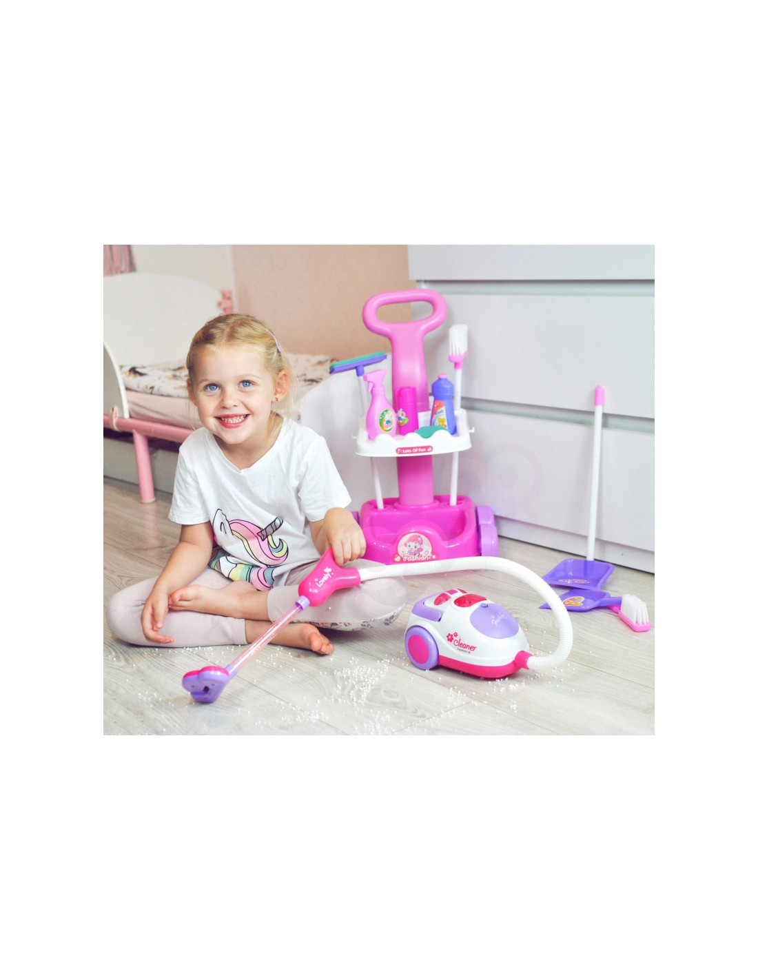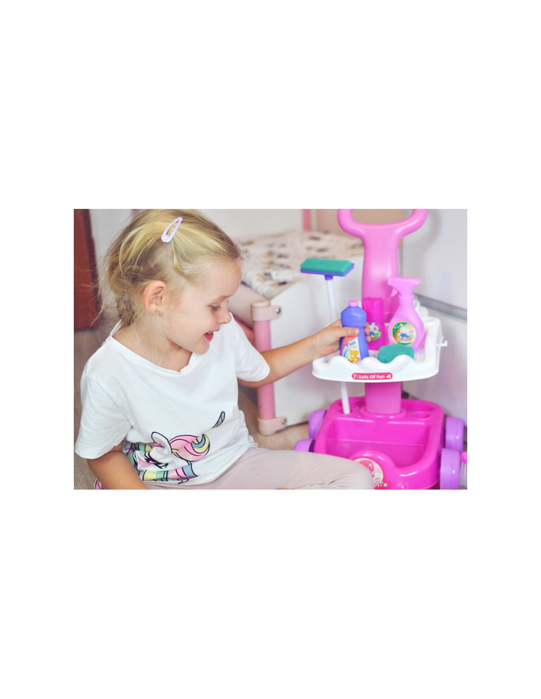 Garsaus prekės ženklo „Woopie“ valymo rinkinys – puiki dovana mažai mergaitei. Šis itin profesionalus rinkinys atkartoja tikrus, suaugusiųjų naudojamus valymo įrankius. Rožinė ir balta spalvų vežimėlis aprūpintas papildomais priedais, kad vaikai galėtų padėti tėvams valyti. Dulkių siurblys turi įjungimo/išjungimo jungiklį ir maitinimo indikatoriaus lemputę. Žaidimas su valymu nuo mažens gali būti puikus būdas mokytis apie švarą. Mažyliai mėgsta mėgdžioti suaugusiuosius. Su šiuo rinkiniu tai bus daug lengviau! Savybės: