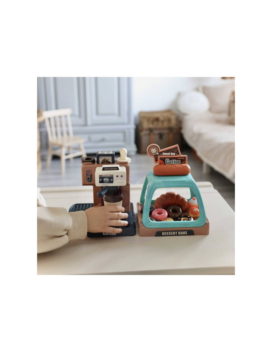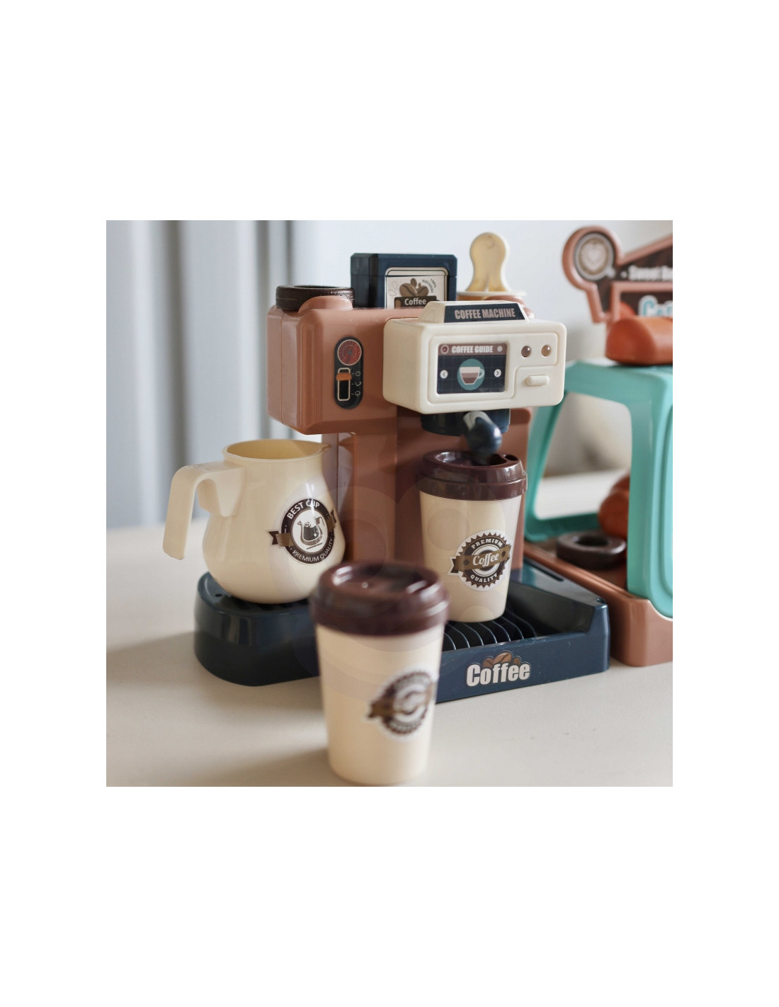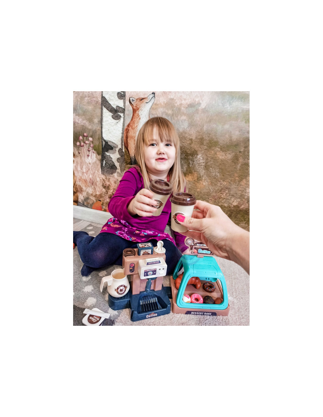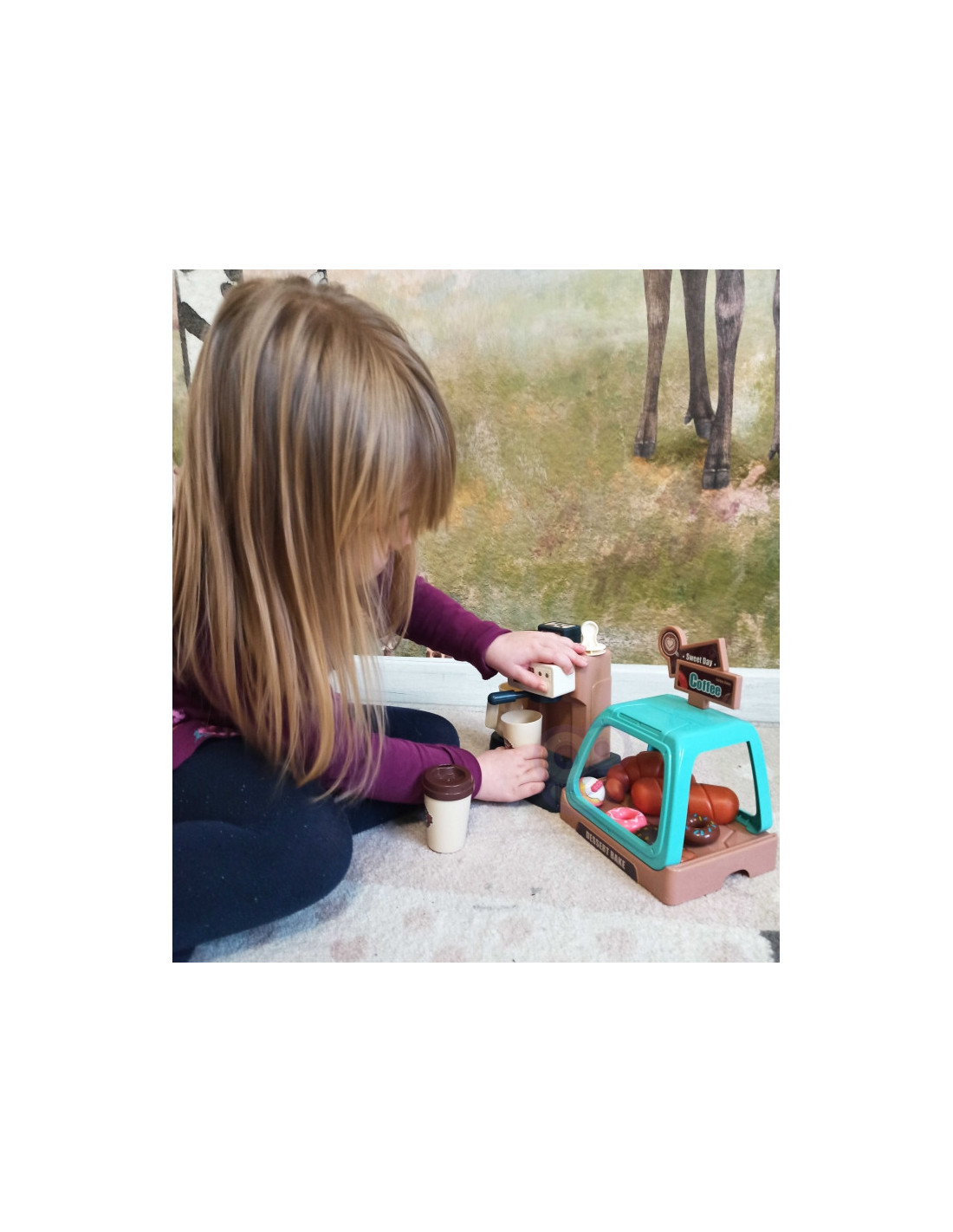 WOOPIE kavos aparatas – puikus rinkinys vaikams, kurie mėgsta apsimesti suaugusiaisiais . Be kavos aparato ir sausainių vitrinos , rinkinyje yra įvairių skonių saldumynų, tokių kaip spurgos ir keksiukai. Kavos aparatą ir vitriną galima sujungti arba naudoti atskirai . Kavos aparatas turi vandens tekėjimo funkciją ; tiesiog įpilkite vandens į indą iš viršaus, pritvirtinkite portafiltrą, padėkite po juo puodelį ir kava paruošta! Jis taip pat skleidžia malimo ir plikymo garsus , užsidega mirksinti raudona lemputė , o kai kava paruošta, užsidega žalia lemputė ir pasigirsta signalas. Pritvirtinus filtro angą, taip pat galite išgirsti pilamos kavos garsą. Šis žaislas tikrai sužavės bet kurį vaiką. Žaidimai parduotuvėje su draugais padės lavinti sąmoningumą ir socialinius įgūdžius.