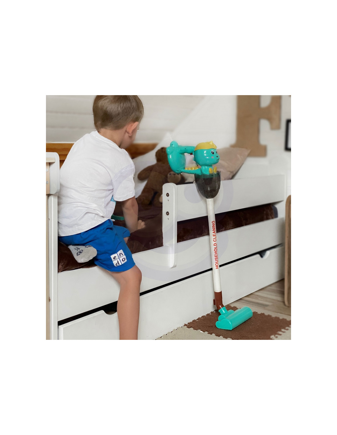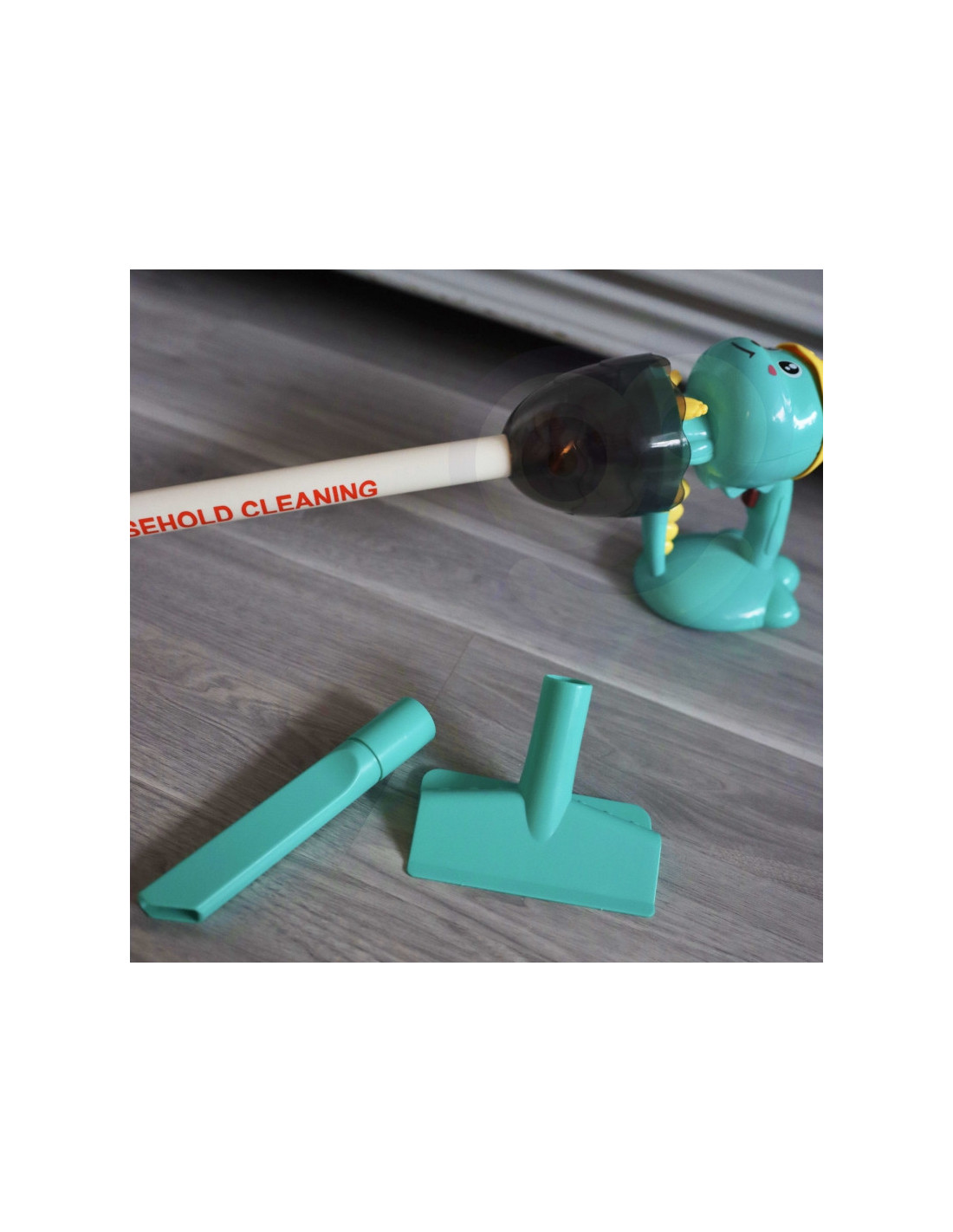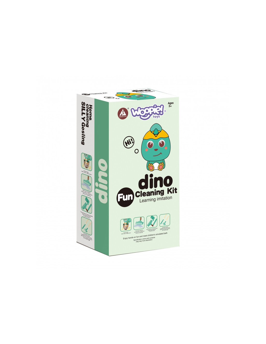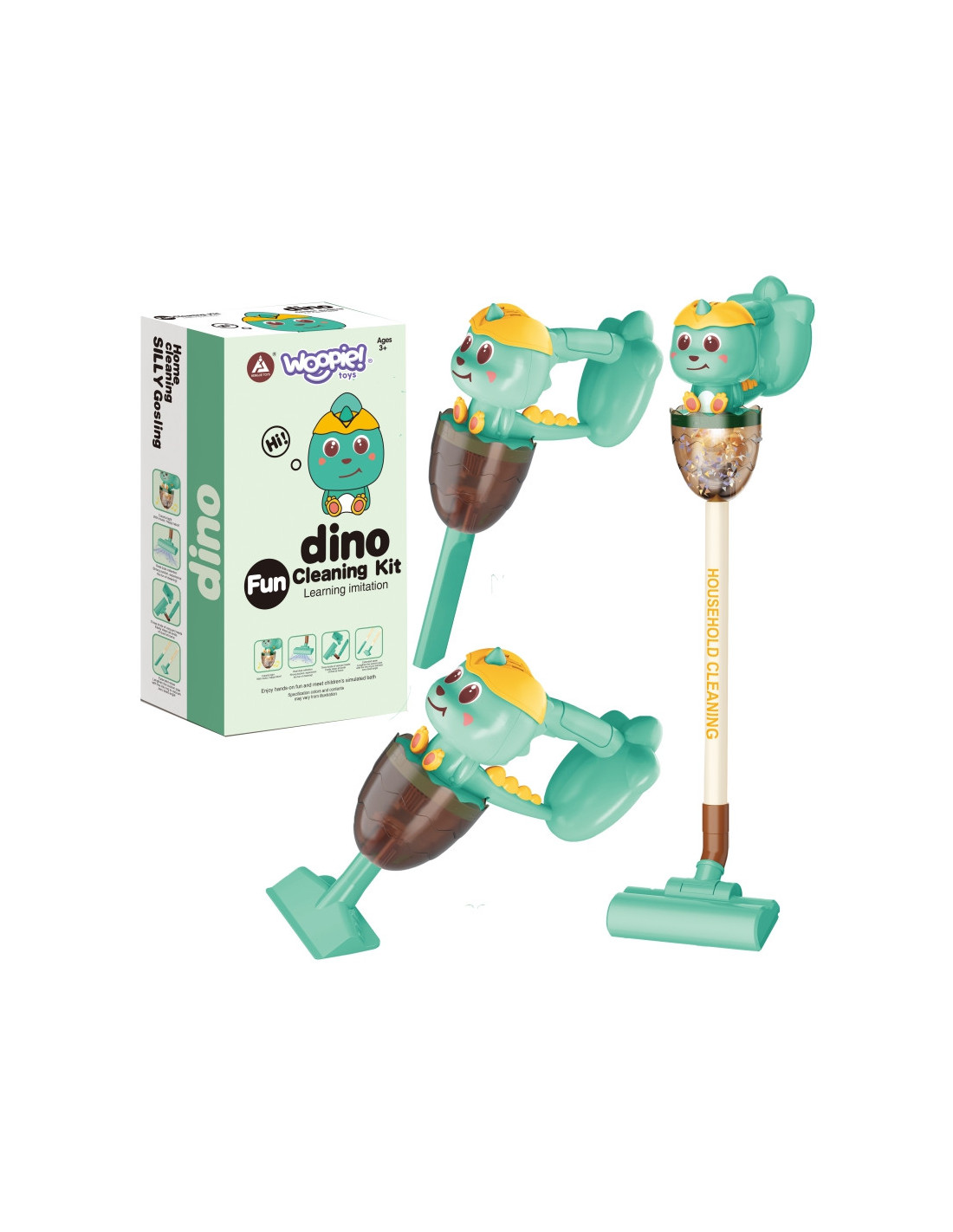 „Woopie“ 3 viename „Dino“ dulkių siurblys – puikus pasirinkimas mažiesiems namų pagalbininkams. Siurbimo funkcija, garsai ir lemputės valymą paverčia dar tikroviškesniu ir įdomesniu. Pirmas spustelėjimas ant rankenos įjungia dulkių siurblį, antrasis – linksmą melodiją, o trečiasis – jį išjungia. Nuimamą dirbtinių šiukšlių konteinerį lengva ištuštinti. „Dino“ dulkių siurblys turi tris šepetėlius, todėl vaikai gali patys naudoti dulkių siurblį trimis režimais. Žaislas pagamintas iš aukštos kokybės, vaikams saugių medžiagų. Dulkių siurblys turi patogią rankeną, todėl vaikai gali jį nešiotis iš vienos vietos į kitą. Tai puiki dovana, padedanti vaikams mėgdžioti savo tėvus – nes kuris vaikas nenorėtų būti suaugęs?