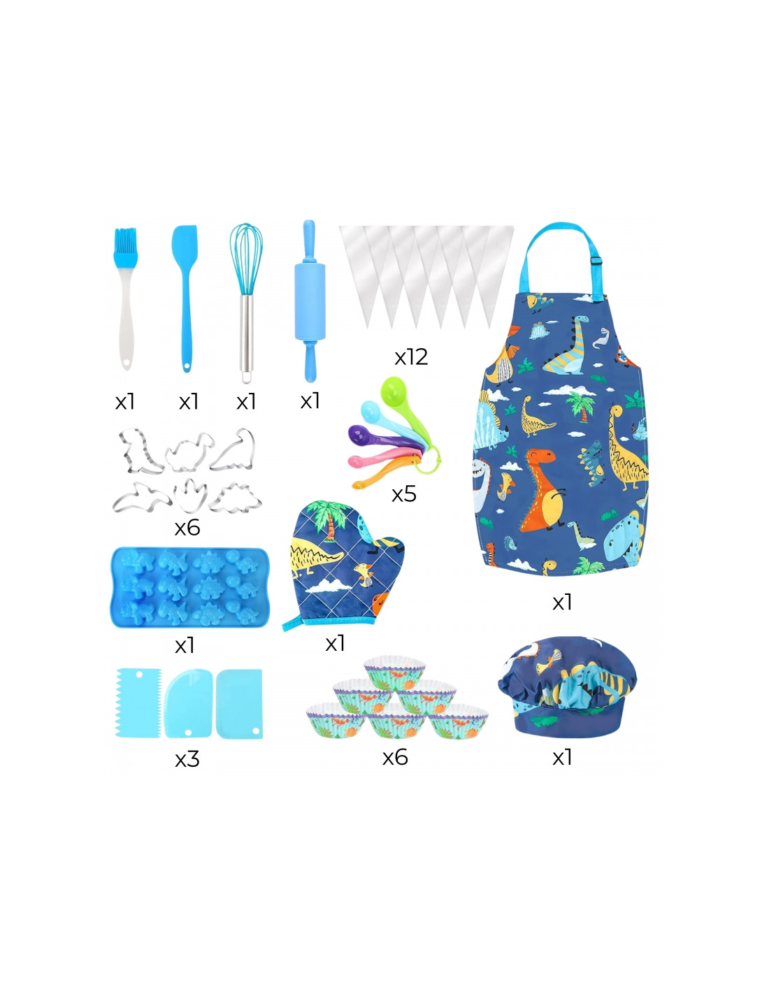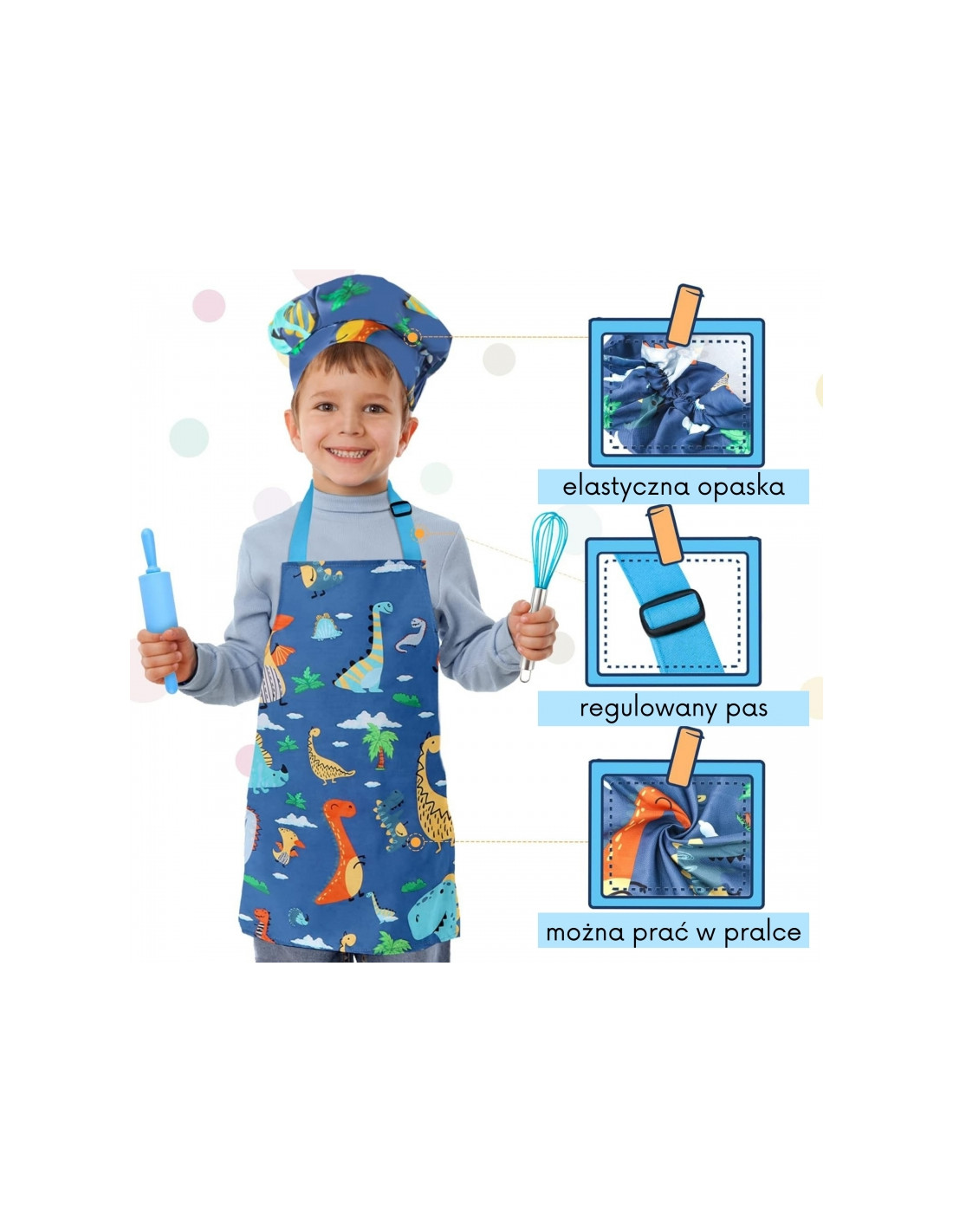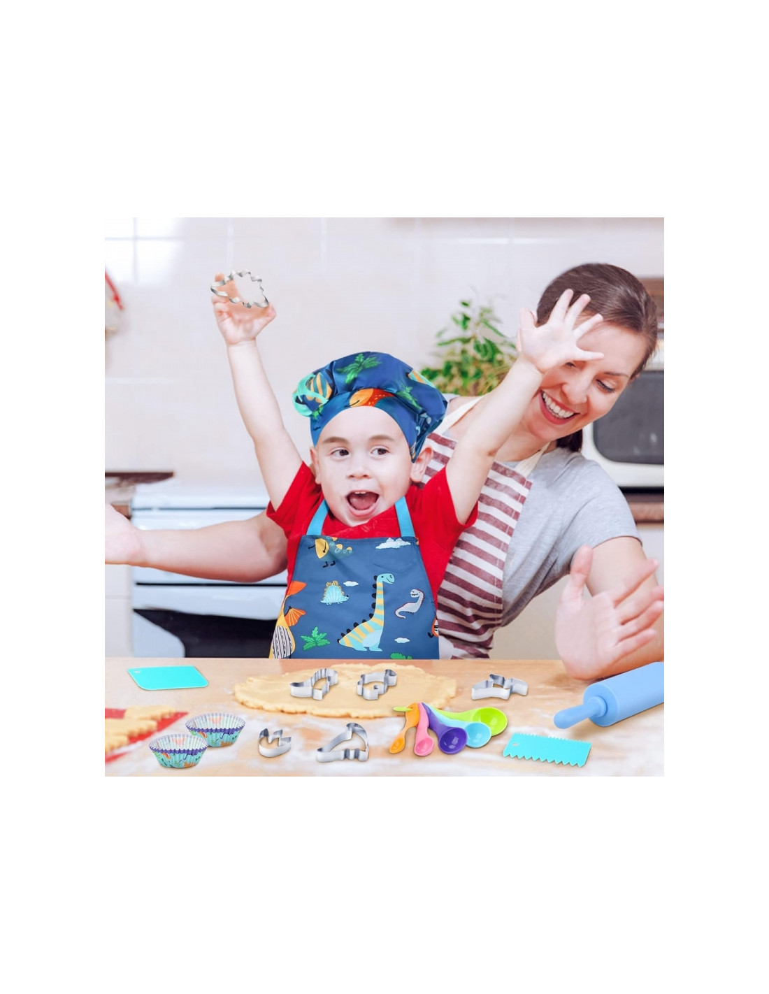 Įneškite linksmybių į virtuvę! WOOPIE Dino Little Chef rinkinys yra spalvingas virtuvės reikmenų rinkinys vaikams, kuriame mokymasis derinamas su kulinarinėmis pramogomis. Miela prijuostė ir skrybėlė su dinozauro motyvu, saugūs įrankiai ir silikoninės formos skatina gaminti maistą kartu. Reguliuojami dirželiai, minkšta medžiaga ir lengvi indai daro rinkinį patogų ir tinkamą mažoms rankutėms.