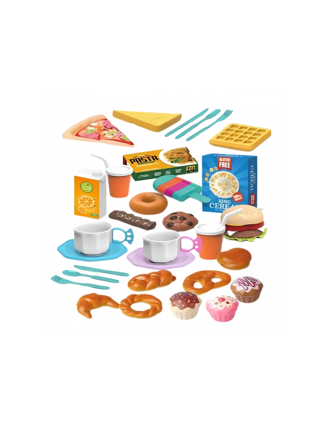 - Sudėtyje yra saldumynų imitacijų, desertų, pusryčių reikmenų ir arbatos/kavos rinkinys