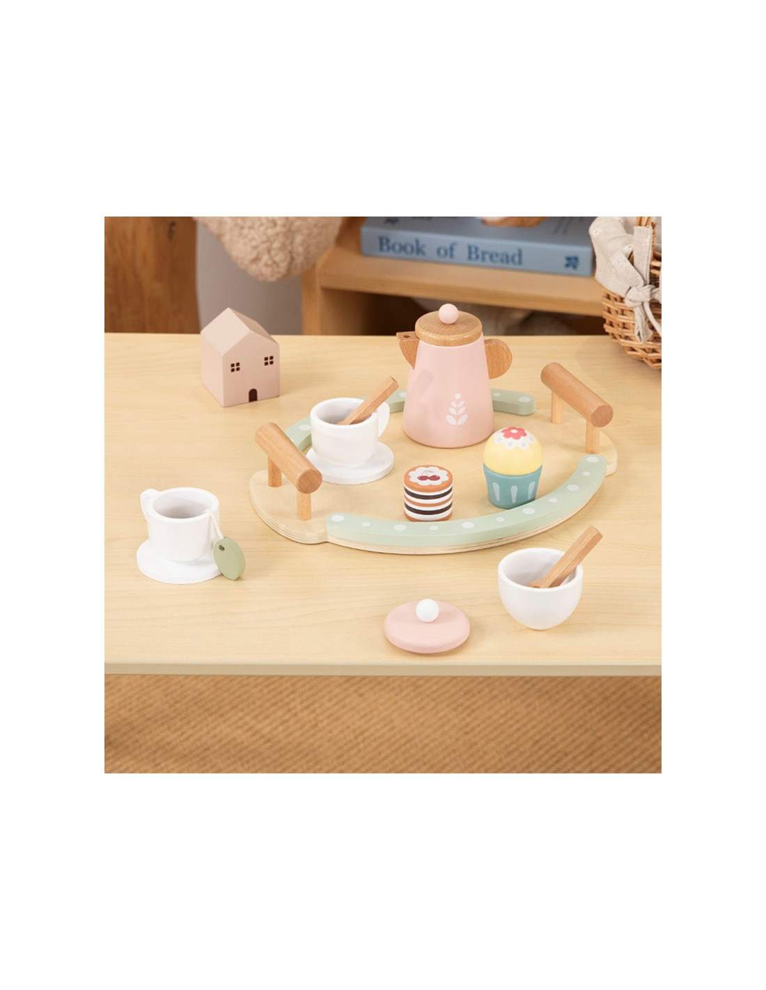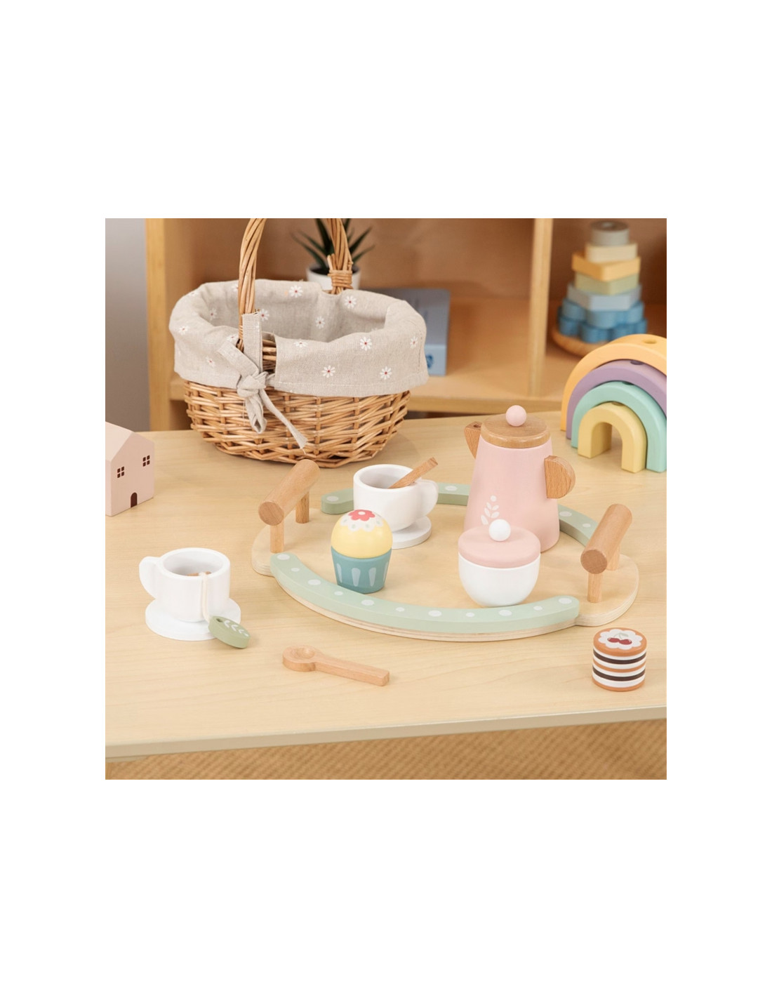 Kviečiame jus popietės arbatos! Šis žavus medinis arbatos rinkinys iš Woopie Green“ yra tikras vaidmenų žaidimų perlas. Pastelinės rožinės, švelniai žalios ir natūralios medienos spalvos pavers kiekvieną žaidimo patirtį elegantiška arbatos ceremonija. Vaikai gali atlikti šeimininko vaidmenį, patiekdami aromatingą arbatą iš gražaus arbatinuko, skanius keksiukus ir išskirtinius sausainius savo svečiams – tėvams, broliams ir seserims ar mėgstamiausiems pliušiniams žaislams. Pagamintas iš aukštos kokybės medienos su saugia, netoksiška apdaila, rinkinys garantuoja ilgalaikį, išradingą žaidimą.
