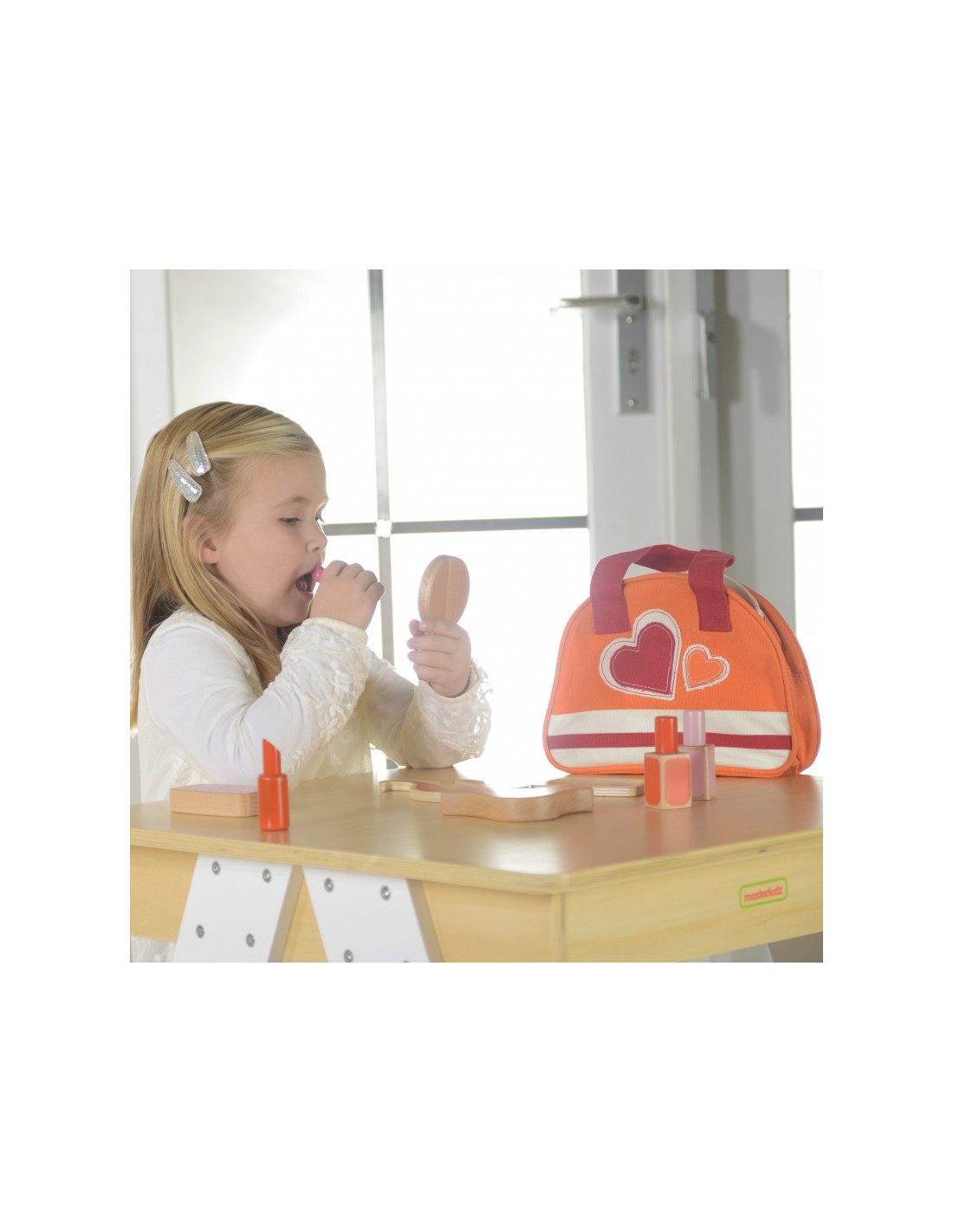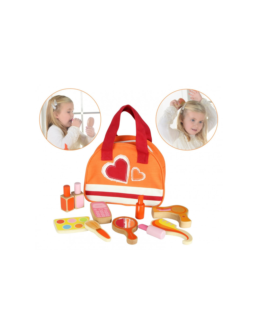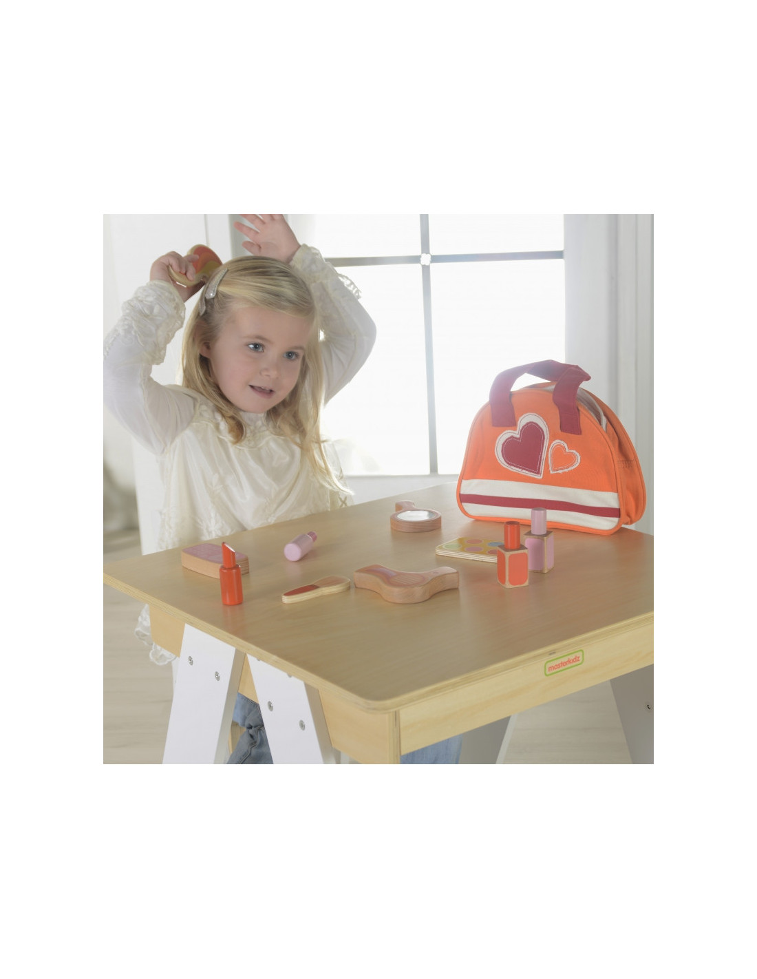 Žavus medinių rekvizitų rinkinys, kuris leis mažai mergaitei apsimesti, kad formuoja plaukus, lakuoja nagus ir tepasi veido dažus. Ji gali pasiimti savo kosmetiką visur, kur eina, dėka pridėto medžiaginio maišelio .