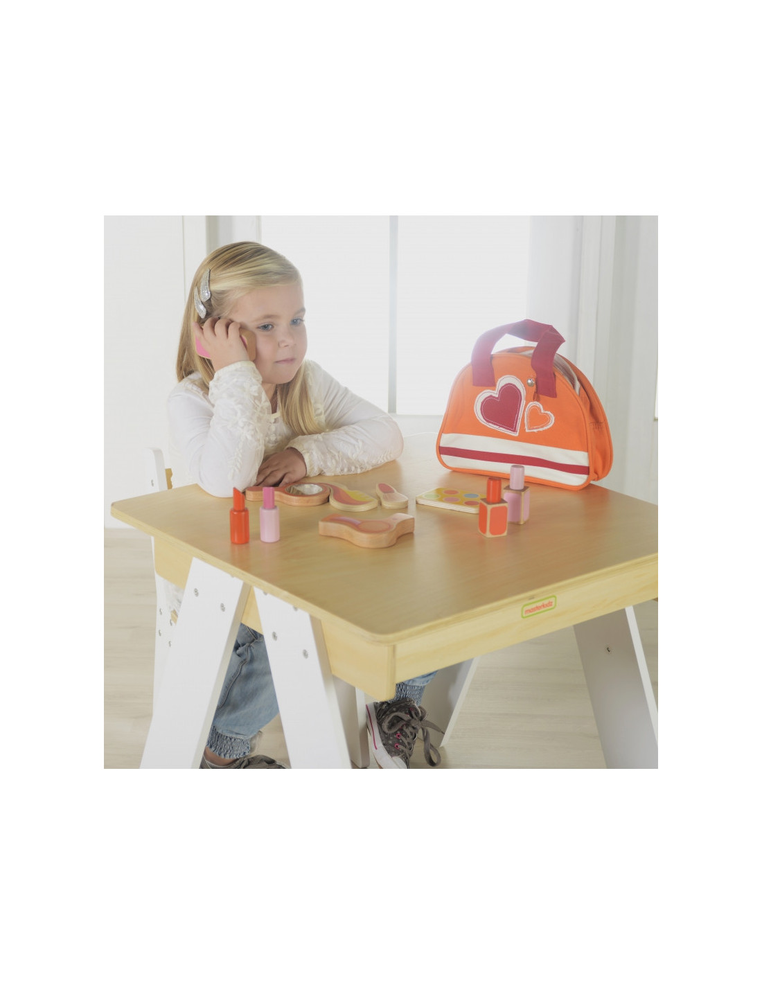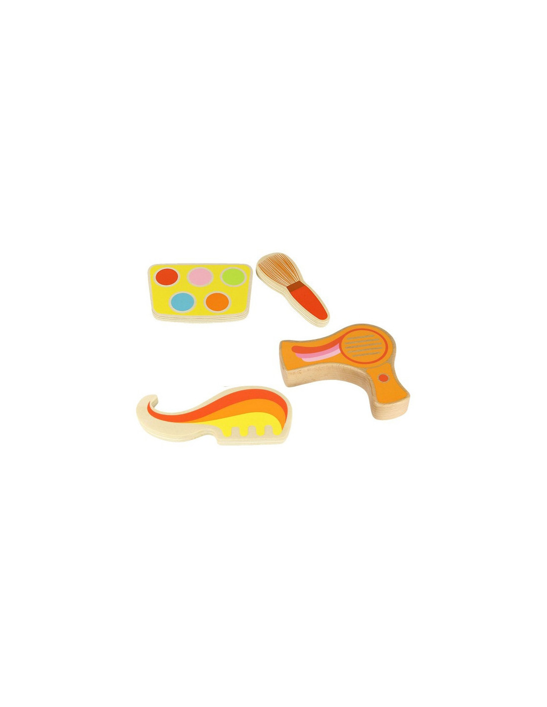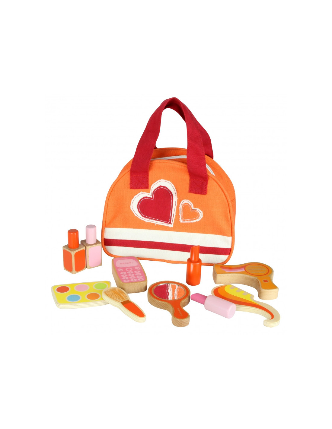 Žavus medinių rekvizitų rinkinys, kuris leis mažai mergaitei apsimesti, kad formuoja plaukus, lakuoja nagus ir tepasi veido dažus. Ji gali pasiimti savo kosmetiką visur, kur eina, dėka pridėto medžiaginio maišelio .