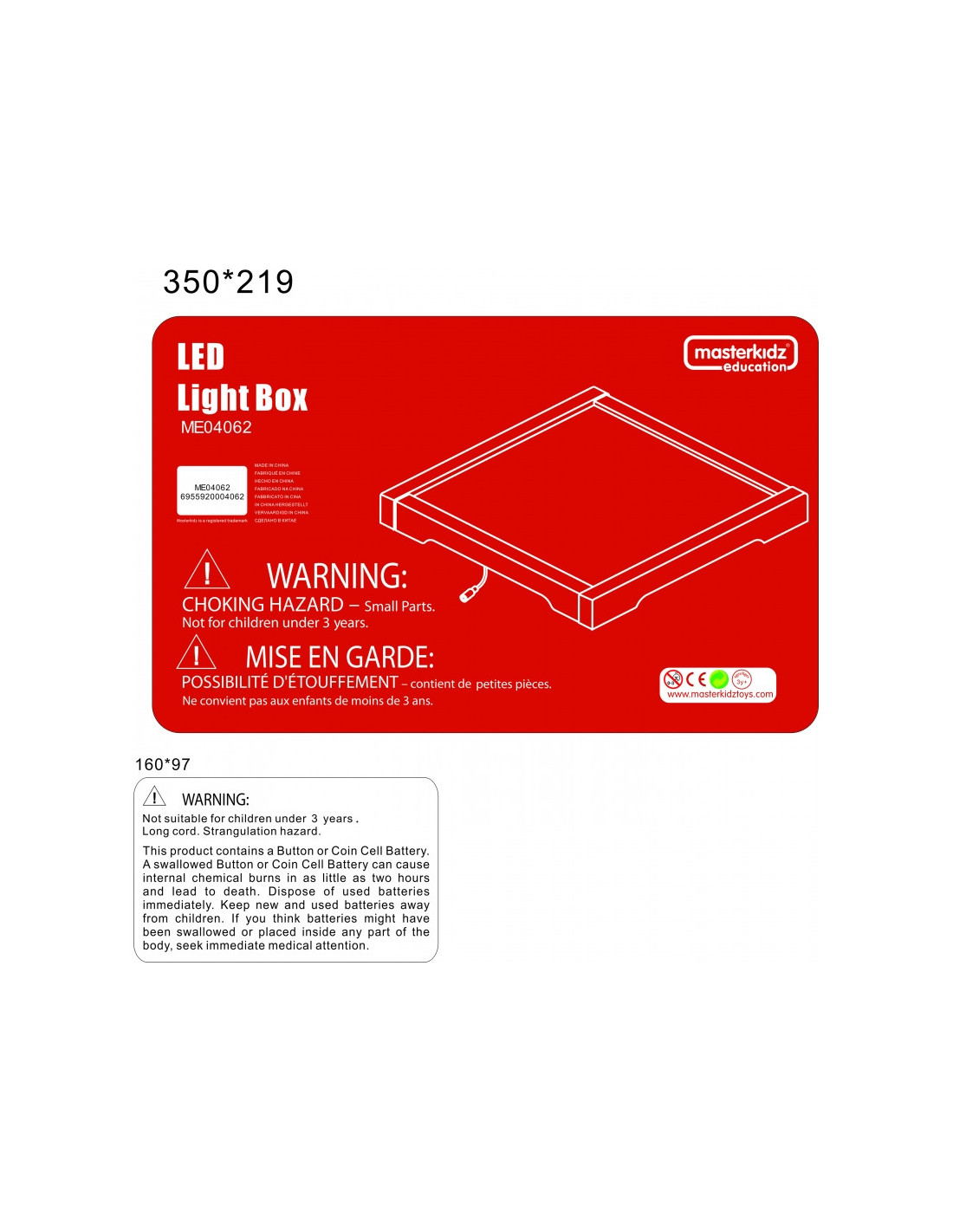 MASTERKIDZ LED sensorinė dėžutė . Tvirta medinė LED dėžutė su balta šviesa iš žinomos Masterkidz kompanijos. Ji leidžia užsiimti įvairiomis kūrybiškumą skatinančiomis veiklomis, pavyzdžiui, maišyti spalvas ir mokytis kitų STEM dalykų. Gražius efektus galima sukurti, kai šviesa šviečia per įvairias medžiagas, tokias kaip lapai, popierius, smėlio dėžė ir kt. Jis puikiai dera su Masterkidz kvadratine smėlio dėže arba Masterkidz skaidraus vandens dėže.