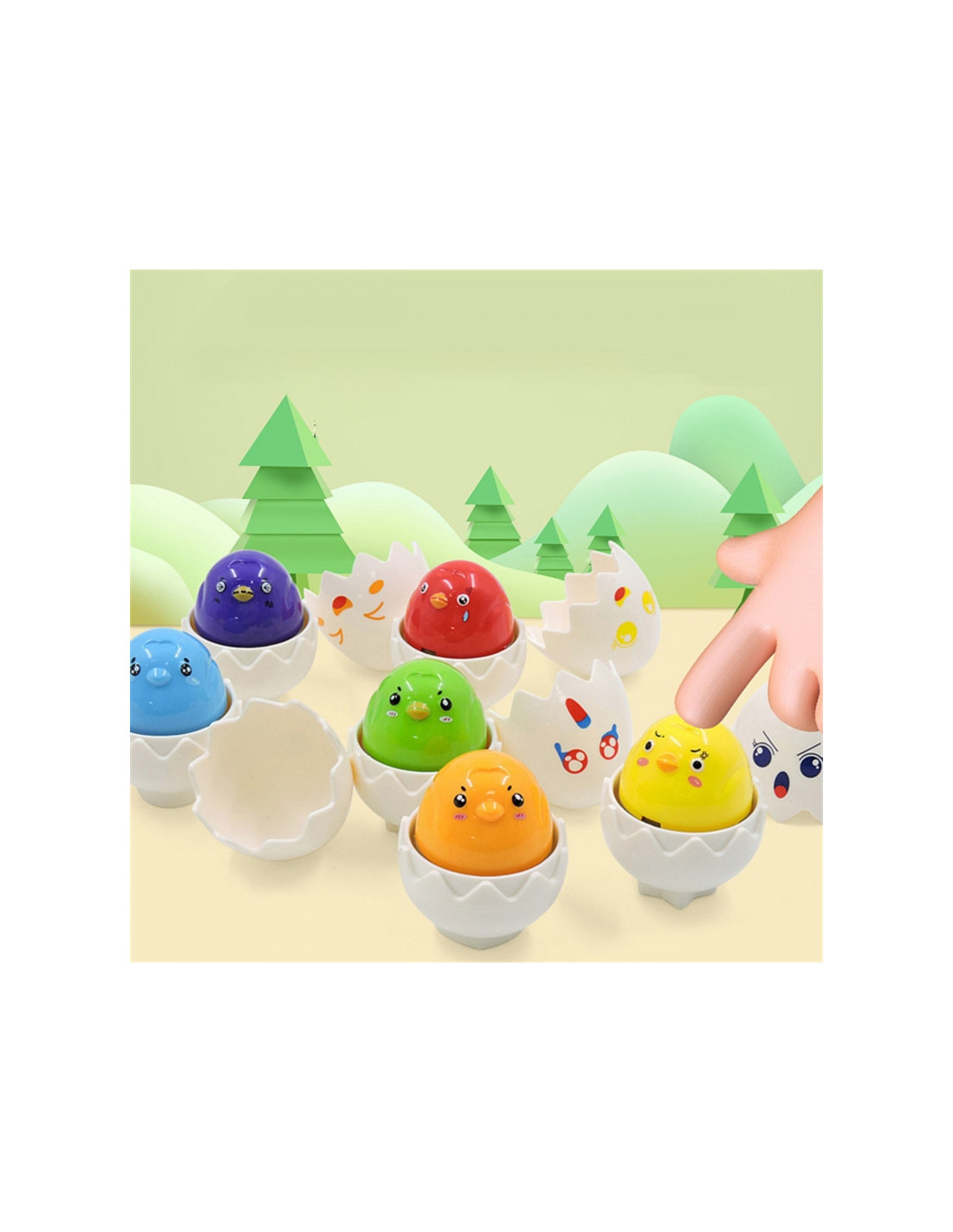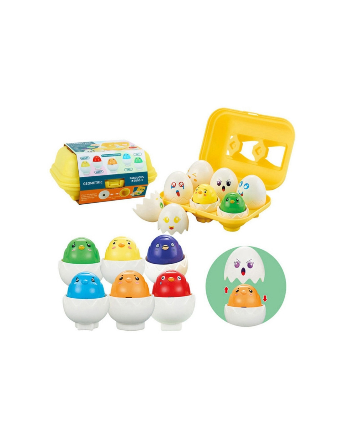 - - Kiaušiniai yra skirtingų geometrinių formų , kurias reikia įstatyti į atitinkamas skylutes kiaušinių dėžutėje.