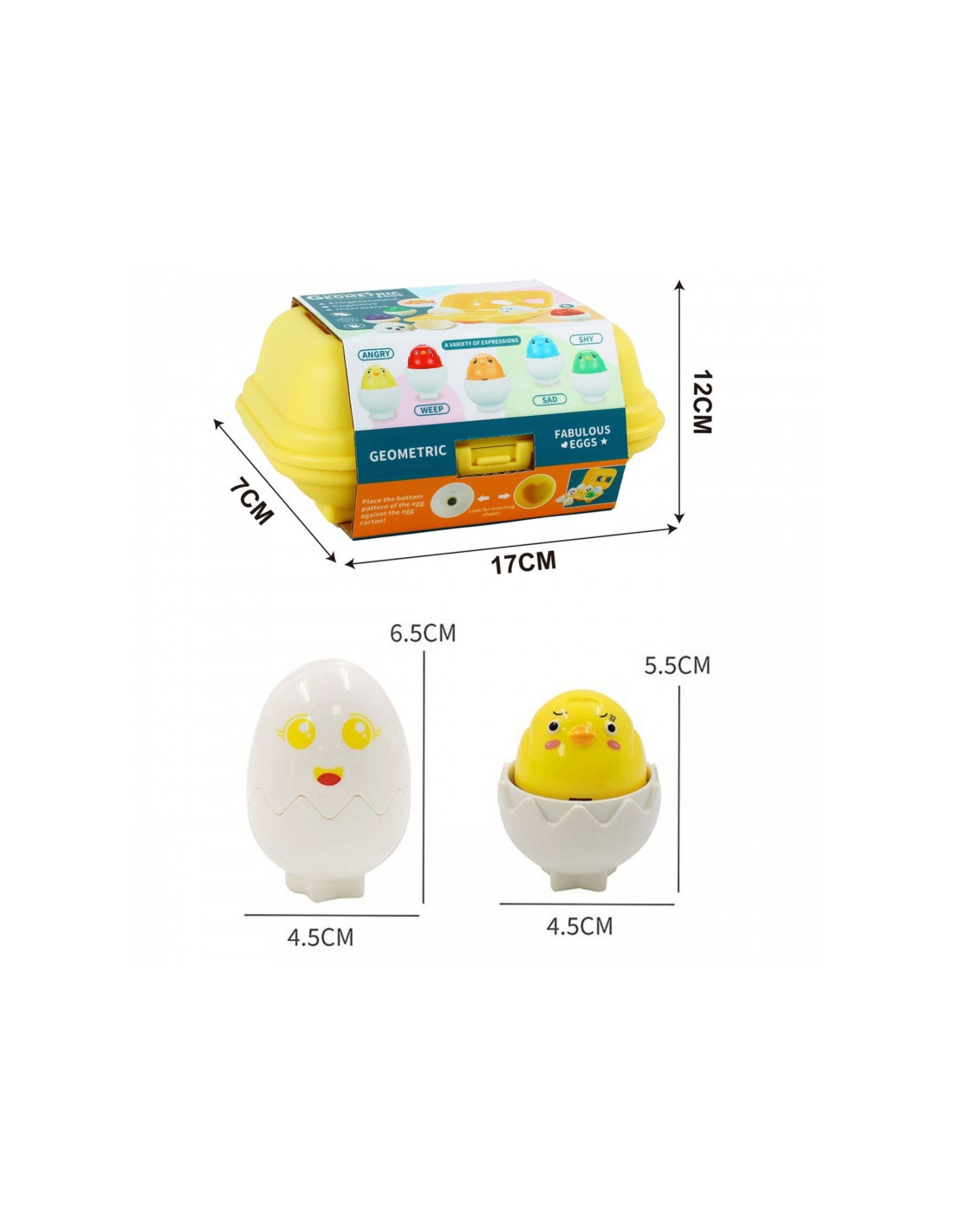 Balti lavinamieji kiaušiniai su spalvingais lipdukais iš Woopie prekės ženklo supažindins jūsų vaiką su spalvų, formų ir juokingų išraiškų pasauliu . Kiekviename iš šešių žavingų kiaušinių yra spalvingas viščiukas su skirtinga, juokinga išraiška. Paspaudus jį, pasigirs garso efektas. Jūsų mažylio užduotis – ne tik priderinti tinkamą lukštą prie kiaušinio, bet ir įstatyti jį į tinkamą angą kiaušinių dėžutėje . Kiekvienas kiaušinis apačioje turi unikalią geometrinę formą, atitinkančią skylutę dėžutėje. Šie juokingi išraiškos yra puikus būdas išmokyti vaikus atpažinti ir įvardyti emocijas. Jie padeda jiems lengvai ir maloniai suprasti, kaip atrodo skirtingi uczucia.To ir ką jie reiškia. Tai puikus būdas lavinti loginį mąstymą ir koordinacijos įgūdžius!