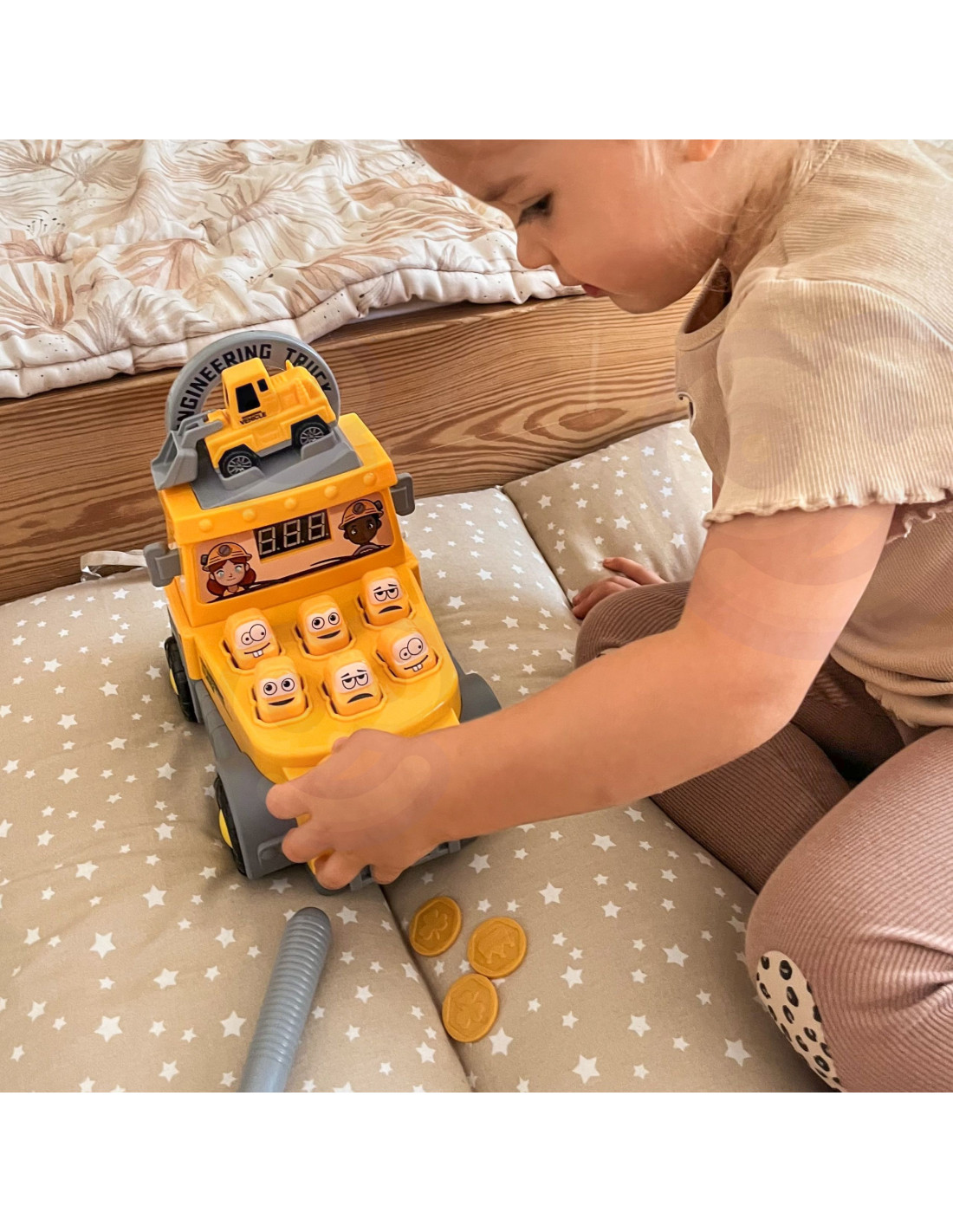 „ Woopie 2-in-1“ statybinis sunkvežimis yra unikalus žaislas, kuris suteiks vaikams valandų valandas kūrybingų, aktyvių ir įdomių pramogų. Jame derinamas dinamiškas arkadinis žaidimas „Whack-a-Mole“ su klasikiniu automobiliu. Tiesiog įkiškite monetą, paimkite minkštą plaktuką ir rinkite taškus mušdami „kurmių“ figūrėles mažų geltonų automobilių pavidalu! Spalvingas dizainas, patvari konstrukcija ir daugiafunkciškumas daro šį žaislą tikrai patrauklų kiekvieno mažojo ugniagesio dėmesį.