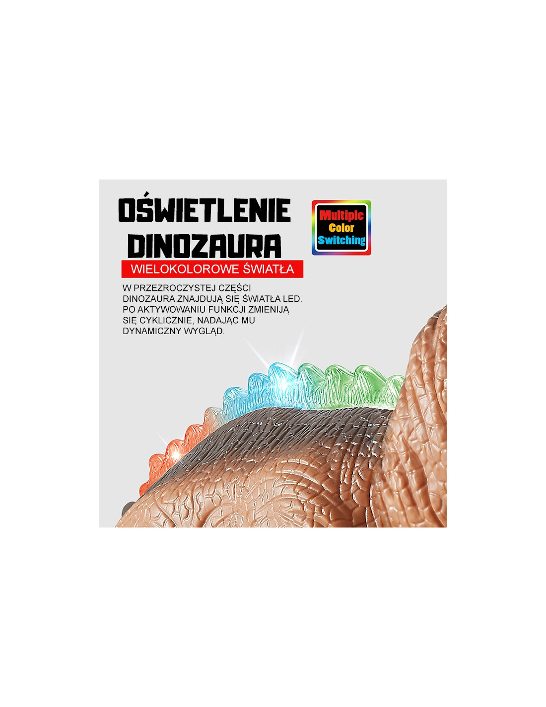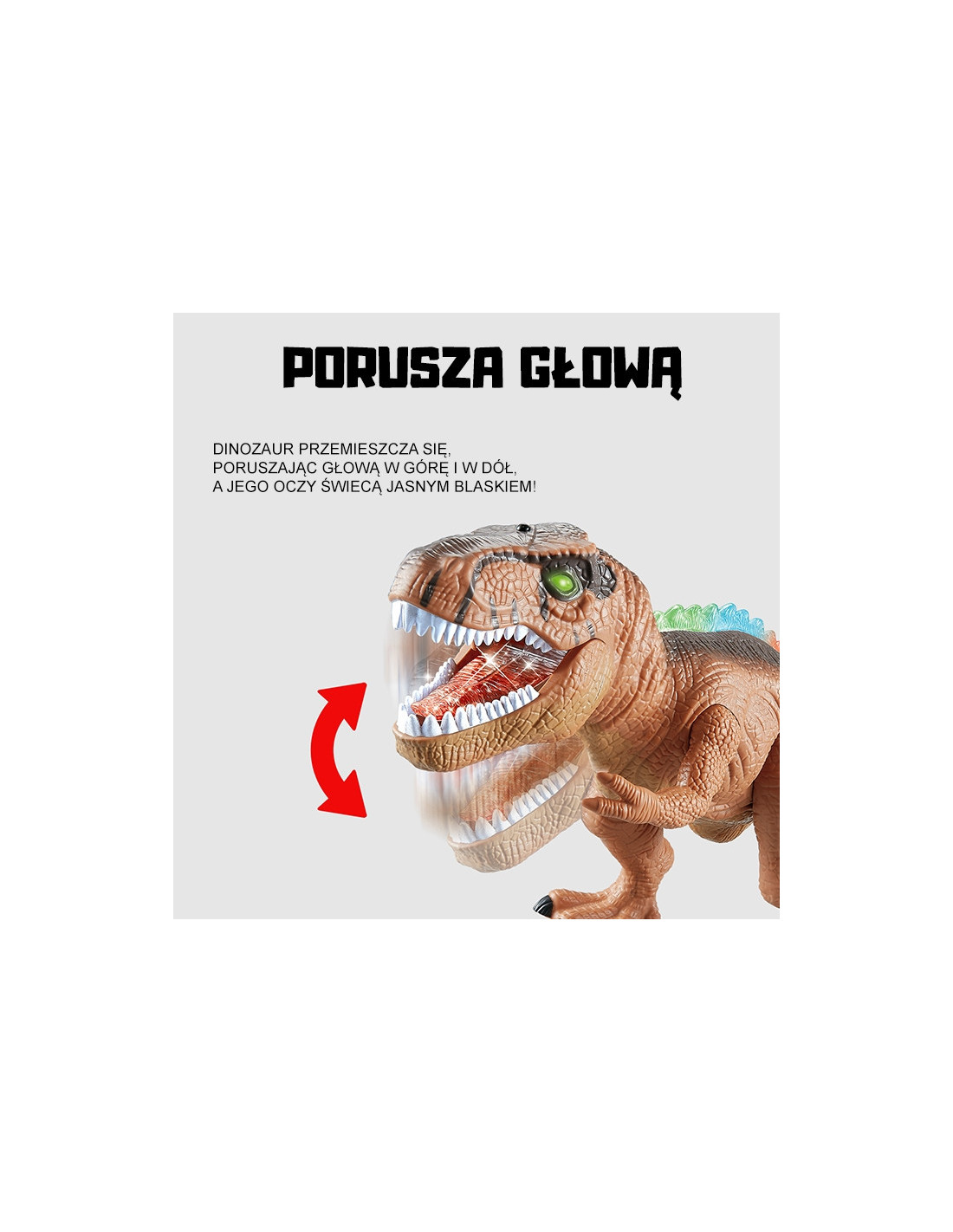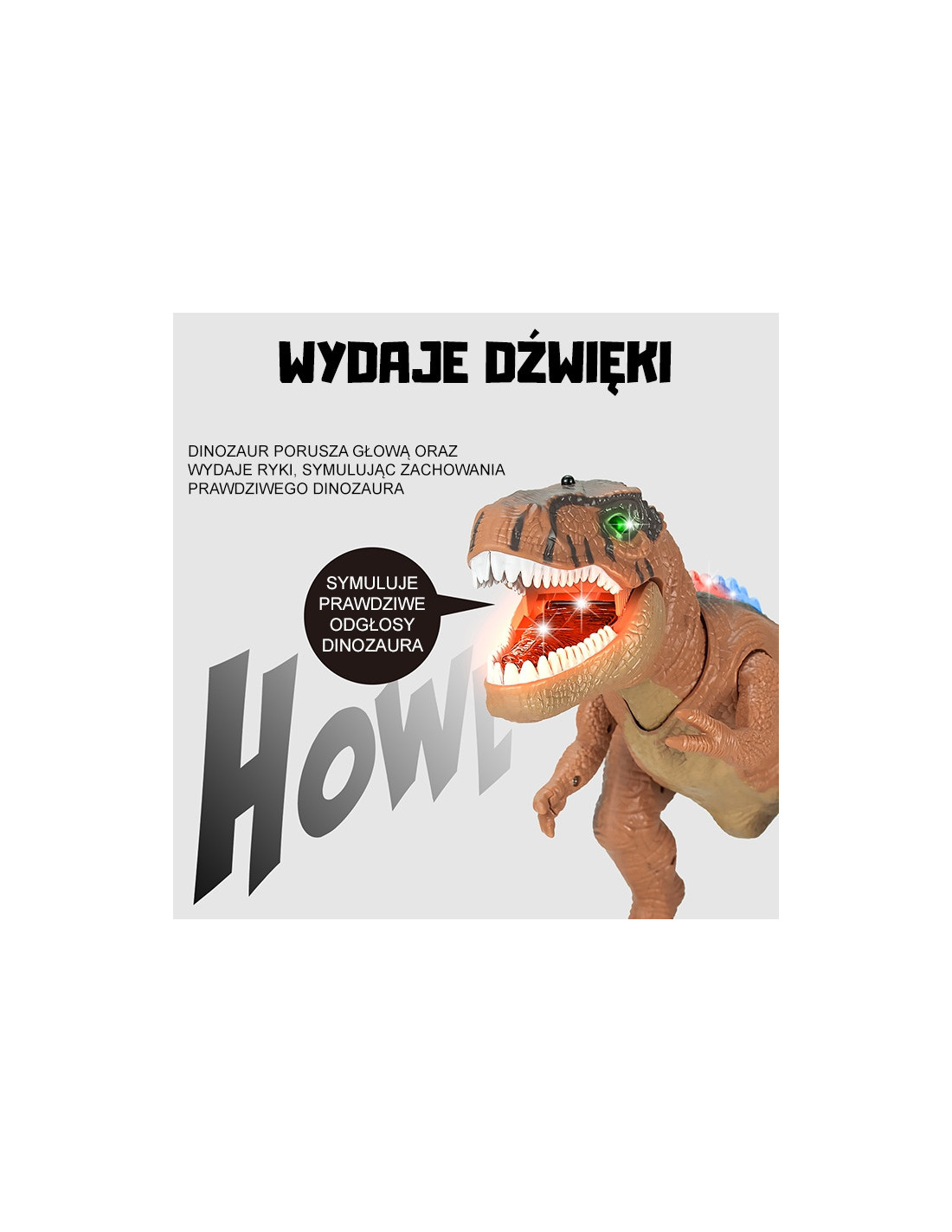- - Apšviestos akys, nugara ir liežuvis suteikia realizmo ir pabrėžia grėsmingą tiranozauro išvaizdą