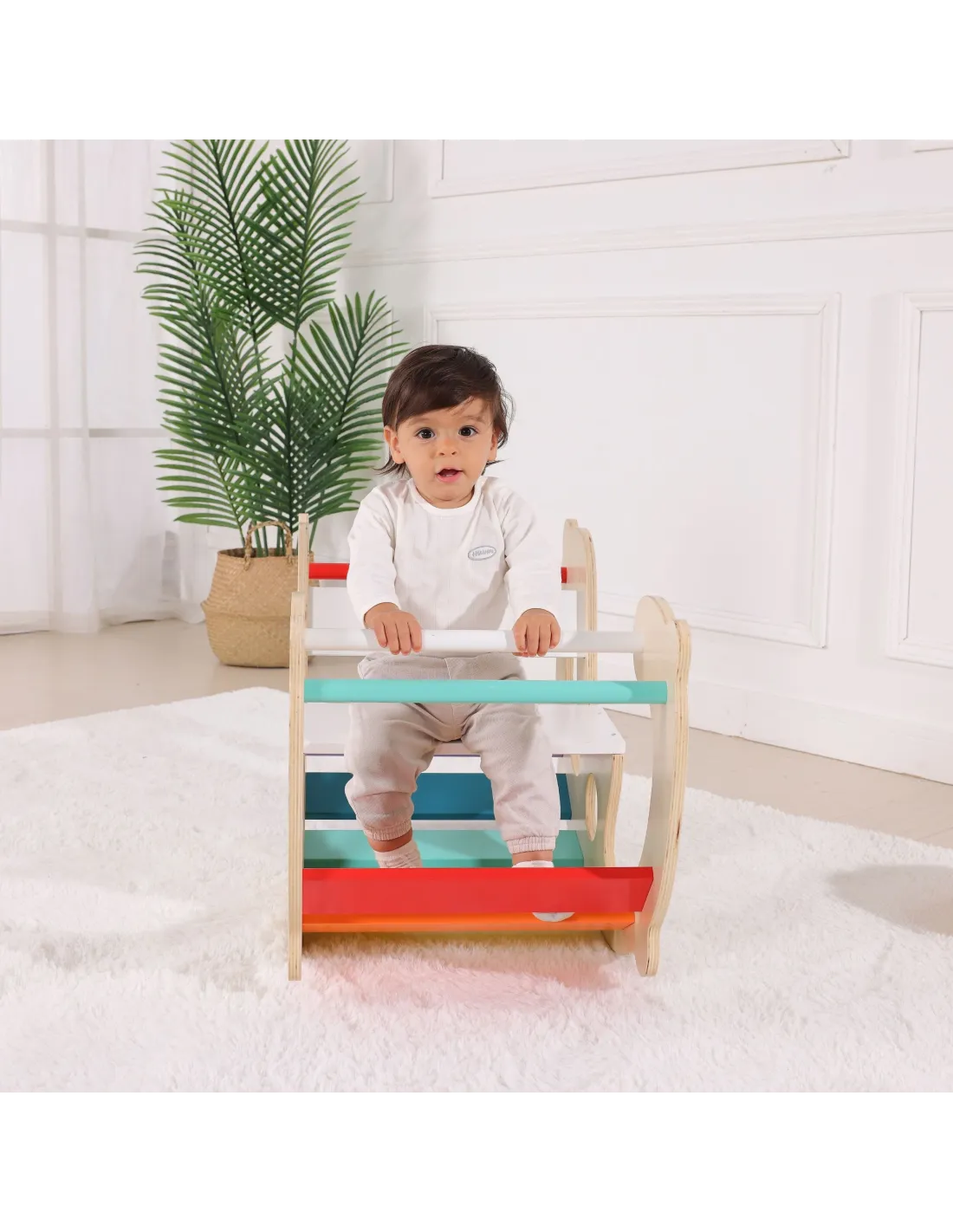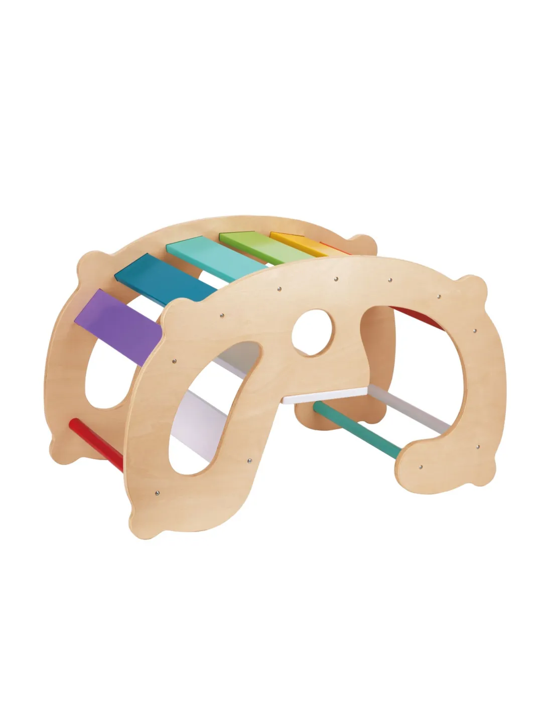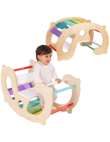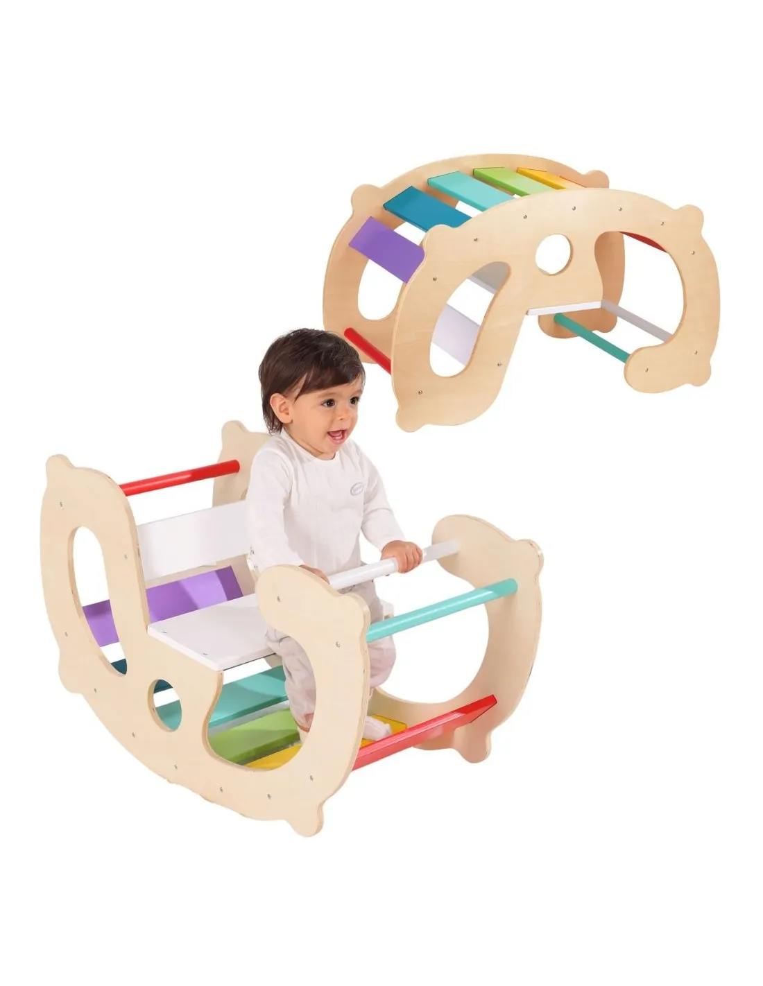 Šis daugiafunkcinis medinis supynės-sūpynės žaislas iš „Woopie Green“ yra vienas iš populiariausių Montessori metodika grindžiamų ugdymo priemonių! Dėl savo paprastos, išlenktos konstrukcijos ir spalvingų, vaivorykštės spalvų plytelių, tai puiki priemonė vaikų fiziniams įgūdžiams ir vaizduotei ugdyti. Jį galima naudoti kaip sūpynę, balansavimo tiltą, tunelį ar netgi sėdynę ar žaidimų stalą. Natūralus medis, derinamas su ryškiomis spalvomis, sukuria saugią erdvę, kurioje maži vaikai gali laisvai eksperimentuoti su judesiais, tyrinėti savo kūno ribas ir ugdyti pasitikėjimą savimi.