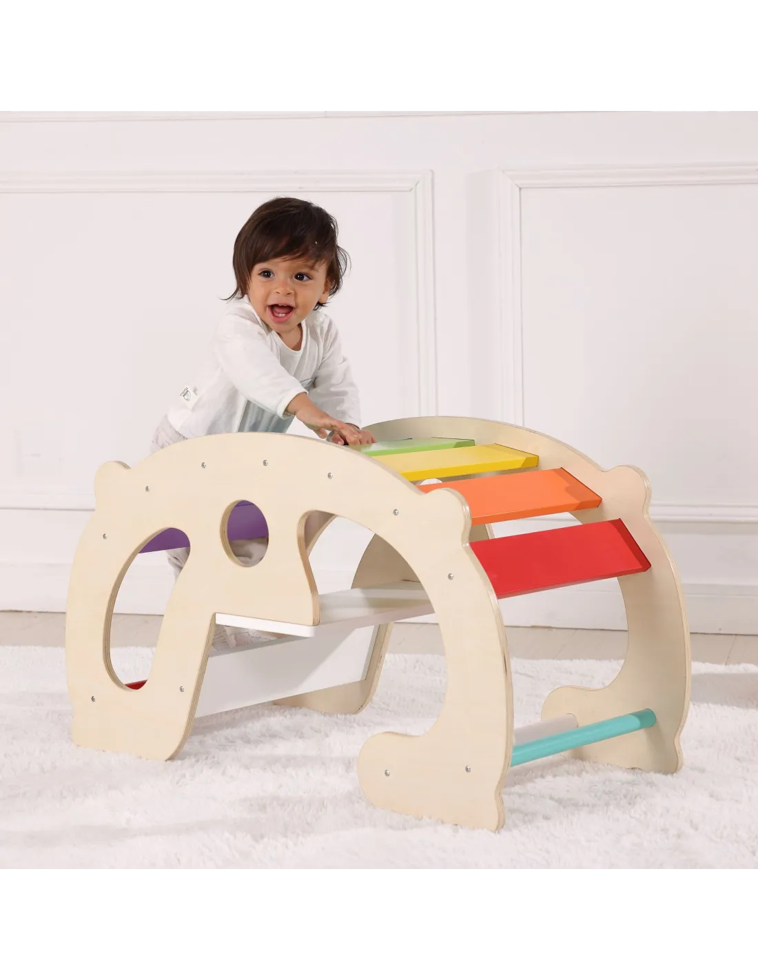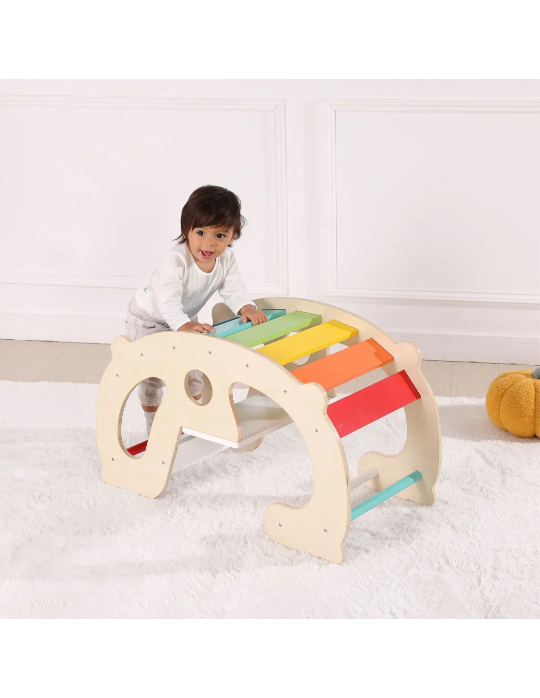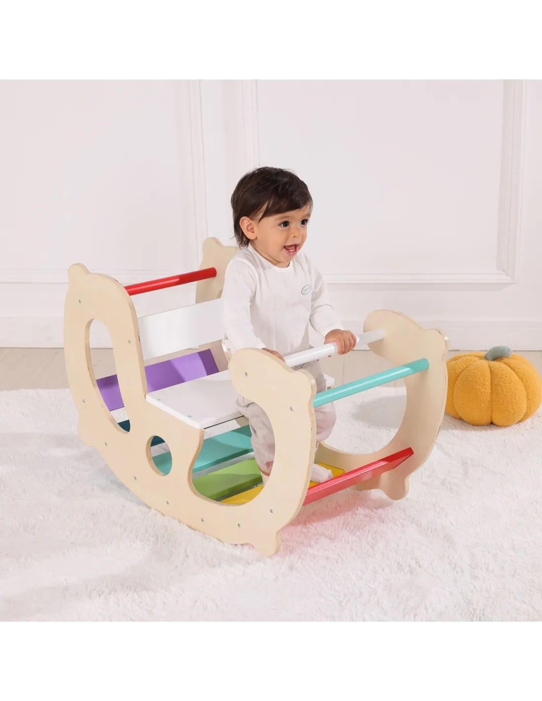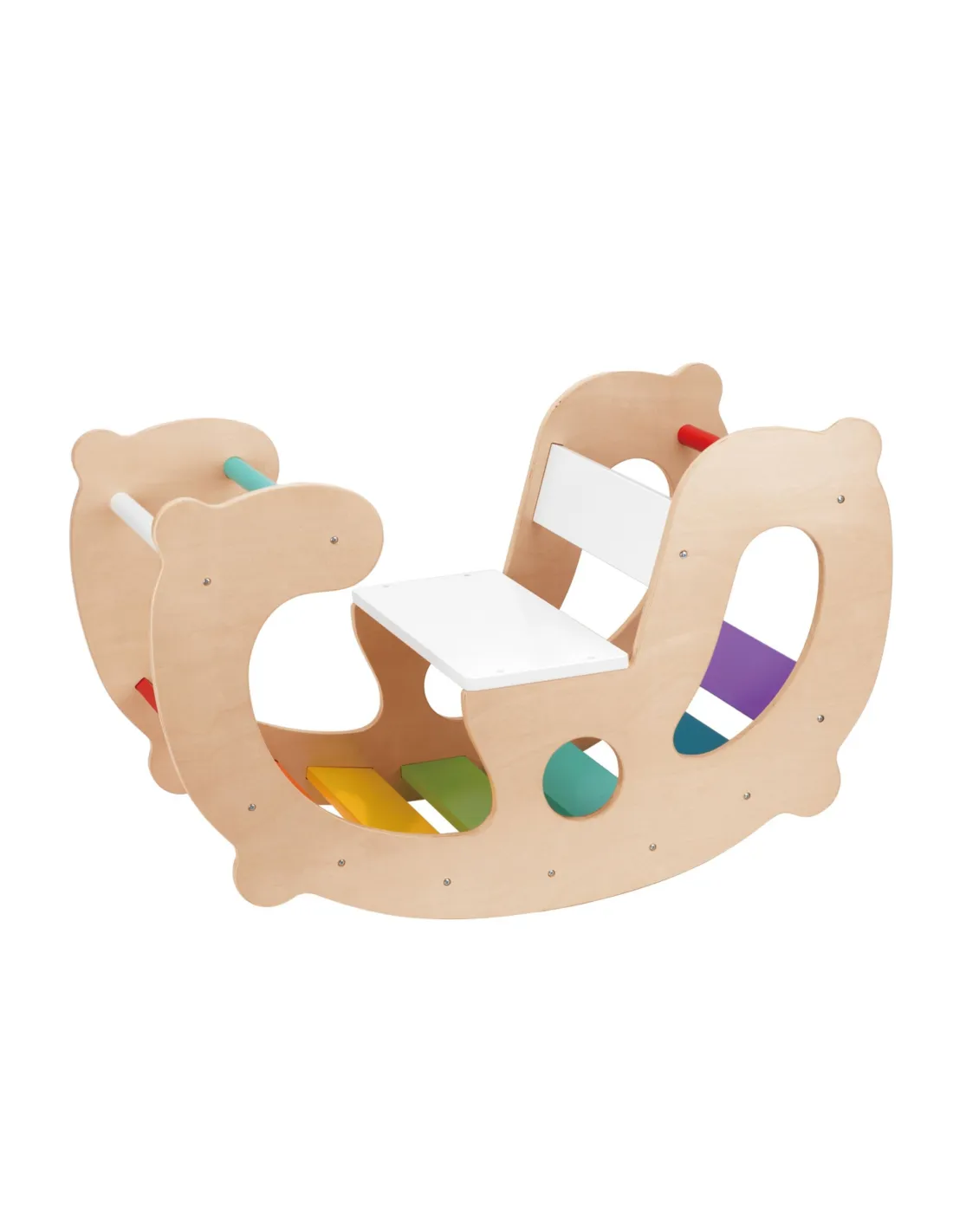 Šis daugiafunkcinis medinis supynės-sūpynės žaislas iš „Woopie Green“ yra vienas iš populiariausių Montessori metodika grindžiamų ugdymo priemonių! Dėl savo paprastos, išlenktos konstrukcijos ir spalvingų, vaivorykštės spalvų plytelių, tai puiki priemonė vaikų fiziniams įgūdžiams ir vaizduotei ugdyti. Jį galima naudoti kaip sūpynę, balansavimo tiltą, tunelį ar netgi sėdynę ar žaidimų stalą. Natūralus medis, derinamas su ryškiomis spalvomis, sukuria saugią erdvę, kurioje maži vaikai gali laisvai eksperimentuoti su judesiais, tyrinėti savo kūno ribas ir ugdyti pasitikėjimą savimi.