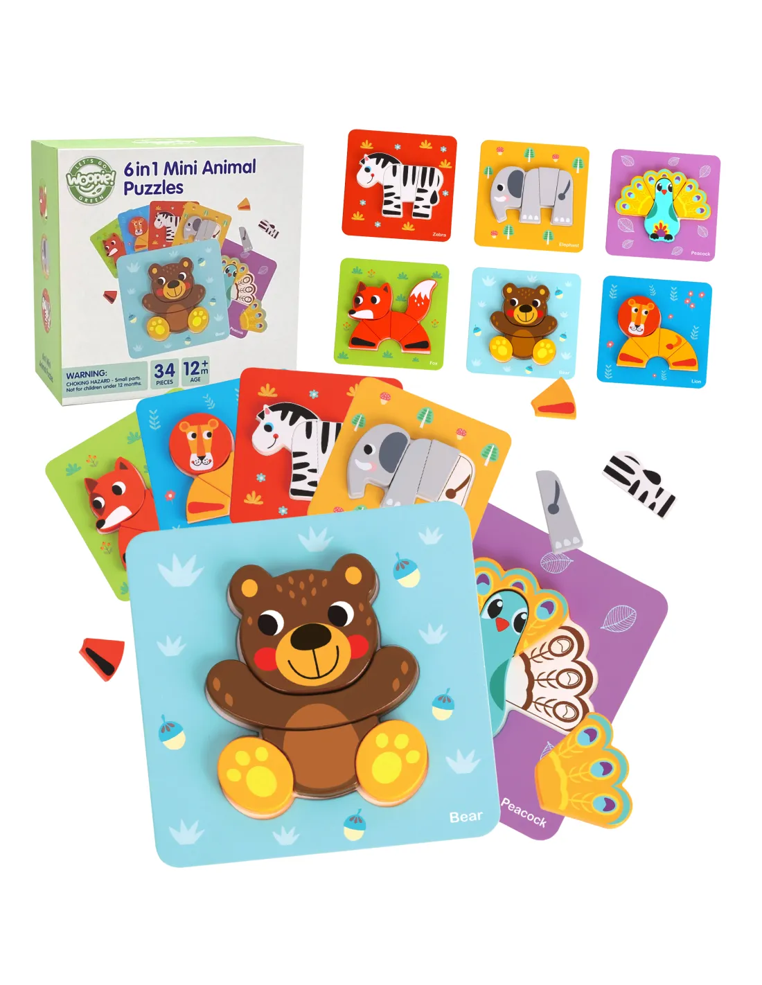 WOOPIE GREEN Mediniai dėlionės kaladėlės gyvūnai Montessori FSC 34vnt.
