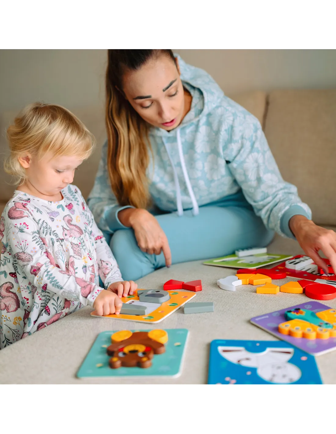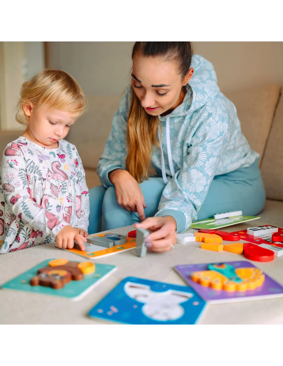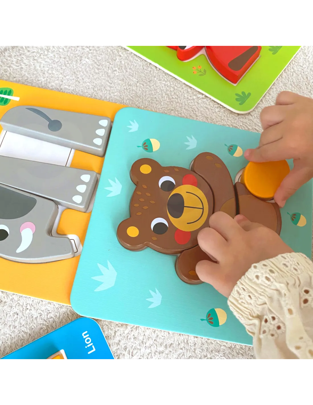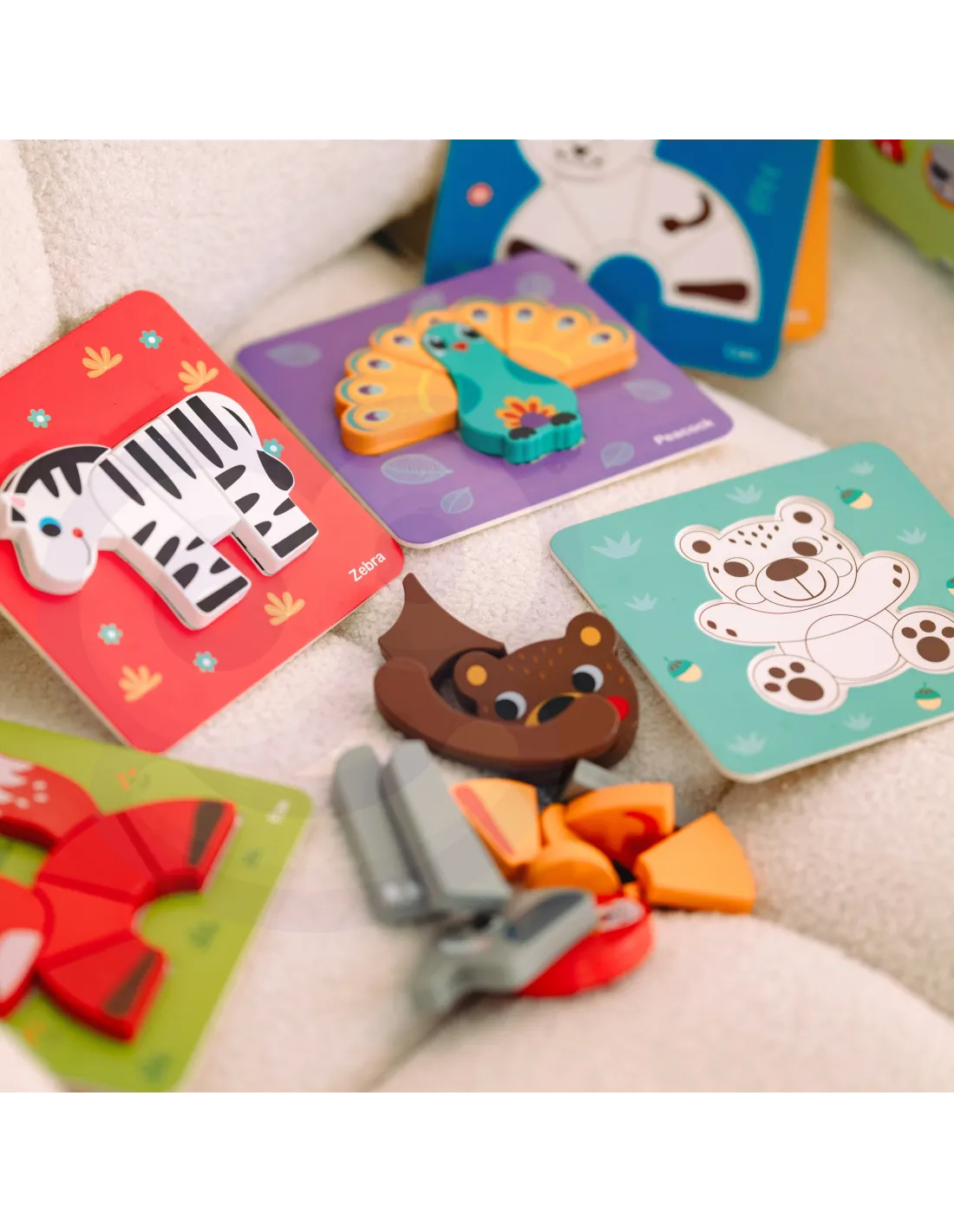 „Medinis gyvūnų dėlionė“ – tai unikalus ugdomasis rinkinys, kuriame sumaniai suderintas laisvas žaidimas ir mokymasis. Mažylių pagrindinė užduotis – suderinti didelius medinius blokelius su atitinkamomis angomis paruoštose lentelėse. Specialiai suprojektuotos išėmos kortelėse veiksmingai neleidžia detalėms pasislinkti, todėl paveikslėlių sudėliojimas tampa lengvesnis ir nekelia nusivylimo, o kartu skatina tikslumo įgūdžių ugdymą.