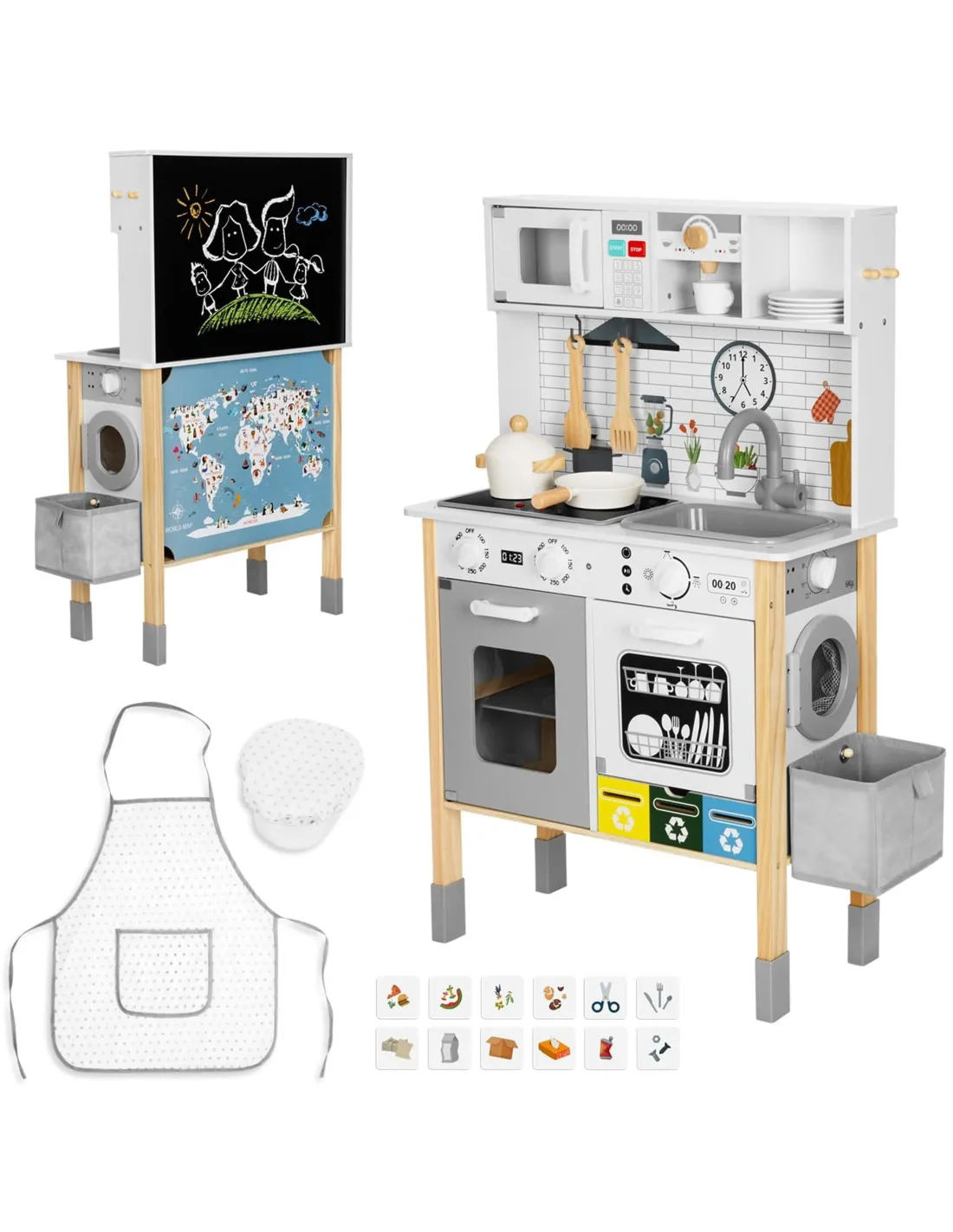Šis daugiafunkcinis medinis virtuvės rinkinys sukurtas mažiesiems, kurie mėgsta gaminti maistą ir tyrinėti pasaulį. Rinkinys apima daugiau nei devynias skirtingas funkcijas, skatina kūrybiškumą ir žaidimo būdu ugdo kasdienio gyvenimo įgūdžius. Puikiai tinka vaiko kambariui, žaidimų kambariui ar darželiui.