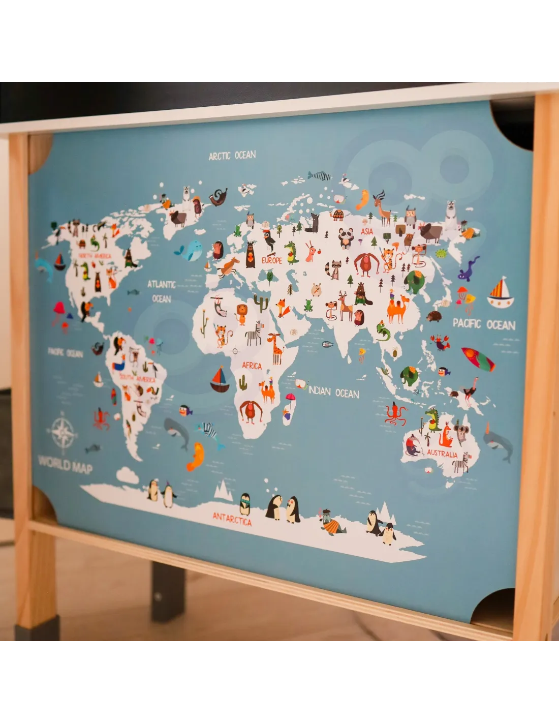 - - rinkinio gale yra kreidinė lenta ir spalvingas pasaulio žemėlapis, skatinantis mokymąsi ir piešimą