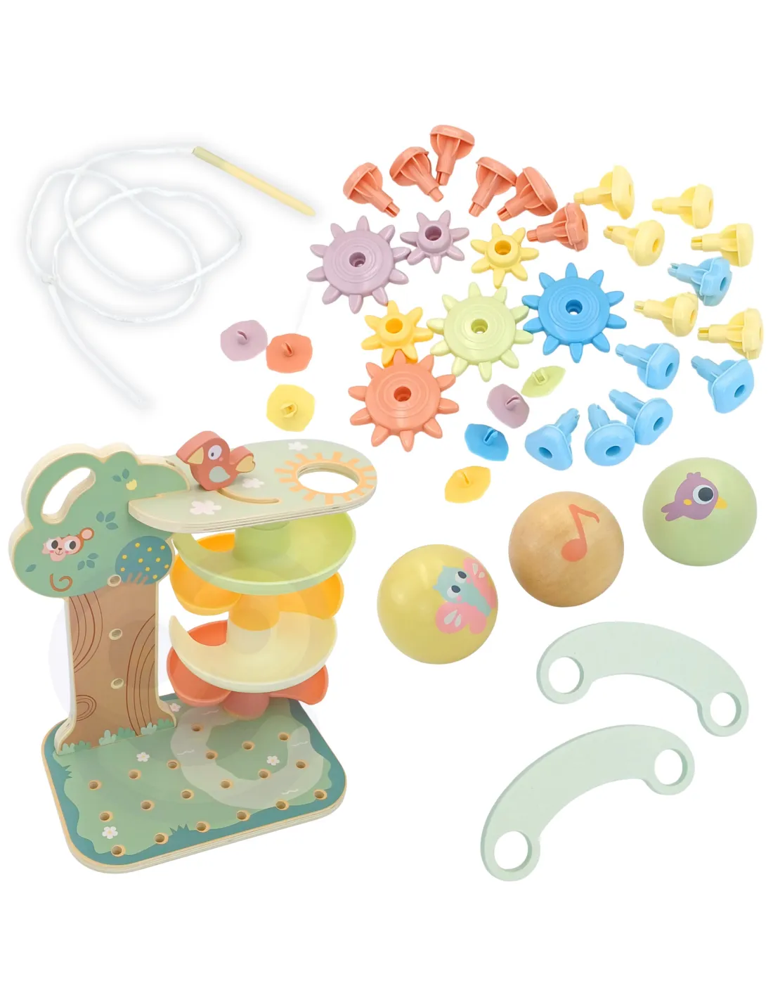 kamuoliukų traselė, jutiminiai krumpliukai, įkišimo kaišteliai ir kūrybinė siūlų verpimo mašinėlė – visa tai gražioje pastelinės spalvos aplinkoje, pagaminta iš saugių ir patvarių medžiagų