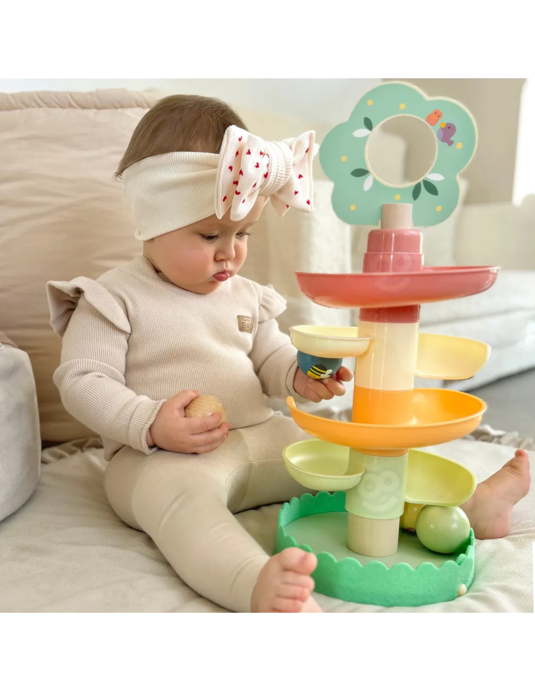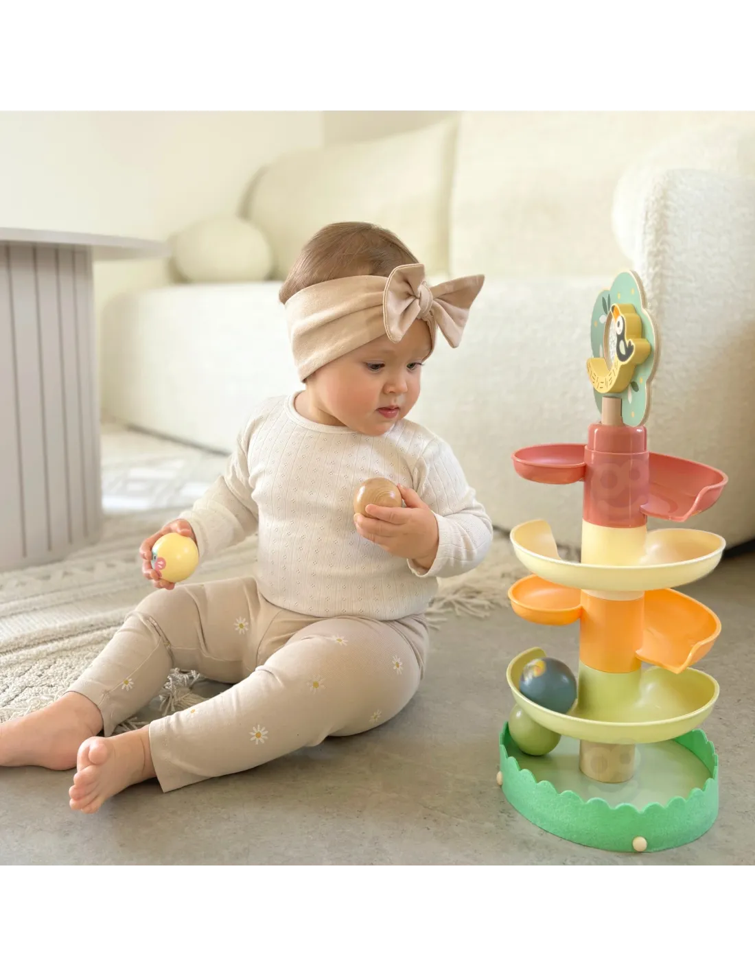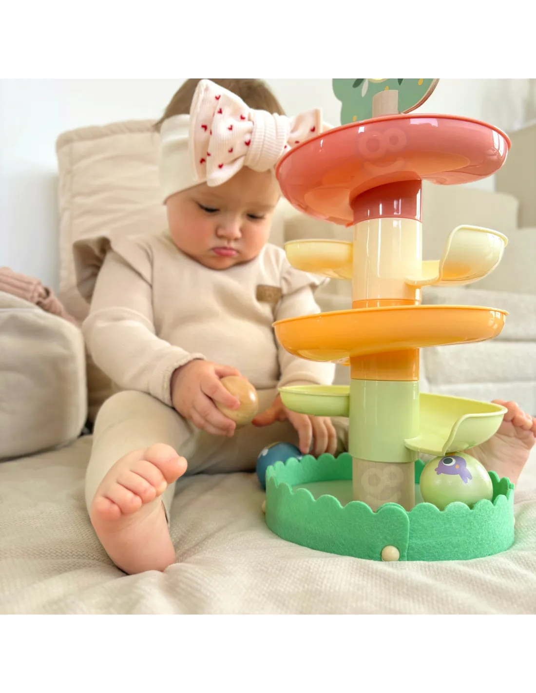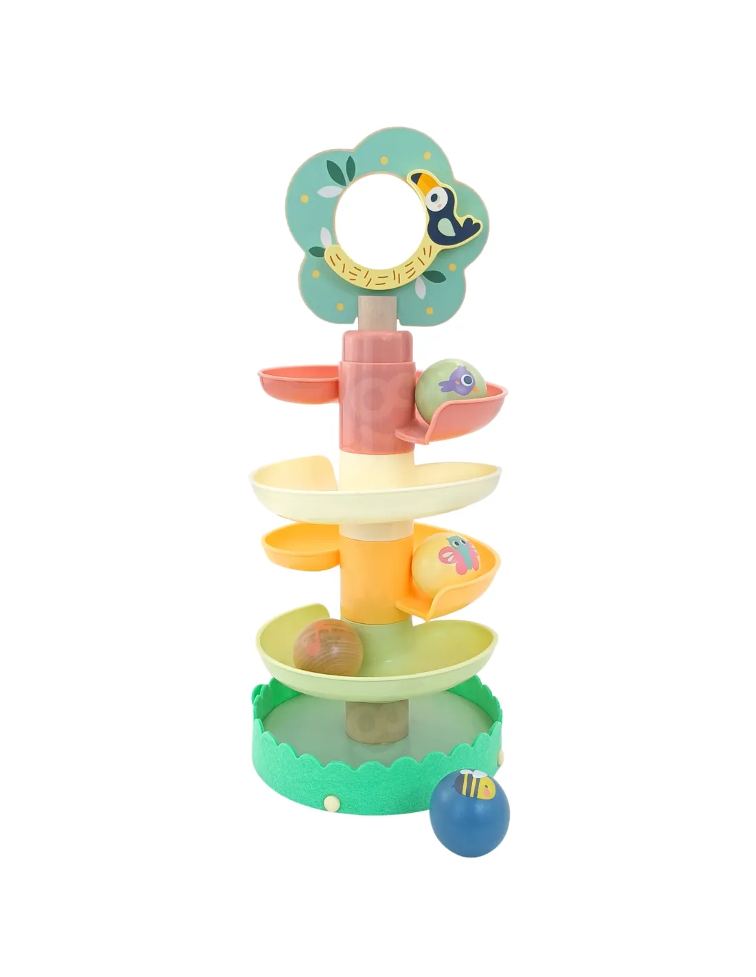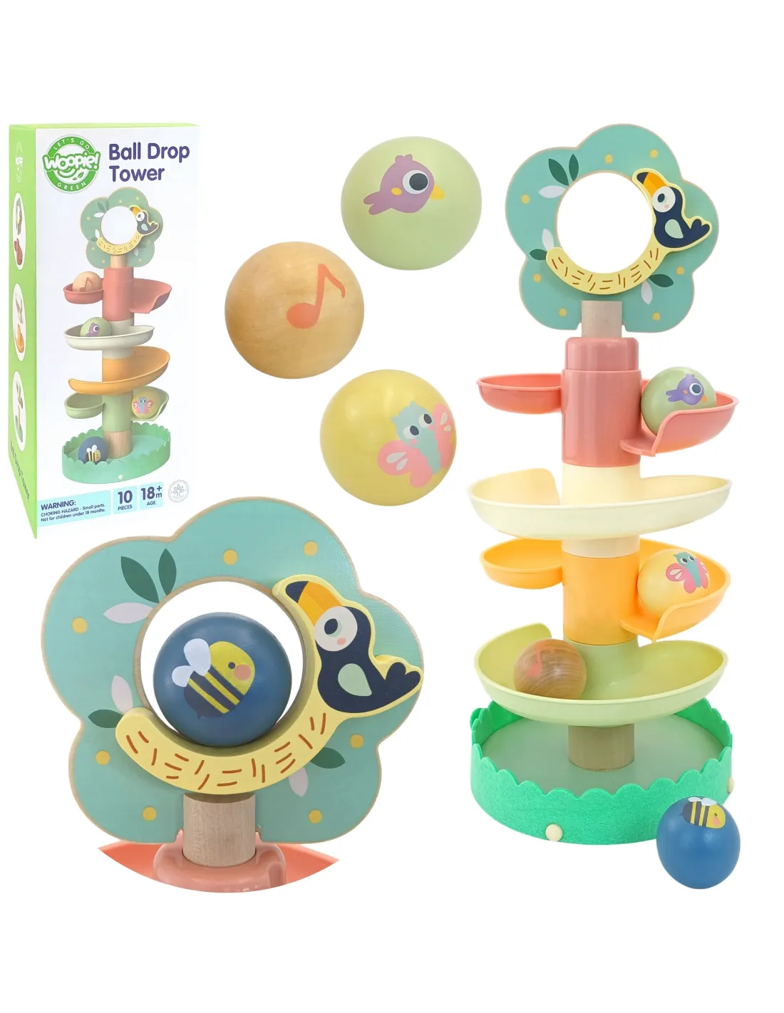 WOOPIE GREEN medinė kamuoliukų traselė – puikus sensorinis ir ugdomasis žaislas vaikams nuo 18 mėnesių. Spiralinis bokštas, sudarytas iš 6 spalvingų, lengvai surenkamų elementų, leidžia vaikams susikurti savo kamuoliukų traselę. Komplekte yra 4 lengvi rutuliai su gyvūnų ir muzikos natų atvaizdais, kuriuos vaikai gali stebėti, kai jie rieda žemyn – tai ne tik smagu, bet ir puiki mankšta jų akims bei rankoms. Miško tema skatina vaizduotę ir savarankišką žaidimą, o natūralus medis ir saugios medžiagos užtikrina kokybę bei ilgaamžiškumą.