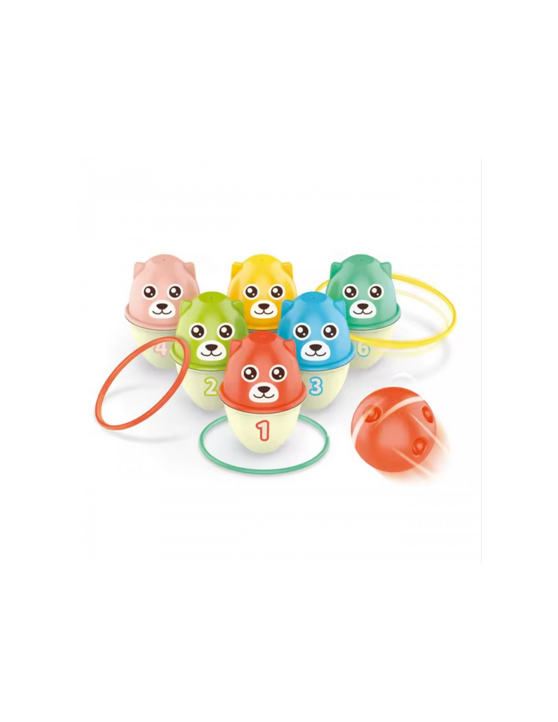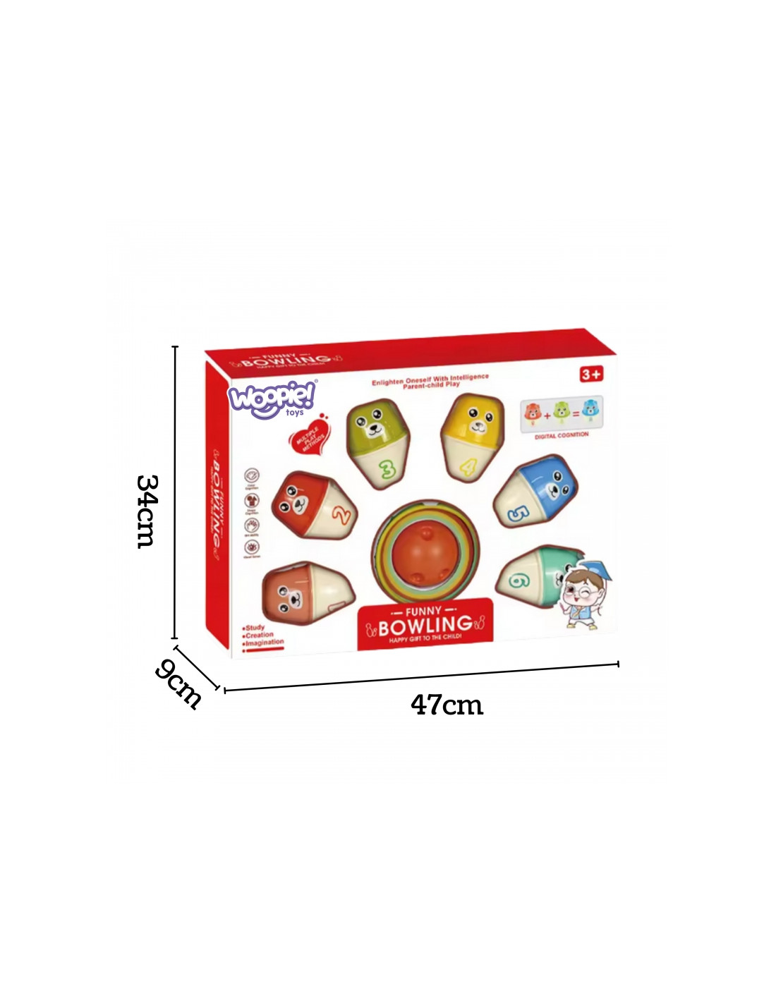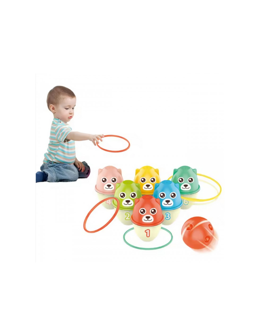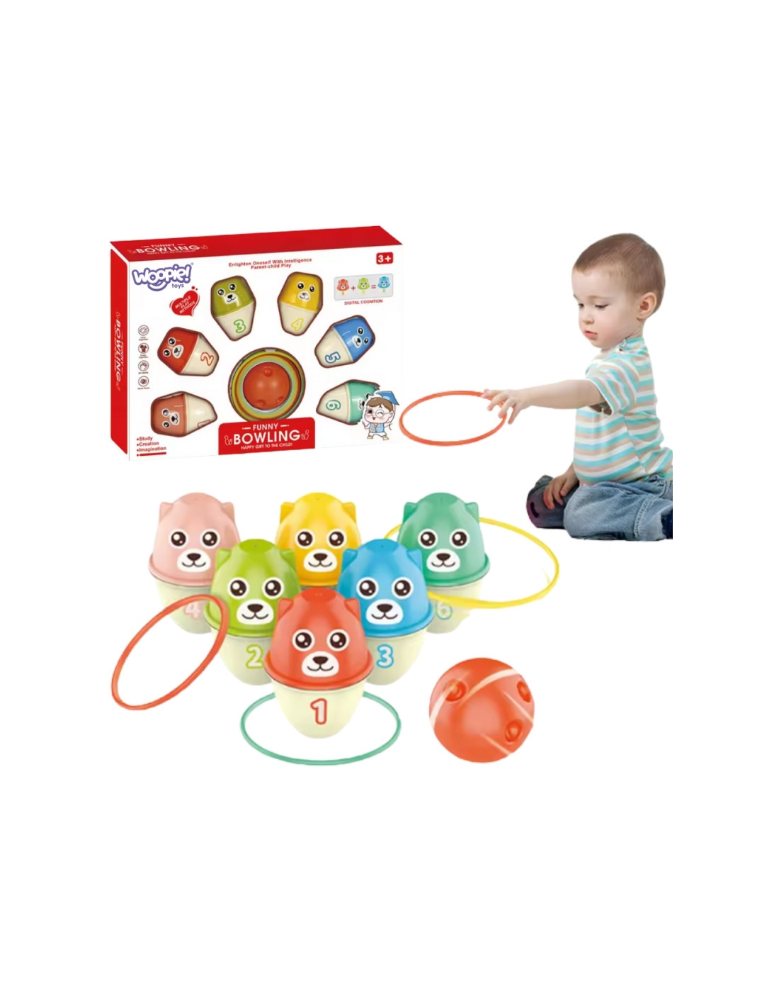 „Woopie“ spalvingų meškiukų boulingo rinkinys vaikams yra novatoriškas, lavinamasis žaislas, kuris sujungia boulingo malonumą su mokymusi per veiksmą. Rinkinį sudaro spalvingi meškiukai su skaičiais, kurie tarnauja kaip kėgliai, taip pat kamuoliukai jiems numušti ir lankai mėtyti, siūlantys platų žaidimo variantų pasirinkimą. Kiekvienas meškiukas yra skirtingos spalvos ir skaičiaus, todėl vaikai mokosi atpažinti spalvas ir skaičius. Mėtydami kamuoliuką ar lankus į meškiukus, vaikai lavina rankų ir akių koordinaciją, smulkiąją motoriką ir planavimo įgūdžius. Dėl patrauklaus dizaino ir įvairių funkcijų rinkinys puikiai tinka tiek savarankiškam žaidimui, tiek laiko leidimui kartu su tėvais ar bendraamžiais. Žaislas pagamintas iš patvarių, vaikams saugių medžiagų, kurios yra malonios liesti ir atsparios pažeidimams. Meškiukus taip pat galima sudėti į bokštą, įdedant juos vieną į kitą kaip puodelius. Įvairūs žaidimo režimai – lankų mėtymas, kėglių numušimas, skaičių skaičiavimas – užtikrina, kad jūsų mažylis ne tik smagiai praleis laiką, bet ir intensyviai mokysis. Tai puiki dovana bet kuriam vaikui, garantuojanti ne tik šypsenas, bet ir aktyvų pažintinių, rankinių ir socialinių įgūdžių vystymąsi. Puikiai tinka namams, vaikų darželiui, ikimokyklinio ugdymo įstaigai ar šeimos išvykoms.