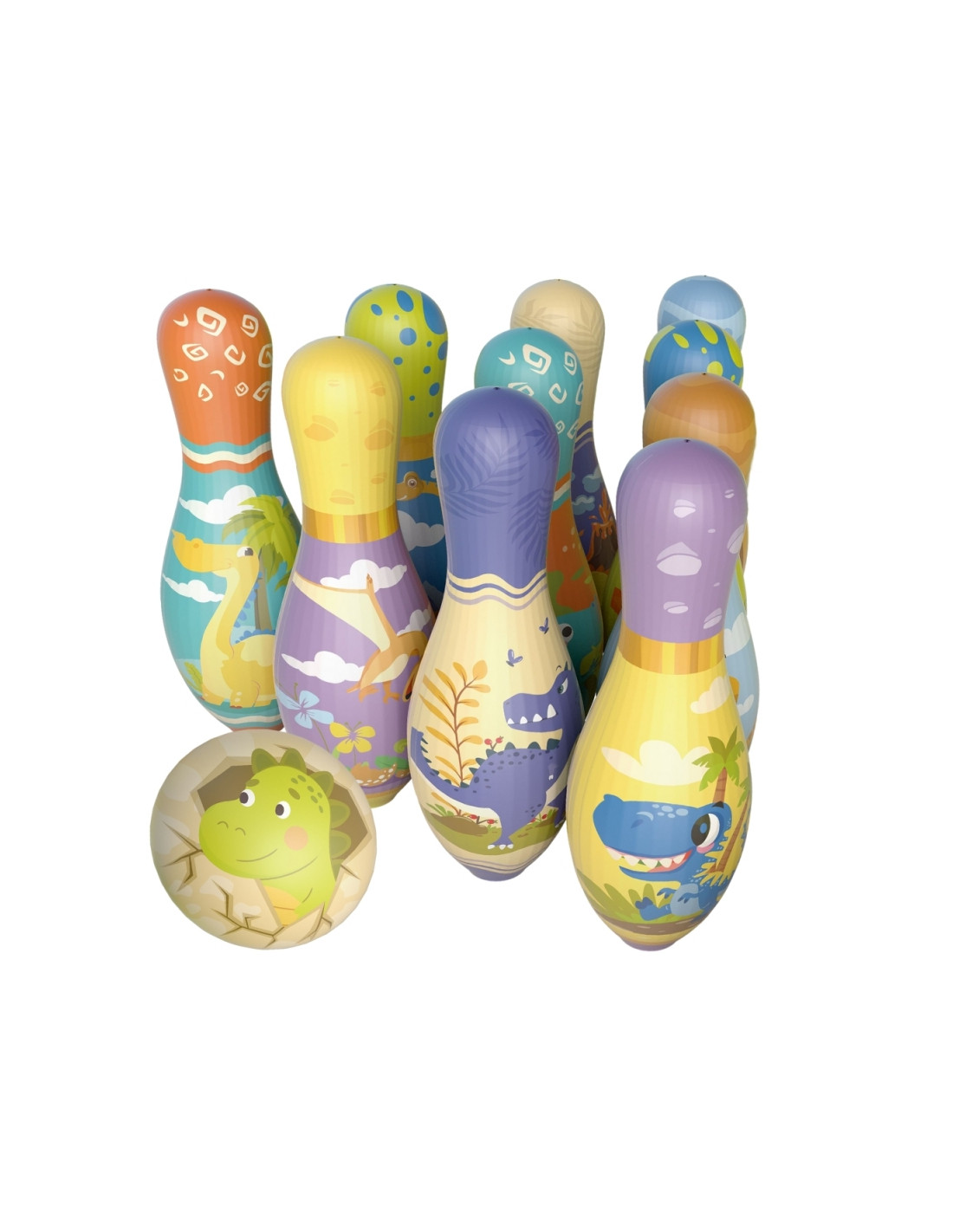 - Minkšti putplasčio boulingo kėgliai su patraukliais, spalvingais dinozaurų motyvais