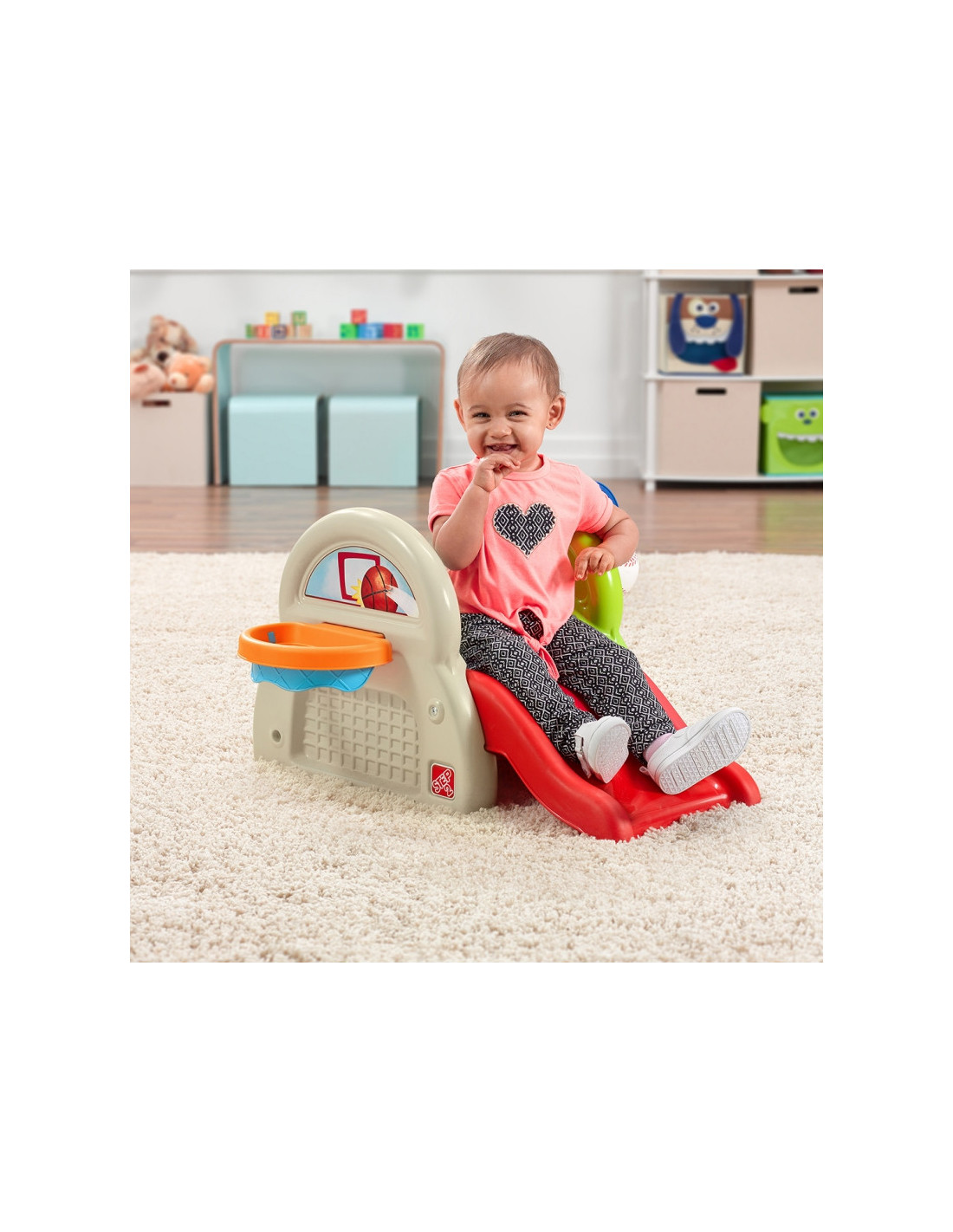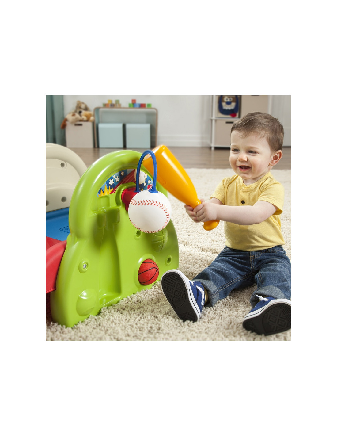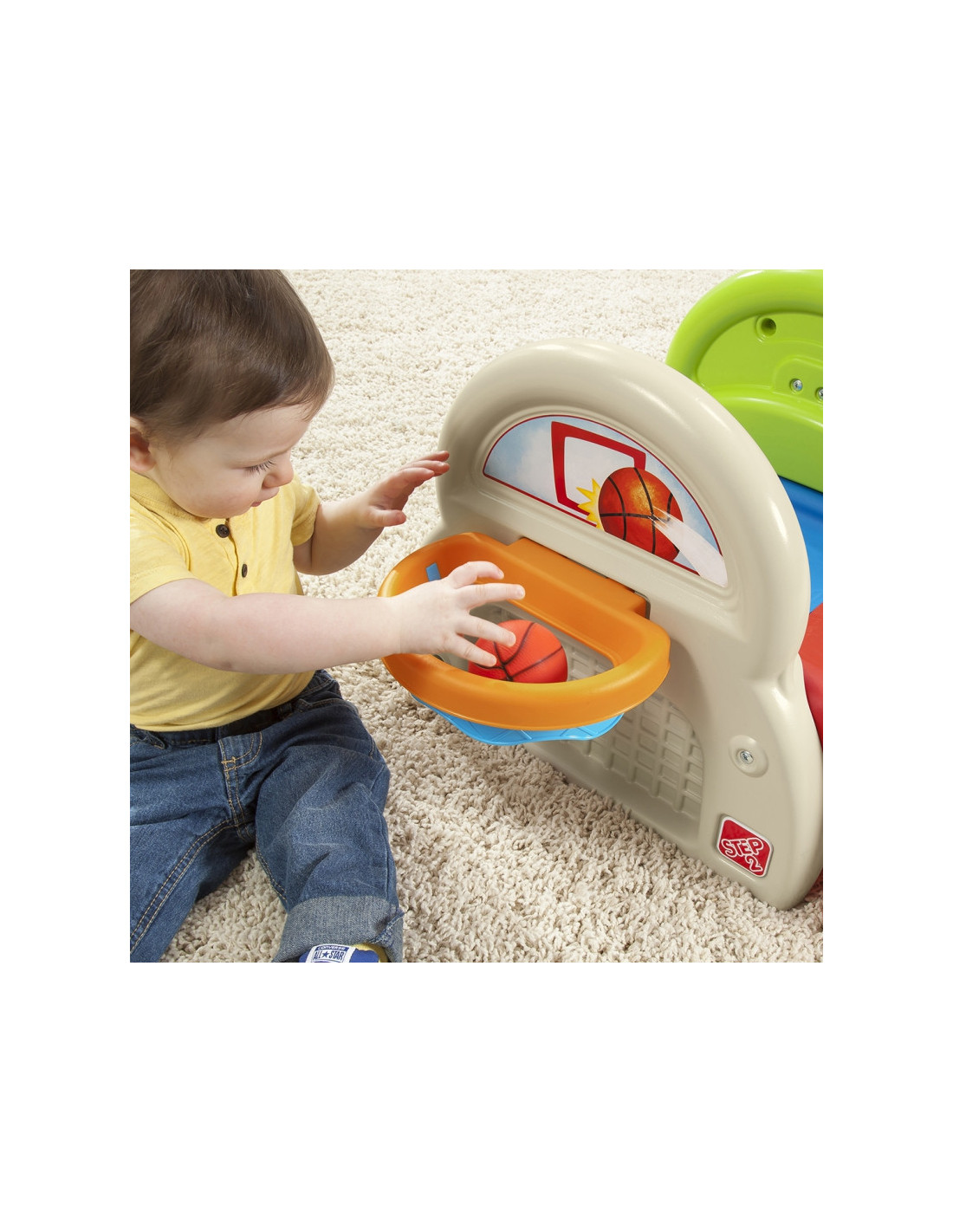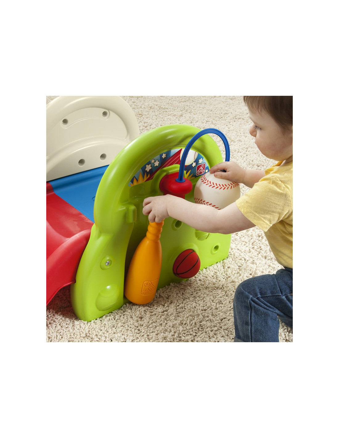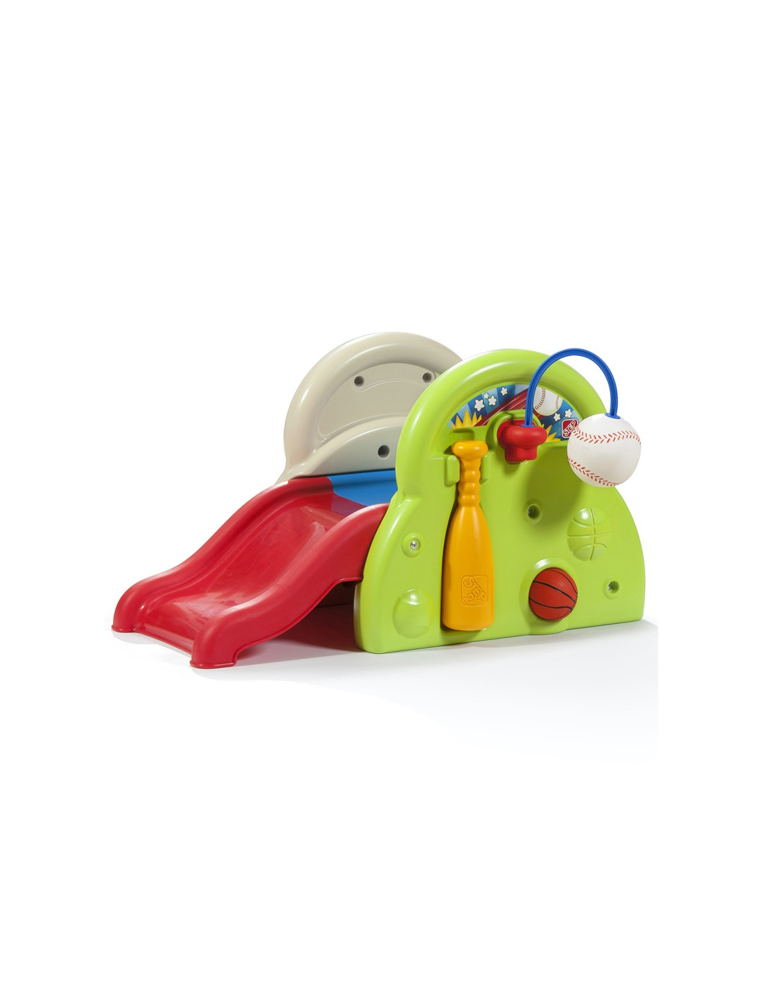 Plac zabaw od firmy STEP2 ma wiele sposobów na zabawę. W tym wciągającym centrum aktywności dla małych dzieci jest głównie tematyka sportowa. Dzieci mogą ćwiczyć równowagę i motorykę, wspinając się po bardzo szerokim stopniu i zjeżdżając na zjeżdżalni po drugiej stronie. Jest także piłka oraz obręcz do koszykówki co pozwala maluchowi wrzucać do celu. Dodatkowo można użyć dołączonego kija, aby uderzać w uwiązaną piłkę baseballową! Dzięki tej zabawce sportowej, zaprojektowanej specjalnie dla najmłodszych, Twój mały robaczek będzie skakał do domu, wślizgiwał się do bazy i robił niesamowite wsady do kosza podczas zabawy. Gdy zabawa się skończy, użyj wbudowanego schowka, aby schować piłkę do koszykówki i wciśnij kijek na zewnętrznej ścianie centrum aktywności, aby wszystko było blisko na następny dzień zabawy.