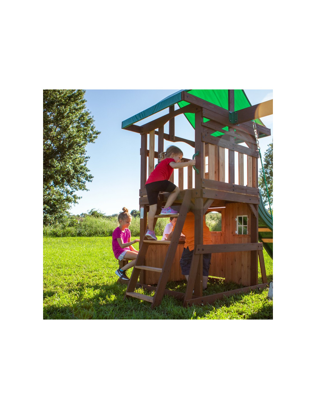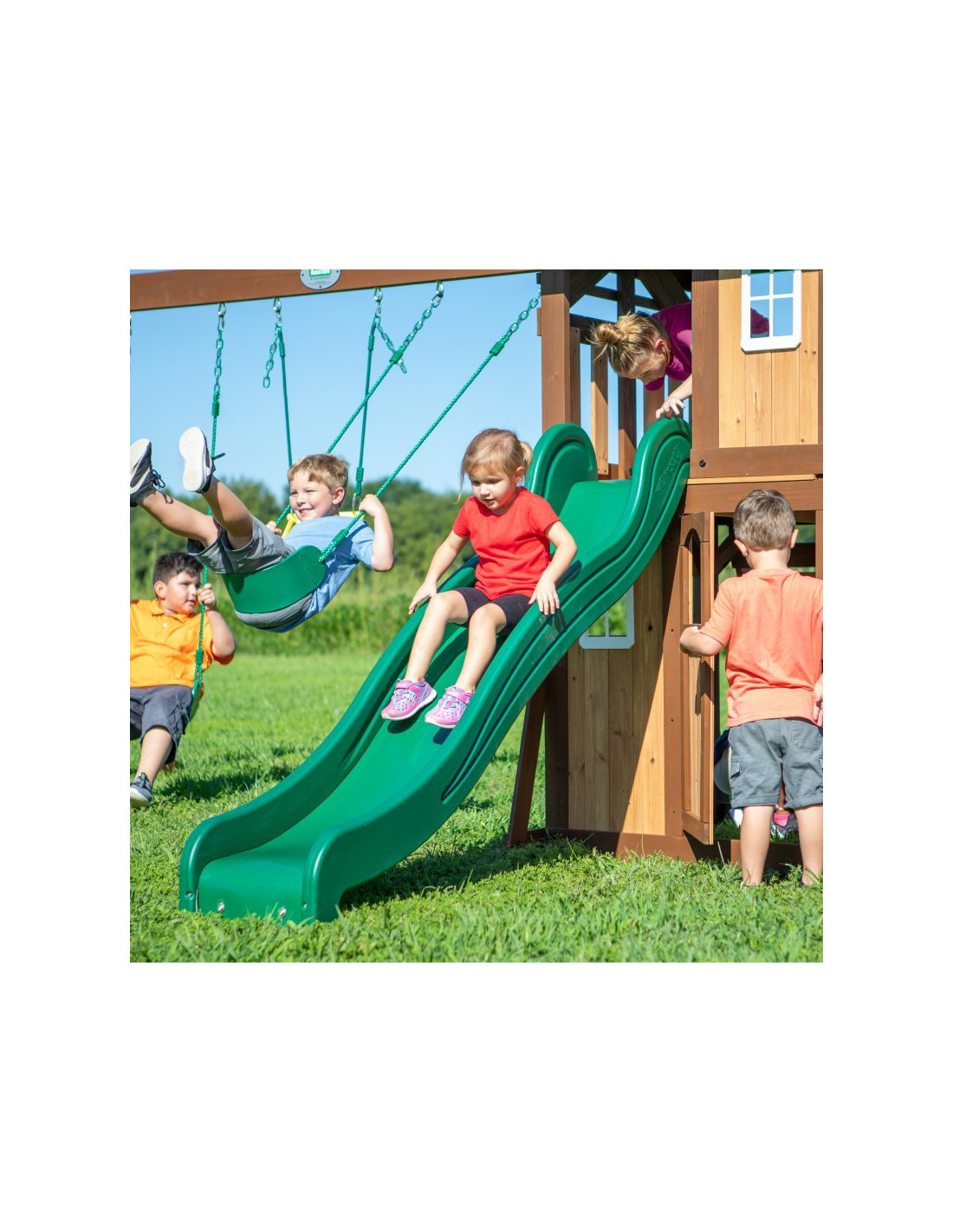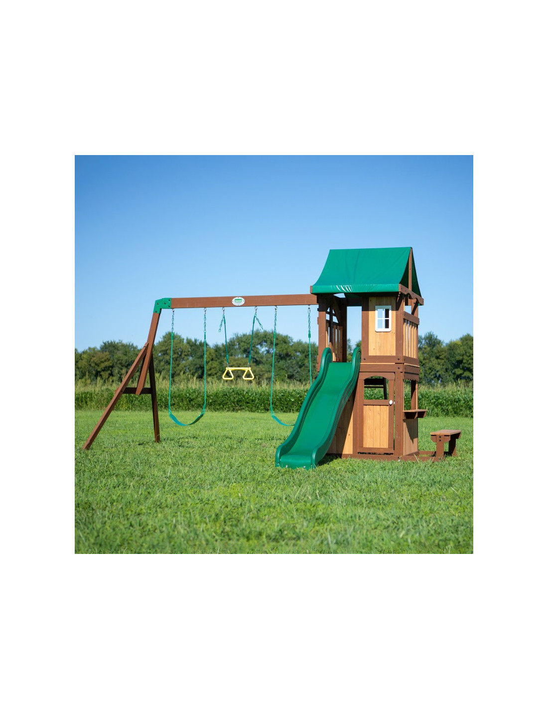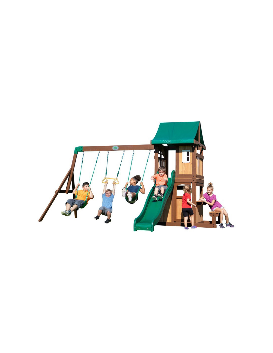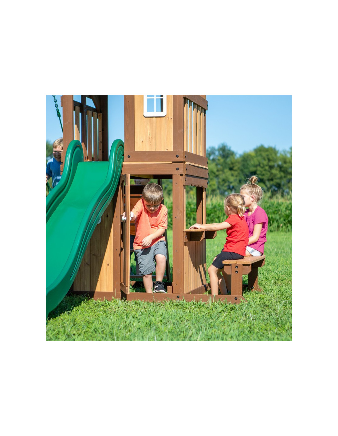 Plac zabaw Lakewood z huśtawkami i zjeżdżalnią firmy Backyard Discovery oferuje małym dzieciom mnóstwo możliwości ciekawej zabawy. Dzięki swej kompaktowej konstrukcji Lakewood przekształca również mniejsze ogrody w prawdziwy plac zabaw, w którym dzieci mogą bawić się przez cały dzień. Konstrukcja ma podwyższoną platformę do zabawy z kolorowym baldachimem przeciwsłonecznym. Niższe pomieszczenie ze ścianą frontową, oknem i prawdziwymi drzwiami. Na zewnątrz za oknem wbudowana ławka. Dzieci mogą huśtać się na jednej z 2 huśtawek lub wykonywać akrobacje na trapezie. Płaskie schody prowadzą dzieci na najwyższą platformę, skąd zjeżdżalnia o długości 244 cm szybko sprowadzi je z powrotem na dół.