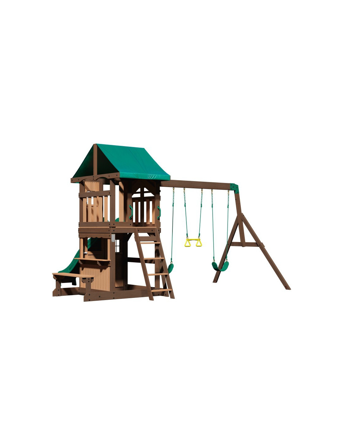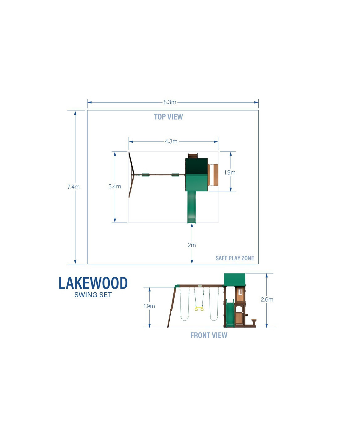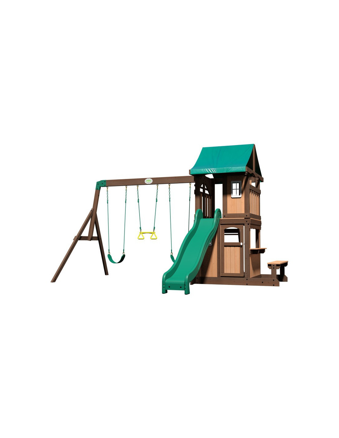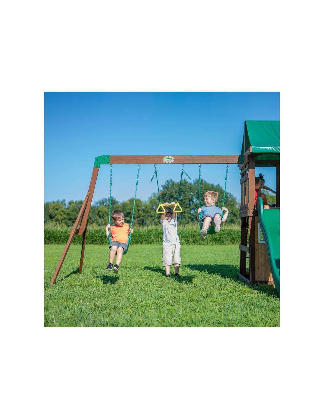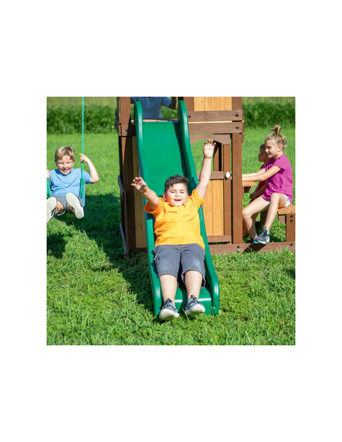 Plac zabaw Lakewood z huśtawkami i zjeżdżalnią firmy Backyard Discovery oferuje małym dzieciom mnóstwo możliwości ciekawej zabawy. Dzięki swej kompaktowej konstrukcji Lakewood przekształca również mniejsze ogrody w prawdziwy plac zabaw, w którym dzieci mogą bawić się przez cały dzień. Konstrukcja ma podwyższoną platformę do zabawy z kolorowym baldachimem przeciwsłonecznym. Niższe pomieszczenie ze ścianą frontową, oknem i prawdziwymi drzwiami. Na zewnątrz za oknem wbudowana ławka. Dzieci mogą huśtać się na jednej z 2 huśtawek lub wykonywać akrobacje na trapezie. Płaskie schody prowadzą dzieci na najwyższą platformę, skąd zjeżdżalnia o długości 244 cm szybko sprowadzi je z powrotem na dół.