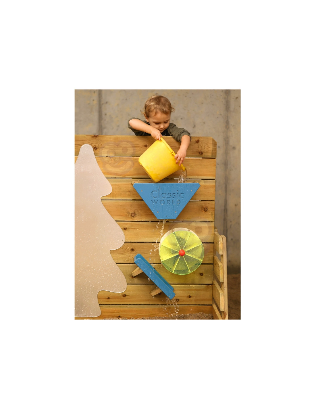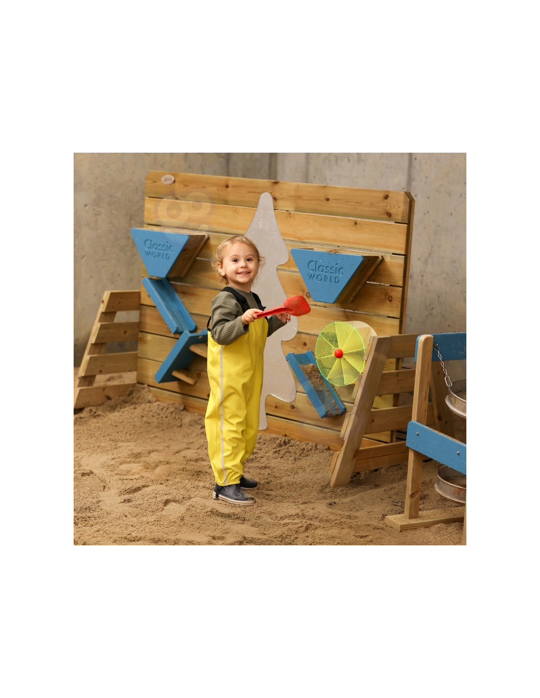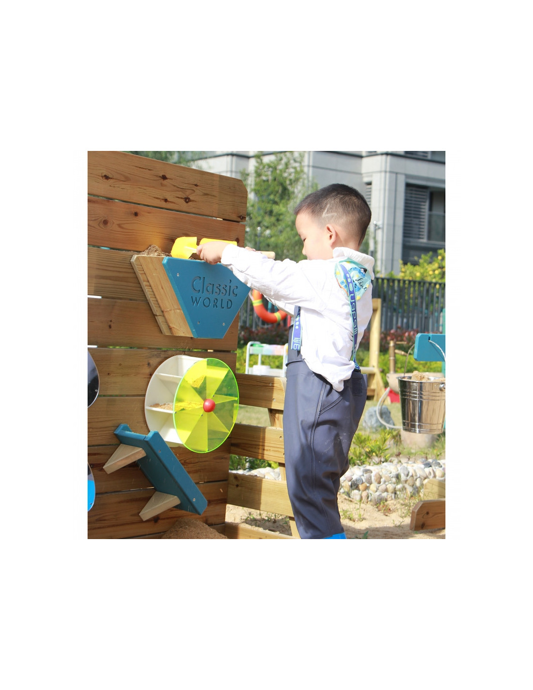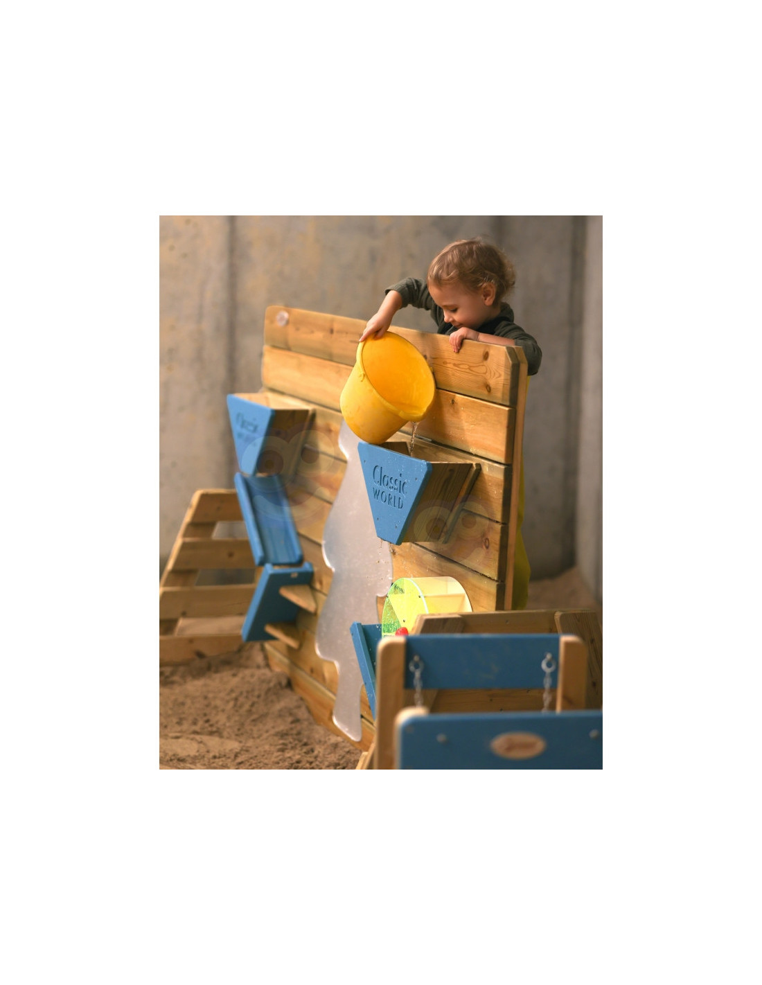 Medinė žaidimų siena iš CLASSIC WORLD – puikus bet kurios žaidimų aikštelės ar sodo papildymas. Tai daugiafunkcis komplektas, kurį sudaro žaidimų aikštelė ir poilsio zona . Pagaminta iš aukštos kokybės medienos, dažyta netoksiška impregnavimo priemone, kuri yra visiškai saugi vaikams. Dešinėje pusėje yra piltuvėlis – tiesiog pripildykite jį smėlio ir stebėkite, kaip jis byra pro angą, taip pajudindamas smėlio malūną. Kairėje pusėje taip pat yra piltuvėlis, į kurį pilamas smėlis ir stebima, kaip jis byra pro angą ant stačių žaislo šonų, sukurdamas čiuožyklą. Centre įdėta kalėdinės eglutės formos veidrodinė folija , kuri tikrai patiks jūsų vaikui! Kitoje lentos pusėje yra poilsio zona – patogus medinis suoliukas. Jūsų vaikas gali ant jos atsisėsti ir, baigęs žaisti, padėti žaislus ant apatinės lentynos.