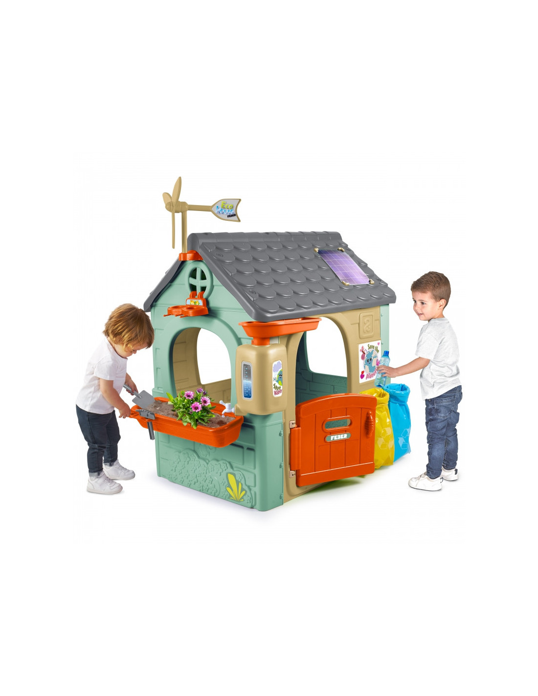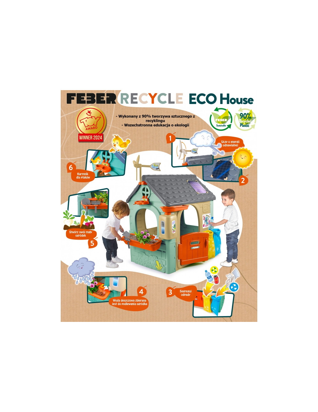 „FEBER Recycle ECO“ žaidimų namelis pagamintas iš 90 % ekologiško perdirbto plastiko. 2024 m. didžiausioje Niurnbergo žaislų mugėje pelnęs „ToyAward“ apdovanojimą už išsamų ekologinį ugdymą, šis gražiai pagamintas žaidimų namelis siūlo visas veiklas, kurių reikia vaikams, kad sužadintų smalsumą apie gamtą. Tai puiki vieta mokytis apie atliekų rūšiavimą, perdirbimą, ekologinį ūkininkavimą ir žaliosios energijos gamybą, nes ant stogo yra vėjo turbina ir saulės baterijos . Namelyje yra du perdirbimo konteineriai (geltonas ir mėlynas), nedidelis sodas (vazonuose) ir įrankiai . Tai puiki lauko veikla vaikams. Jie gali mėgautis sėklų sodinimu ir stebėti, kaip auga augalai. Taip pat yra paukščių lesyklėlė . Lietaus vanduo puikiai tinka augalams ar gėlėms laistyti. Vėjo malūnas ir imitacinė saulės baterija suteikia nuostabių savybių mokytis apie tvarią energiją! Patvarūs, lengvai montuojami ir padengti apsauga nuo UV spindulių, kuri apsaugo nuo spalvos blukimo ir padidina medžiagos ilgaamžiškumą.