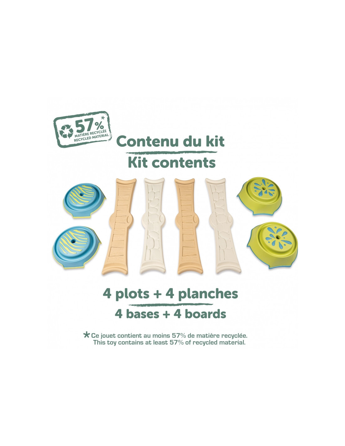 Rinkinį sudaro keturios ilgos (70 cm) panelės su skirtingomis tekstūromis ir keturi pagrindai joms pritvirtinti. Lanksti elementų konfigūracija leidžia sukurti iki 3,5 metro ilgio taką, pritaikytą jūsų vaiko gebėjimams. Rekomenduojama taku vaikščioti basomis, nes tai pagerina sensorinę patirtį ir teigiamai veikia nervų sistemos vystymąsi.