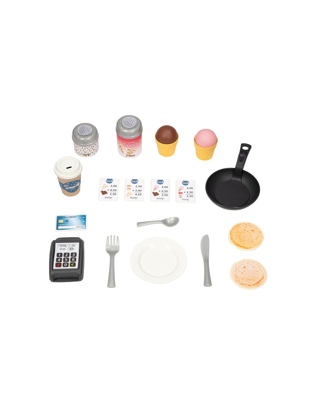 - - rinkinyje yra 18 priedų - blynai, ledai, pabarstukai, stalo įrankiai, kreditinės kortelės, monetos,