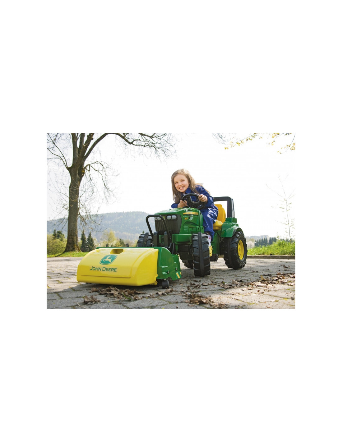 Šlavimo mašiną lengva surinkti, o ji be vargo prikabinama prie vaikiško pedalinio traktoriaus. Su „rollyTrac" šlavimo mašina John Deere vaikai žaisdami mokosi atsakomybės ir suvokia, kaip svarbu palaikyti švarą aplinkui. Šlavimo mašina ugdo smulkiąją motoriką bei tvarkos ir švaros įpročius.