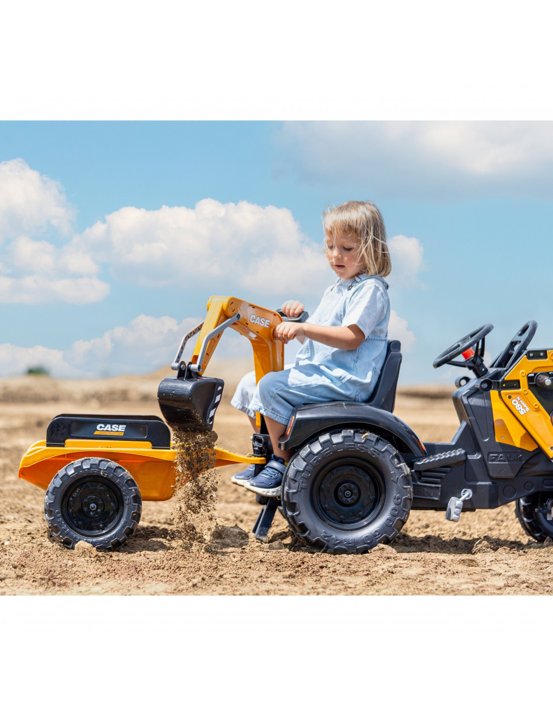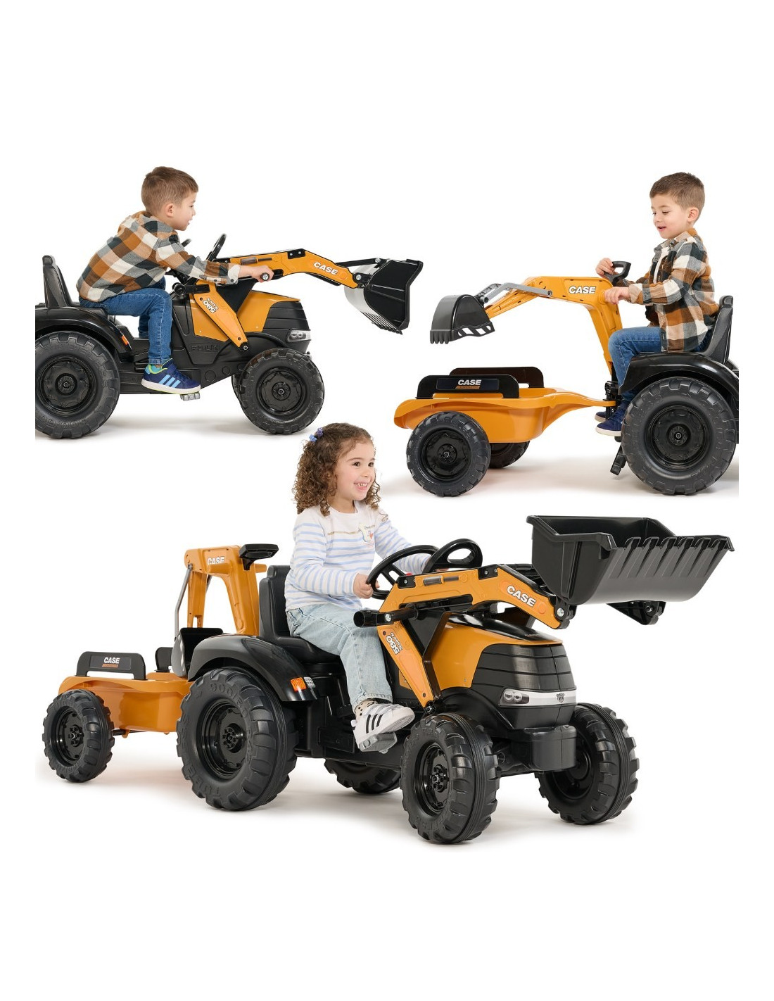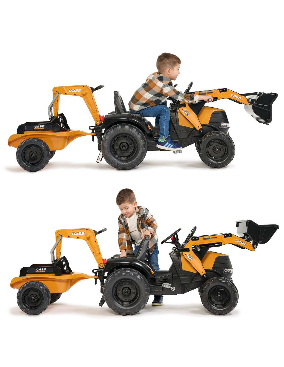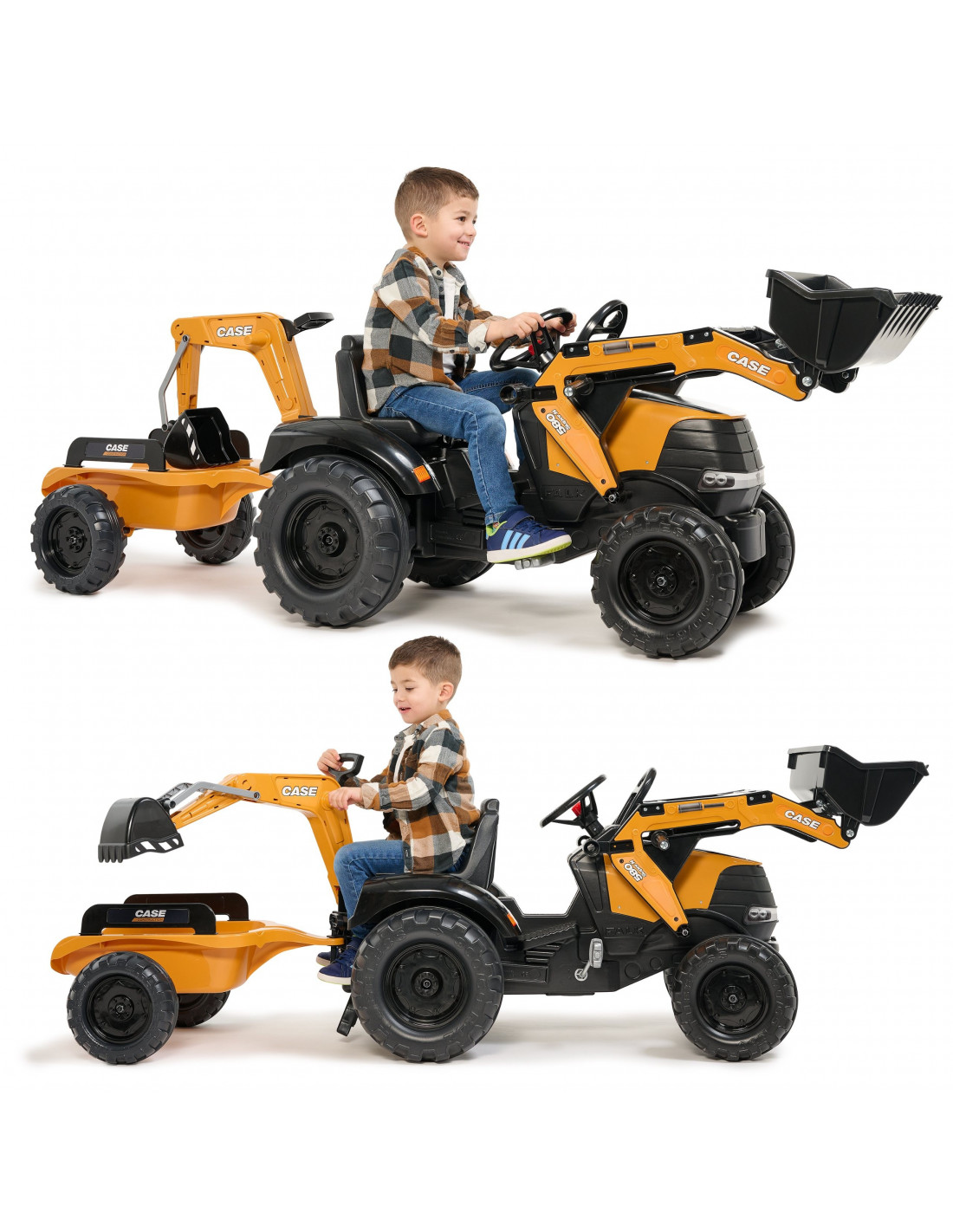 Garsaus gamintojo „Falk“ pagamintas „Case CE“ traktorius su pedalais yra kiekvieno vaiko svajonė. Šis įspūdingas transporto priemonė yra tikro „Case Construction“ traktoriaus tiksli kopija, sukurta specialiai 3–7 metų vaikams. Dėl tvirtos konstrukcijos ir dėmesio detalėms šis traktorius puikiai tinka žaisti sode, kieme. Jis yra „Eco Design“ linijos dalis, 100 % pagamintas Prancūzijoje, naudojant ne mažiau kaip 60 % perdirbto plastiko, todėl yra ekologiškas pasirinkimas. Transporto priemonė siūlo daug žaidimo galimybių dėl savo gausios įrangos. Ji turi visiškai funkcionalų priekį krautuvą ir galinį ekskavatorių, kurie yra sujungti, todėl vaikai gali realistiškai kasti ir perkelti smėlį, žemę ar lapus. Unikali savybė – 360° besisukanti sėdynė, leidžianti jaunajam operatoriui patogiai valdyti tiek priekinį kaušą, tiek galinį ekskavatorių, nenusileidžiant iš transporto priemonės. Komplekte taip pat yra nuimamas priekabos su bortais, puikiai tinkantis radiniams vežti. Vairo ratas su signaline užtikrina patogų vairavimą, o stabilūs ratai – saugų važiavimą.