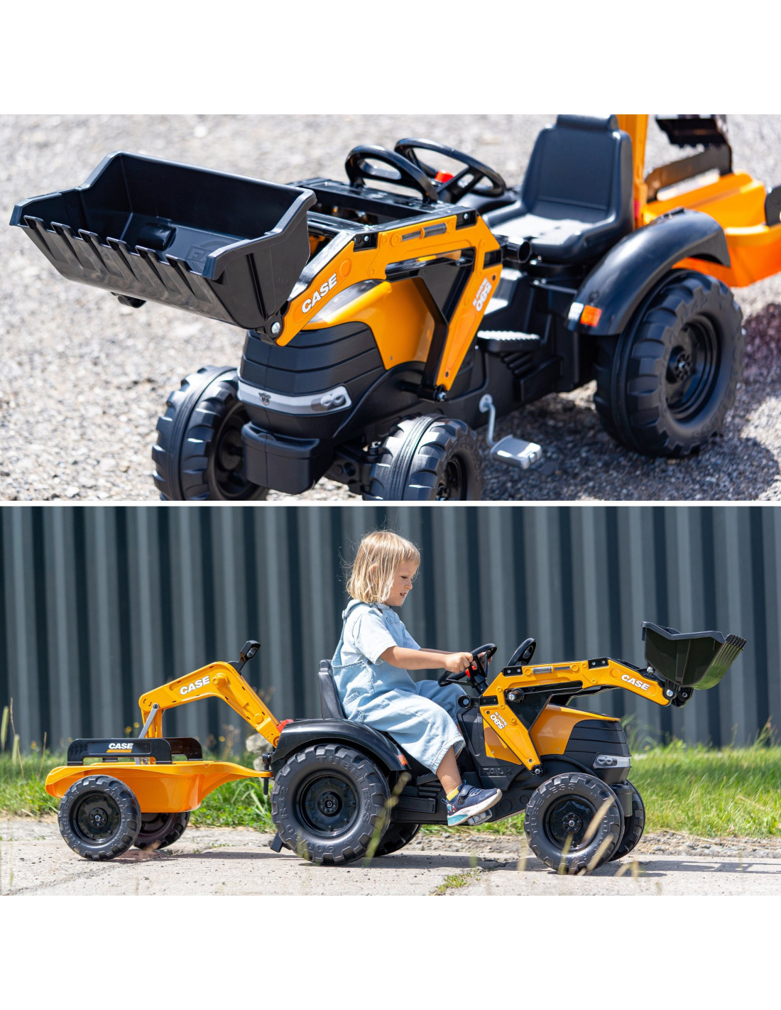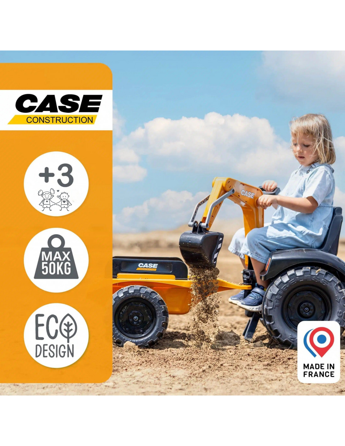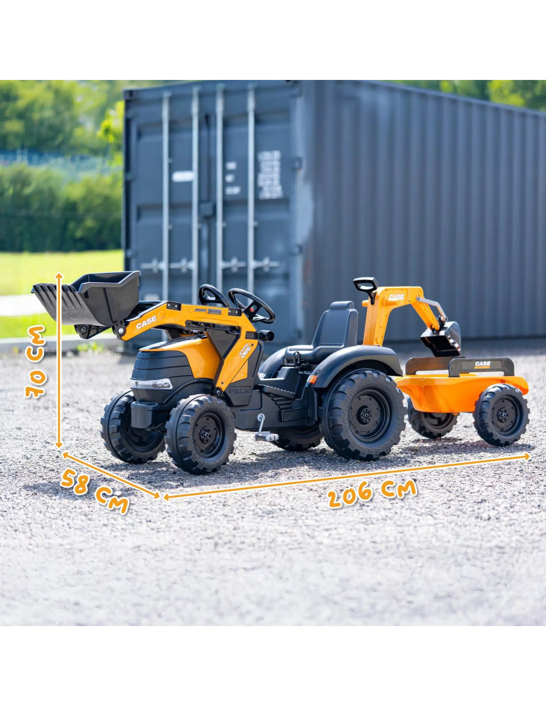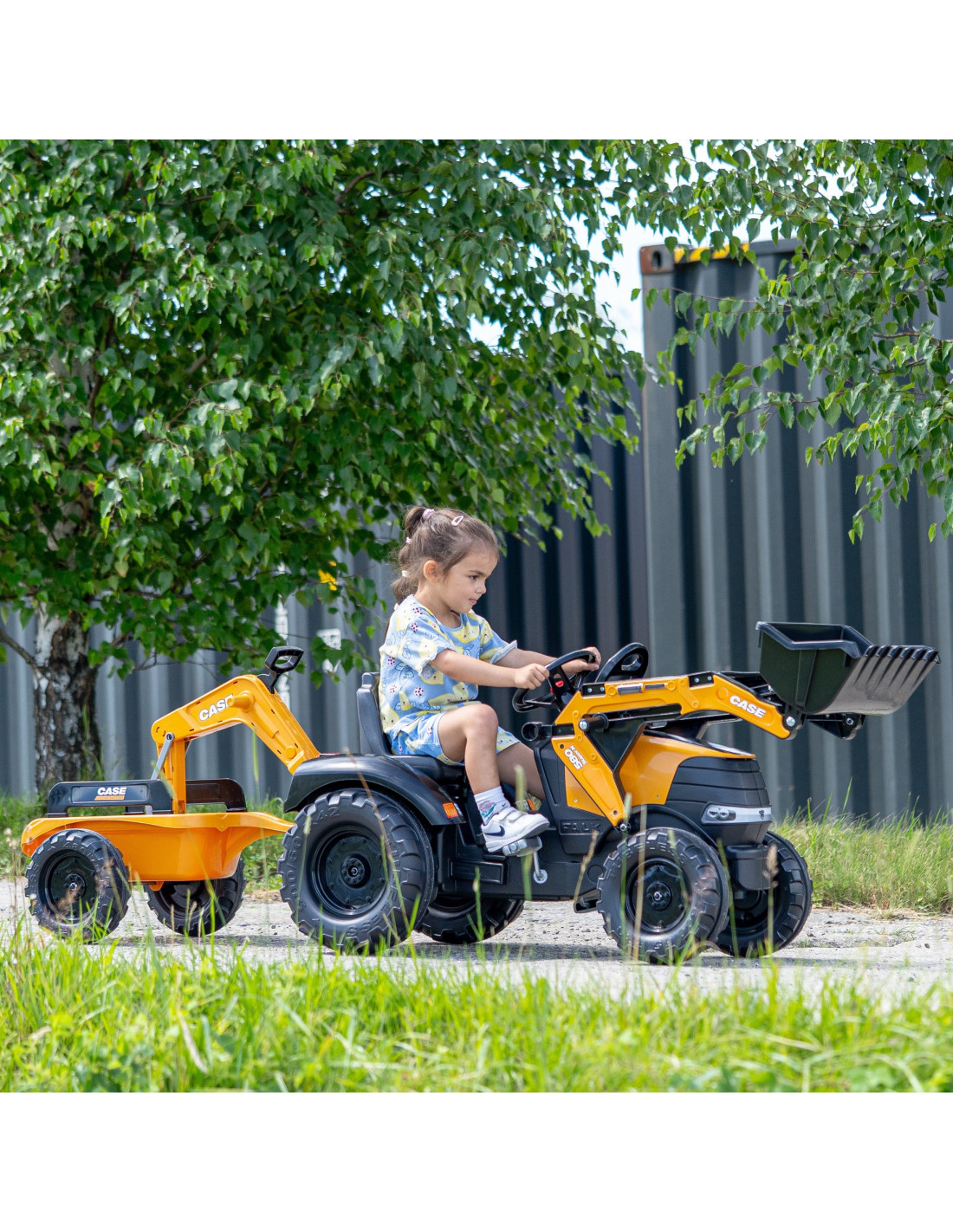 Garsaus gamintojo „Falk“ pagamintas „Case CE“ traktorius su pedalais yra kiekvieno vaiko svajonė. Šis įspūdingas transporto priemonė yra tikro „Case Construction“ traktoriaus tiksli kopija, sukurta specialiai 3–7 metų vaikams. Dėl tvirtos konstrukcijos ir dėmesio detalėms šis traktorius puikiai tinka žaisti sode, kieme. Jis yra „Eco Design“ linijos dalis, 100 % pagamintas Prancūzijoje, naudojant ne mažiau kaip 60 % perdirbto plastiko, todėl yra ekologiškas pasirinkimas. Transporto priemonė siūlo daug žaidimo galimybių dėl savo gausios įrangos. Ji turi visiškai funkcionalų priekį krautuvą ir galinį ekskavatorių, kurie yra sujungti, todėl vaikai gali realistiškai kasti ir perkelti smėlį, žemę ar lapus. Unikali savybė – 360° besisukanti sėdynė, leidžianti jaunajam operatoriui patogiai valdyti tiek priekinį kaušą, tiek galinį ekskavatorių, nenusileidžiant iš transporto priemonės. Komplekte taip pat yra nuimamas priekabos su bortais, puikiai tinkantis radiniams vežti. Vairo ratas su signaline užtikrina patogų vairavimą, o stabilūs ratai – saugų važiavimą.