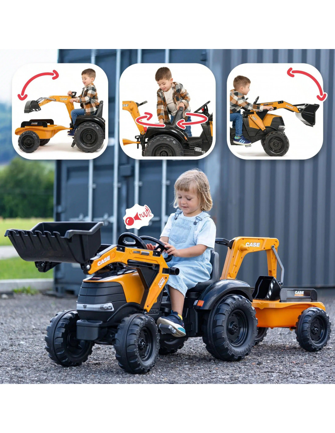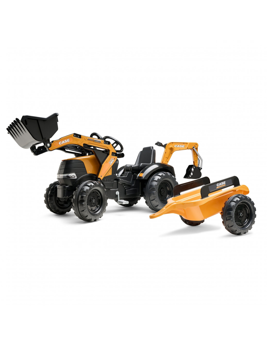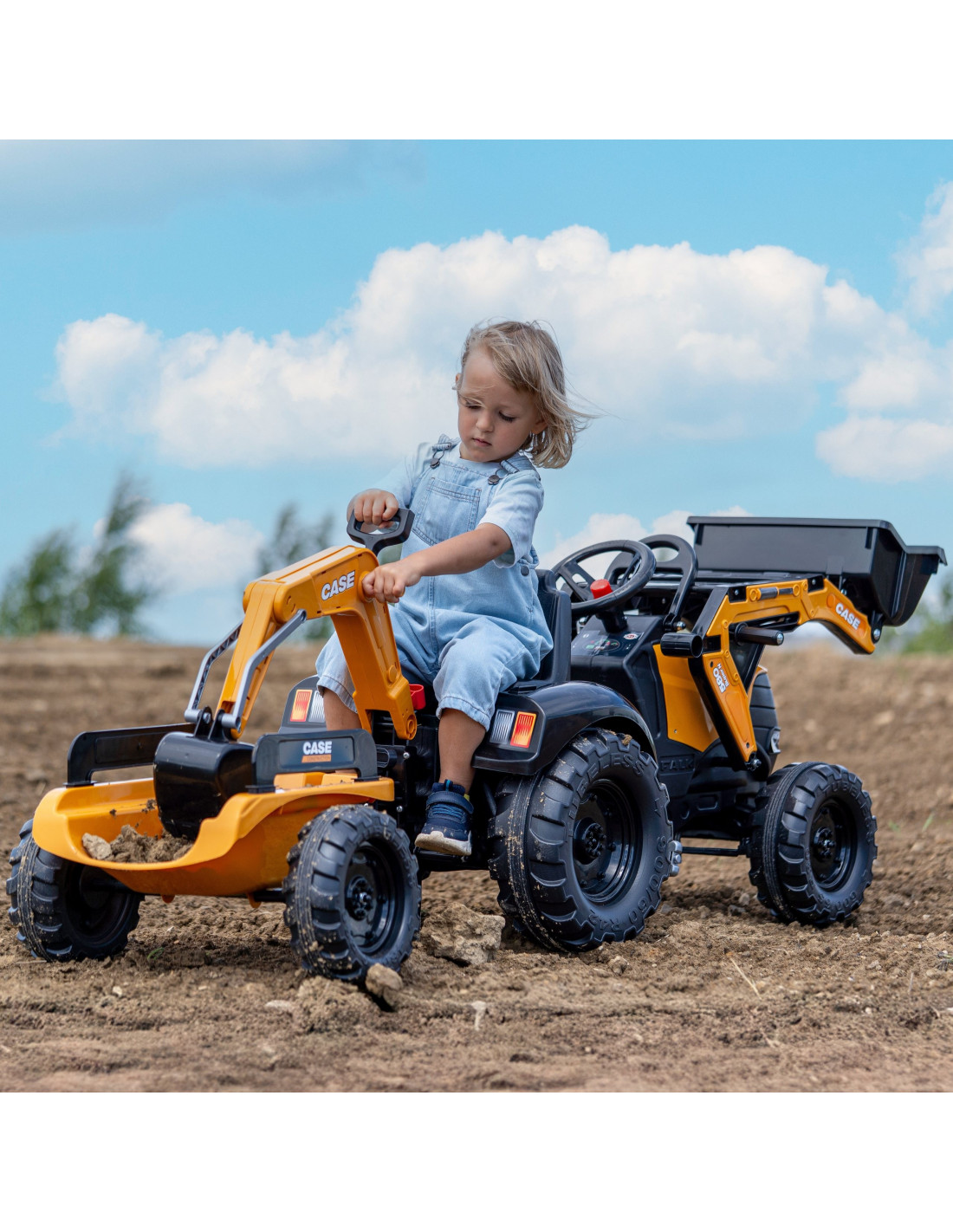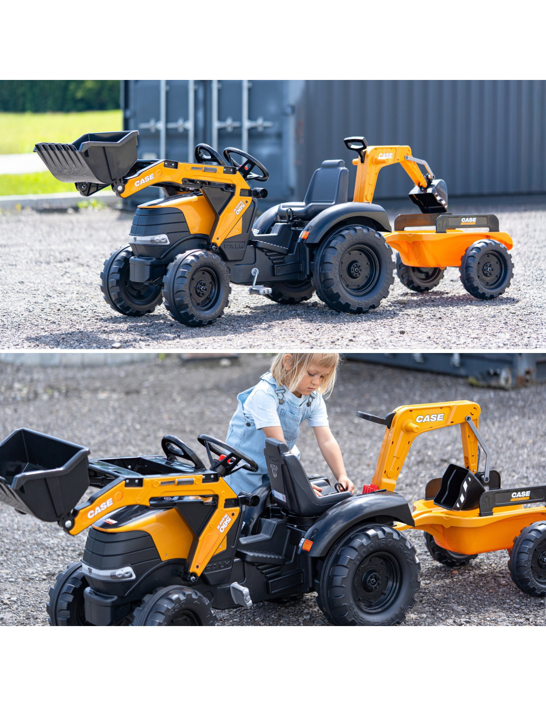 Garsaus gamintojo „Falk“ pagamintas „Case CE“ traktorius su pedalais yra kiekvieno vaiko svajonė. Šis įspūdingas transporto priemonė yra tikro „Case Construction“ traktoriaus tiksli kopija, sukurta specialiai 3–7 metų vaikams. Dėl tvirtos konstrukcijos ir dėmesio detalėms šis traktorius puikiai tinka žaisti sode, kieme. Jis yra „Eco Design“ linijos dalis, 100 % pagamintas Prancūzijoje, naudojant ne mažiau kaip 60 % perdirbto plastiko, todėl yra ekologiškas pasirinkimas. Transporto priemonė siūlo daug žaidimo galimybių dėl savo gausios įrangos. Ji turi visiškai funkcionalų priekį krautuvą ir galinį ekskavatorių, kurie yra sujungti, todėl vaikai gali realistiškai kasti ir perkelti smėlį, žemę ar lapus. Unikali savybė – 360° besisukanti sėdynė, leidžianti jaunajam operatoriui patogiai valdyti tiek priekinį kaušą, tiek galinį ekskavatorių, nenusileidžiant iš transporto priemonės. Komplekte taip pat yra nuimamas priekabos su bortais, puikiai tinkantis radiniams vežti. Vairo ratas su signaline užtikrina patogų vairavimą, o stabilūs ratai – saugų važiavimą.