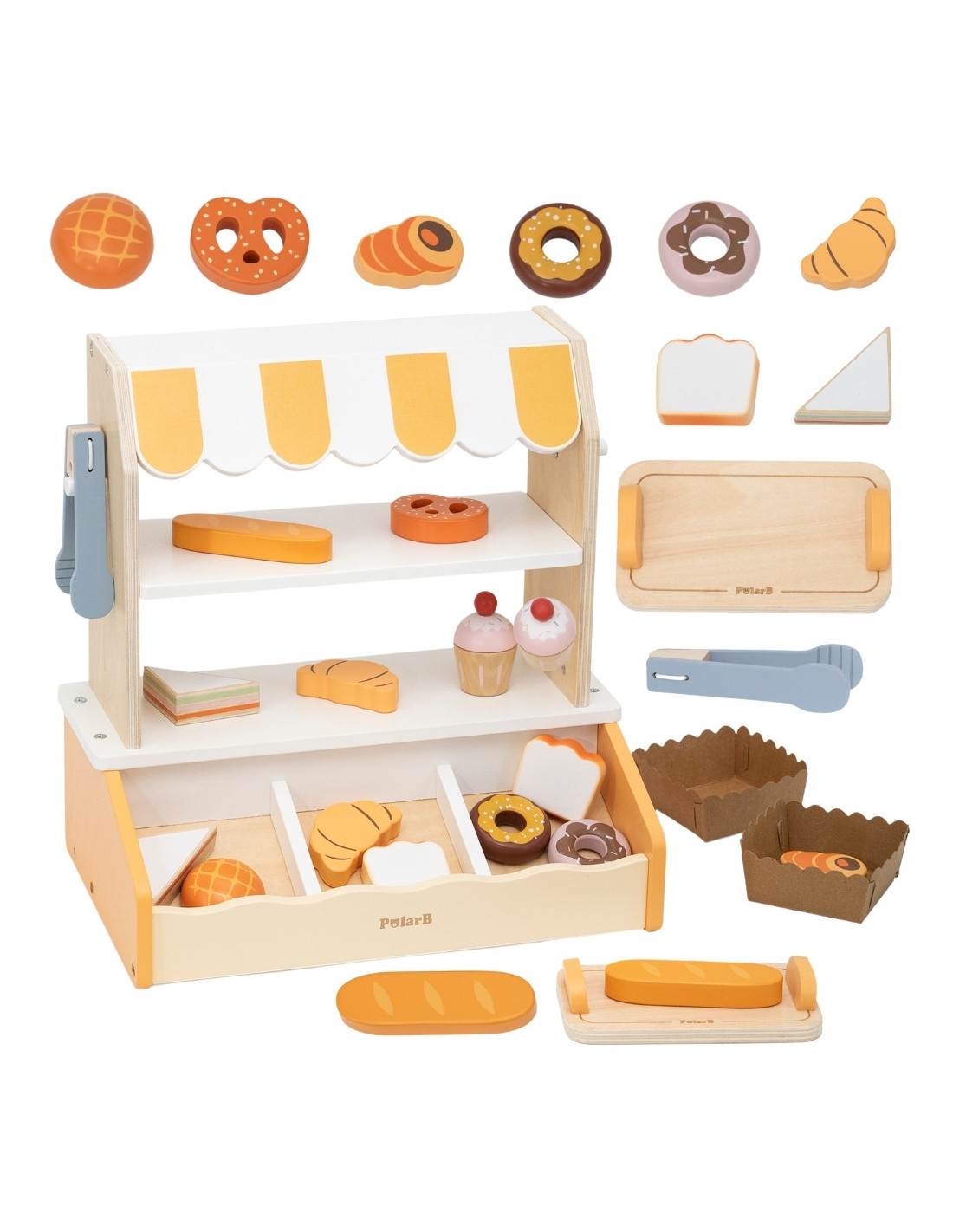 Ši žavinga medinė VIGA mini kepyklėlė – puikus žaislas vaidmenų žaidimams! Rinkinį sudaro tikroviškas stendas/prekystalis su dryžuotu stogu ir 16 medinių aksesuarų, imituojančių gardžius kepinius. Vaikai gali įsivaizduoti tikrą kepėją ar pardavėją , patiekdami klientams kruasanus, spurgas, skrebučius, keksiukus ir daugybę kitų skanėstų. Stovas turi dvi lentynas , specialią vietą duonai (imituojančią plytų krosnį) ir serviravimo žnyples , suteikiančias žaidimui autentiškumo. Subtilios, pastelinės spalvos (natūrali mediena, balta ir oranžinės/geltonos spalvos atspalviai) paverčia kepyklą gražiu bet kurio vaiko kambario papildymu. Kepyklos žaidimas puikiai lavina kūrybiškumą ir socialinius įgūdžius per sąveiką ir lavina motorinius įgūdžius manipuliuojant mažais elementais ir žnyplėmis. Aukštos kokybės ir patvari medinė konstrukcija garantuoja valandų valandas saugaus ir įtraukiančio žaidimo. Suteikite savo vaikui galimybę valdyti savo smulkųjį verslą su VIGA!