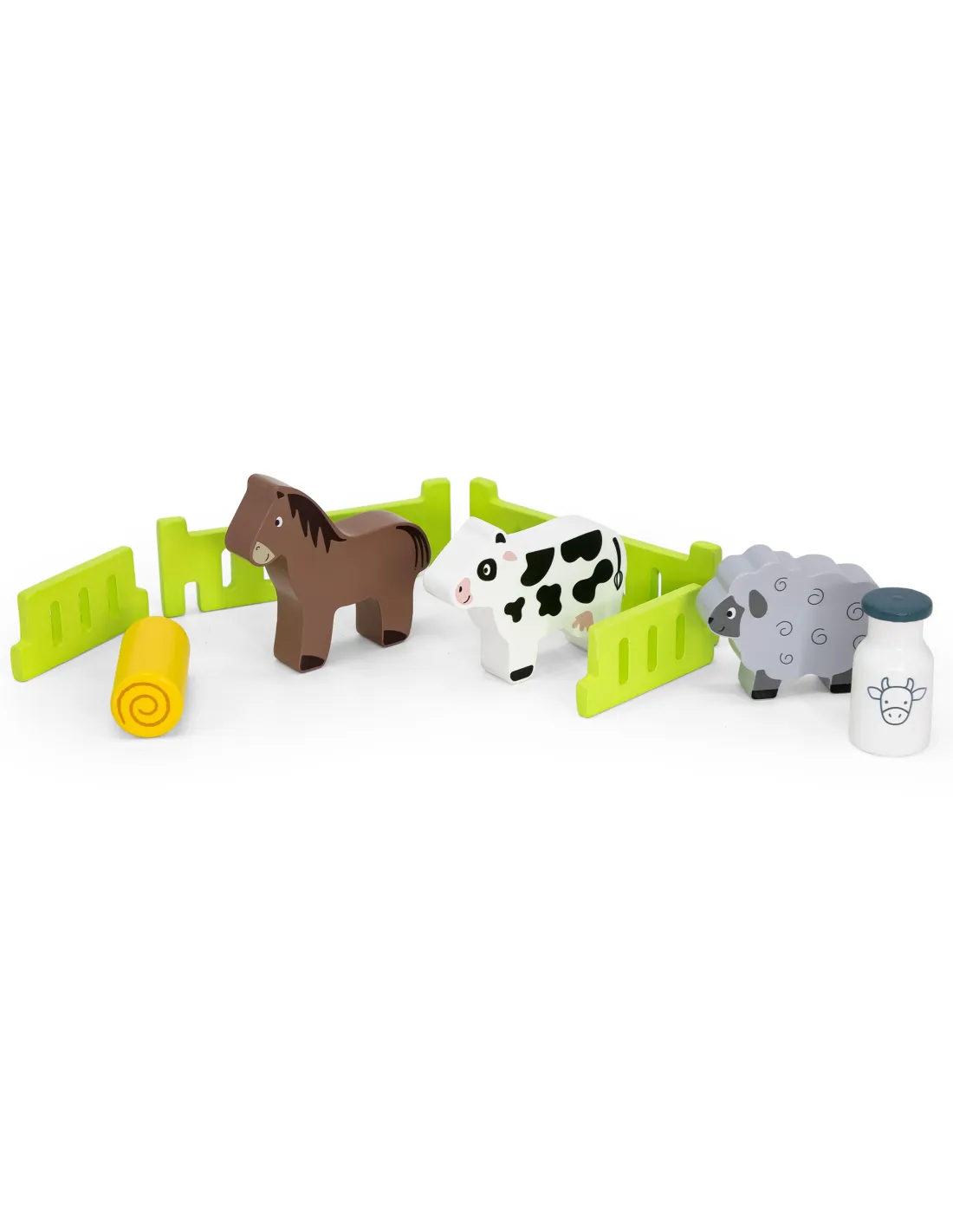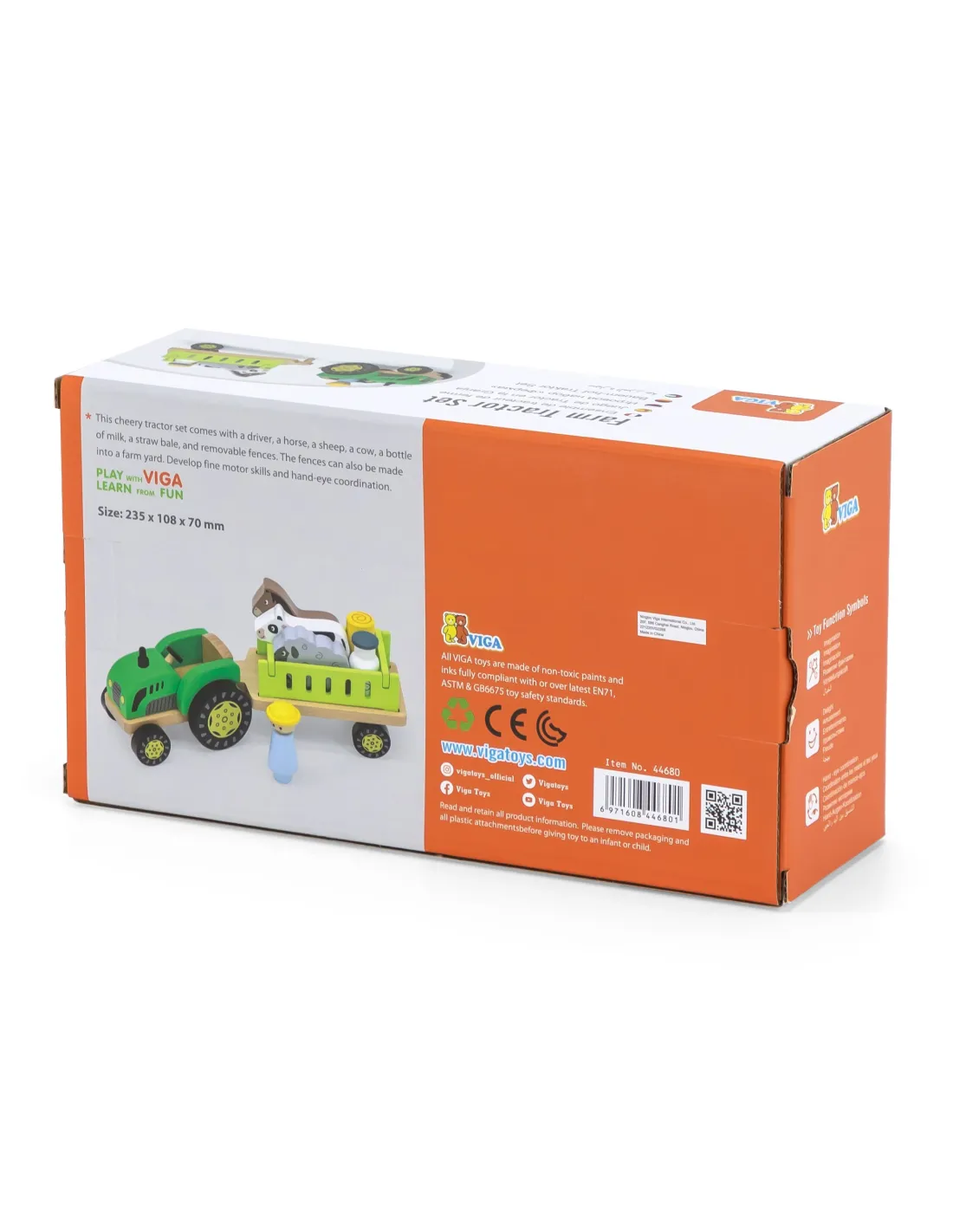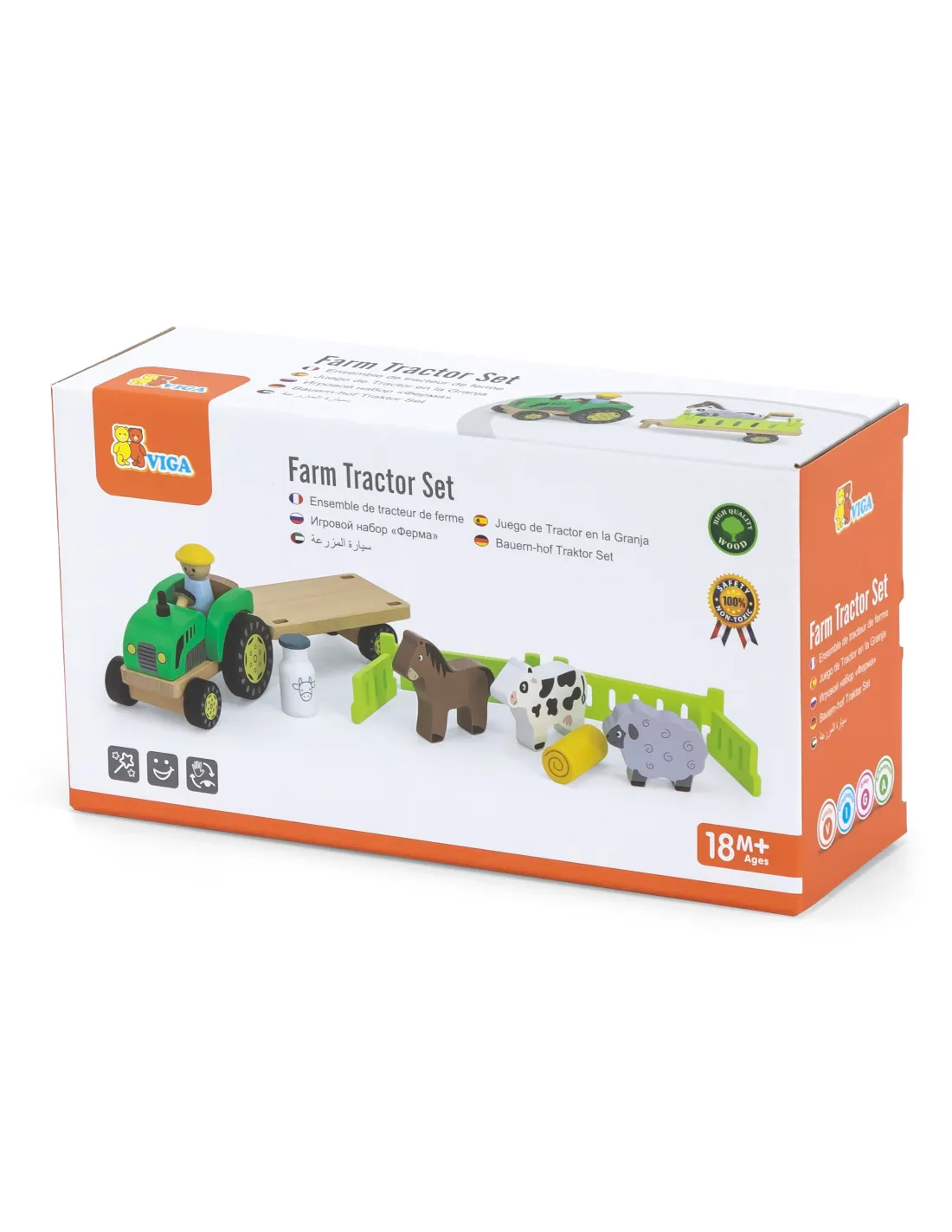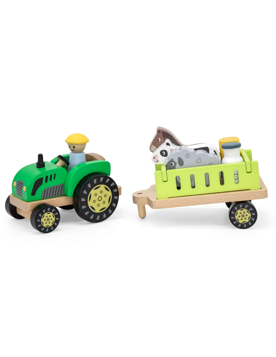 Medinis traktorius su gyvūnais iš garsaus Viga Toys prekės ženklo yra puikus rinkinys gyvūnų mylėtojams. Šis smagus traktorius turi vairuotoją, arklį, avį, karvę, pieno buteliuką, šiaudų ruloną ir nuimamus priekabos bortus. Bortus taip pat galima paversti ūkio tvora . Vaikai gali pasitelkti savo vaizduotę ir papasakoti savo istorijas apie ūkio gyvenimą. Puikiai tinka žaisti grupėms arba vienam.