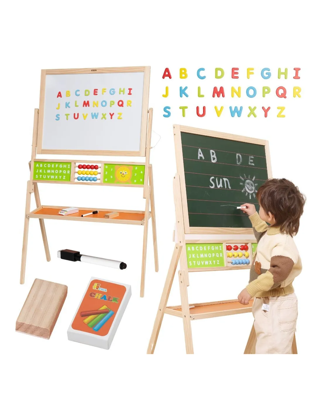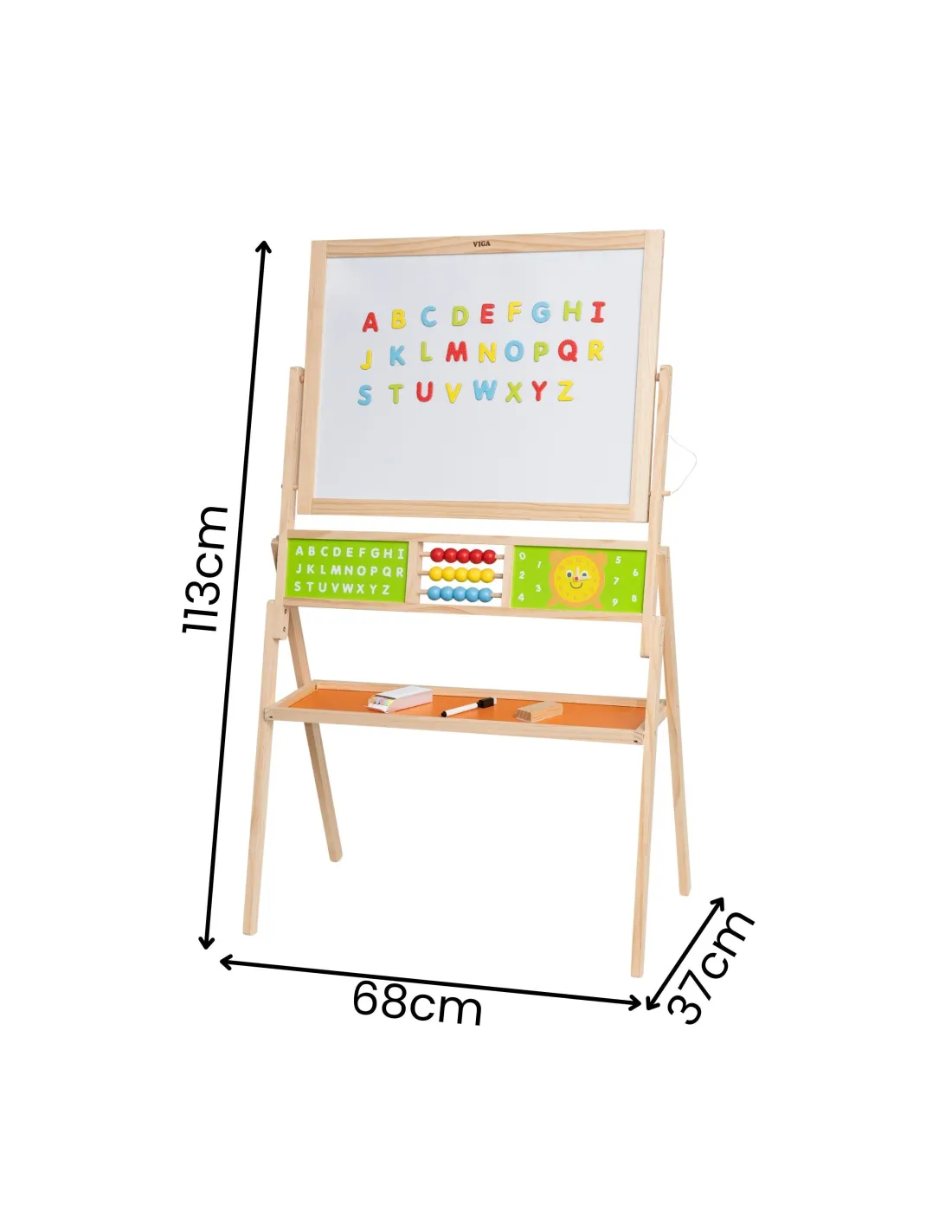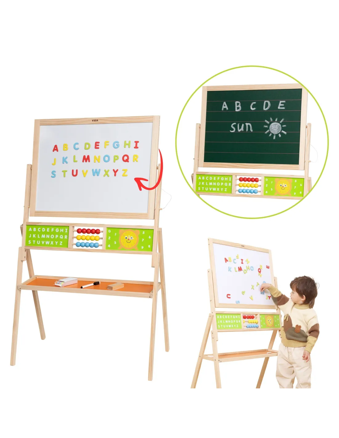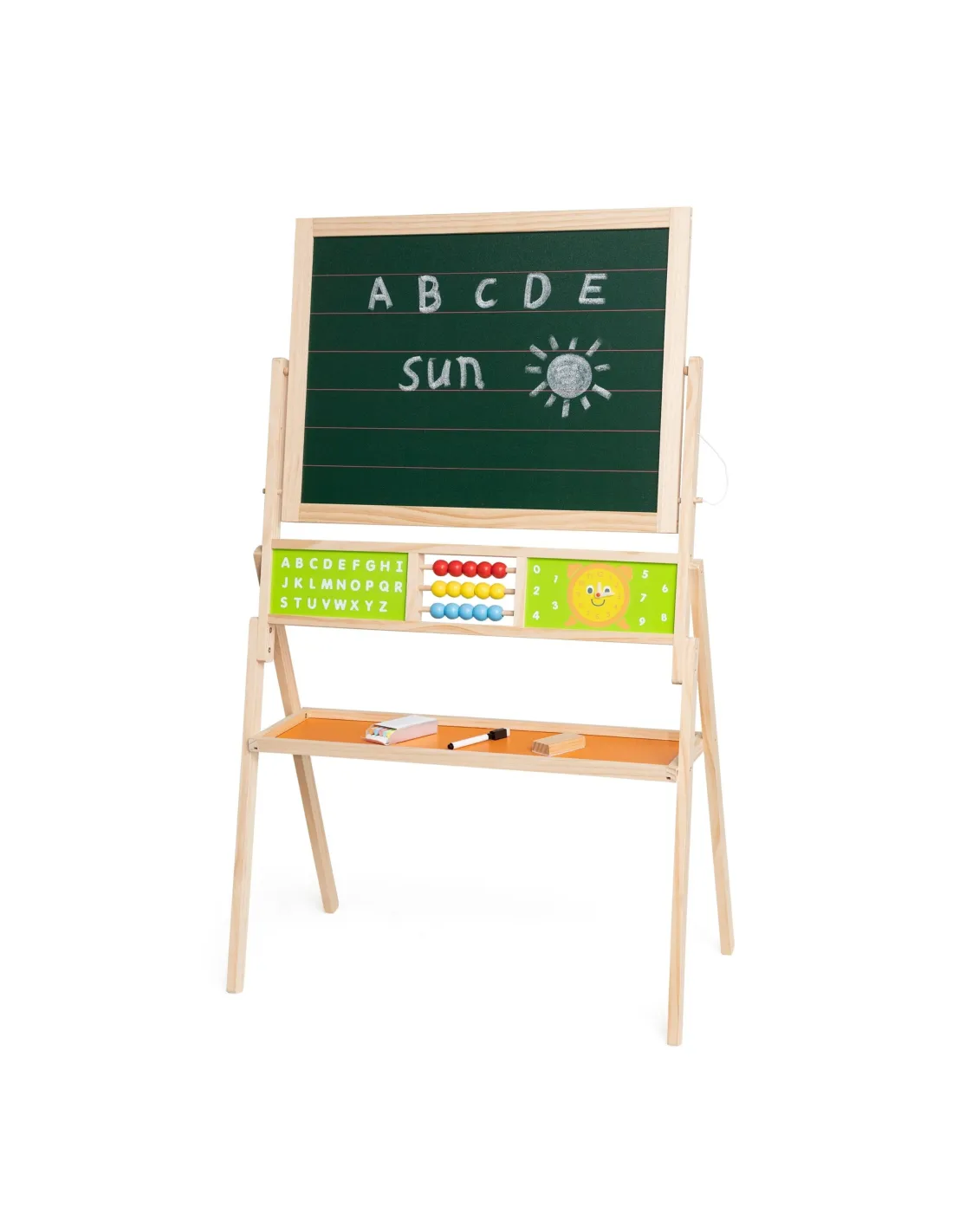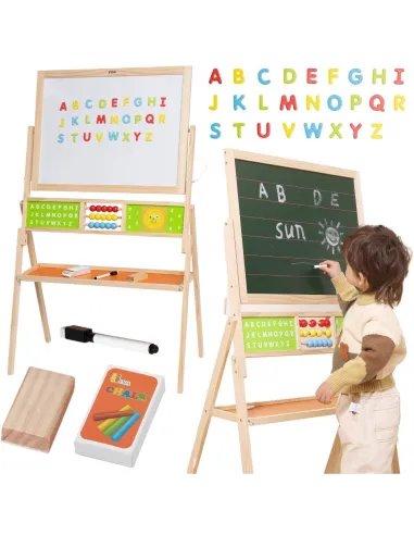 Discover the magical world of learning and creativity with the wooden educational board from Viga , which will transform your child's room into a true studio for a little genius! This double-sided structure is not only a space for artistic displays with chalk and marker, but also a comprehensive development center equipped with an abacus, clock, and alphabet. Thanks to the magnetic surface and extensive accessories, every day becomes a new, fascinating adventure with letters and numbers. The sturdy wooden construction and secure locks guarantee that play will be not only captivating but also safe for every toddler over 3 years old . This is an investment that combines the carefree joy of creation with the natural acquisition of key academic skills!