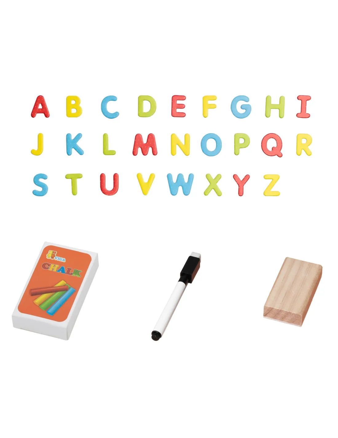 - - On one side there is a classic blackboard for drawing with chalk, on the other side there is a magnetic whiteboard for dry erase markers and letters