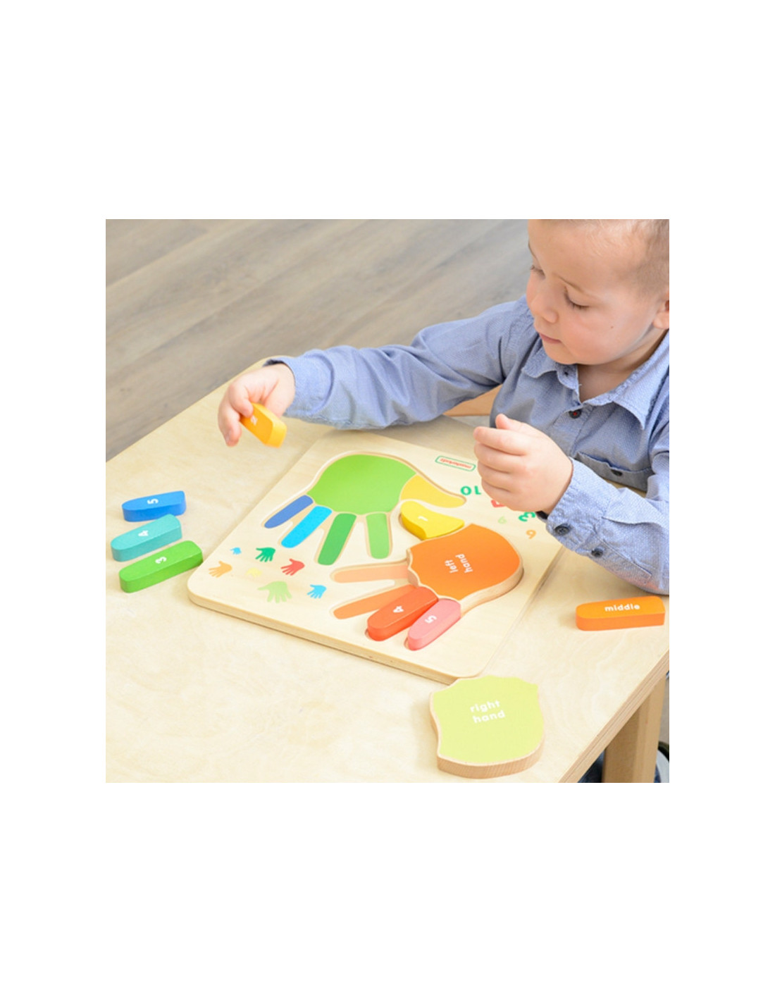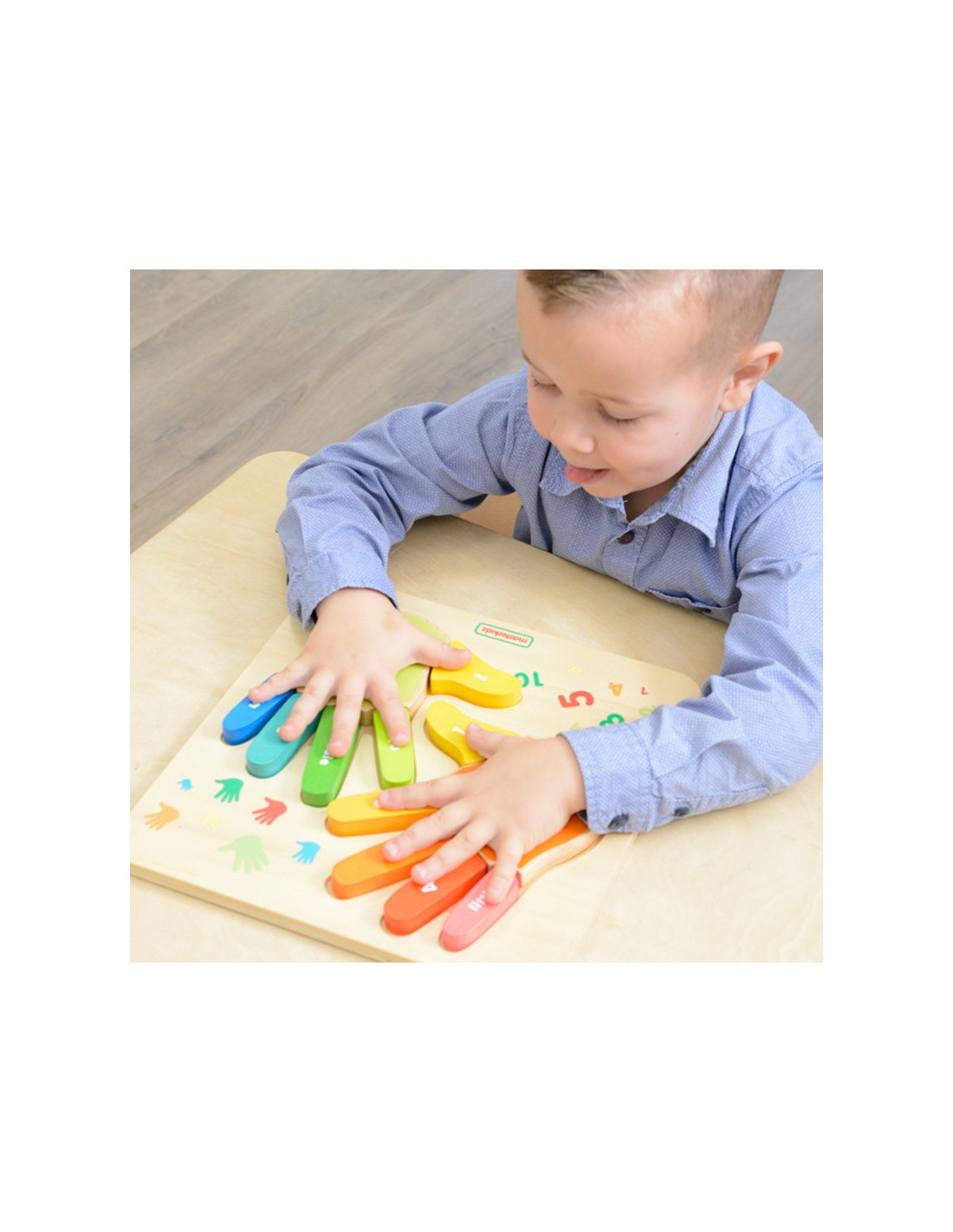 Nauka liczenia wcale nie musi być trudna i skomplikowana! Dzięki wspaniałej tabliczce edukacyjnej dla dzieci, nauczą się one liczenia na palcach bez żadnego problemu. Zabawka składa się z dwóch kolorowych dłoni umieszczonych na drewnianej planszy. Dłonie opisane są stronami: prawa i lewa. Palce również są podpisane - zarówno nazwami palców, jak i cyferkami, które można im przypisać podczas liczenia na palcach.