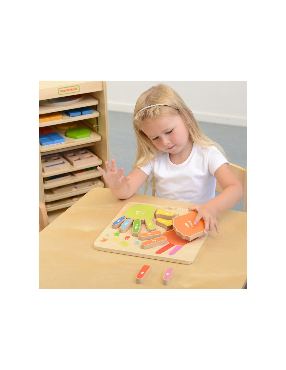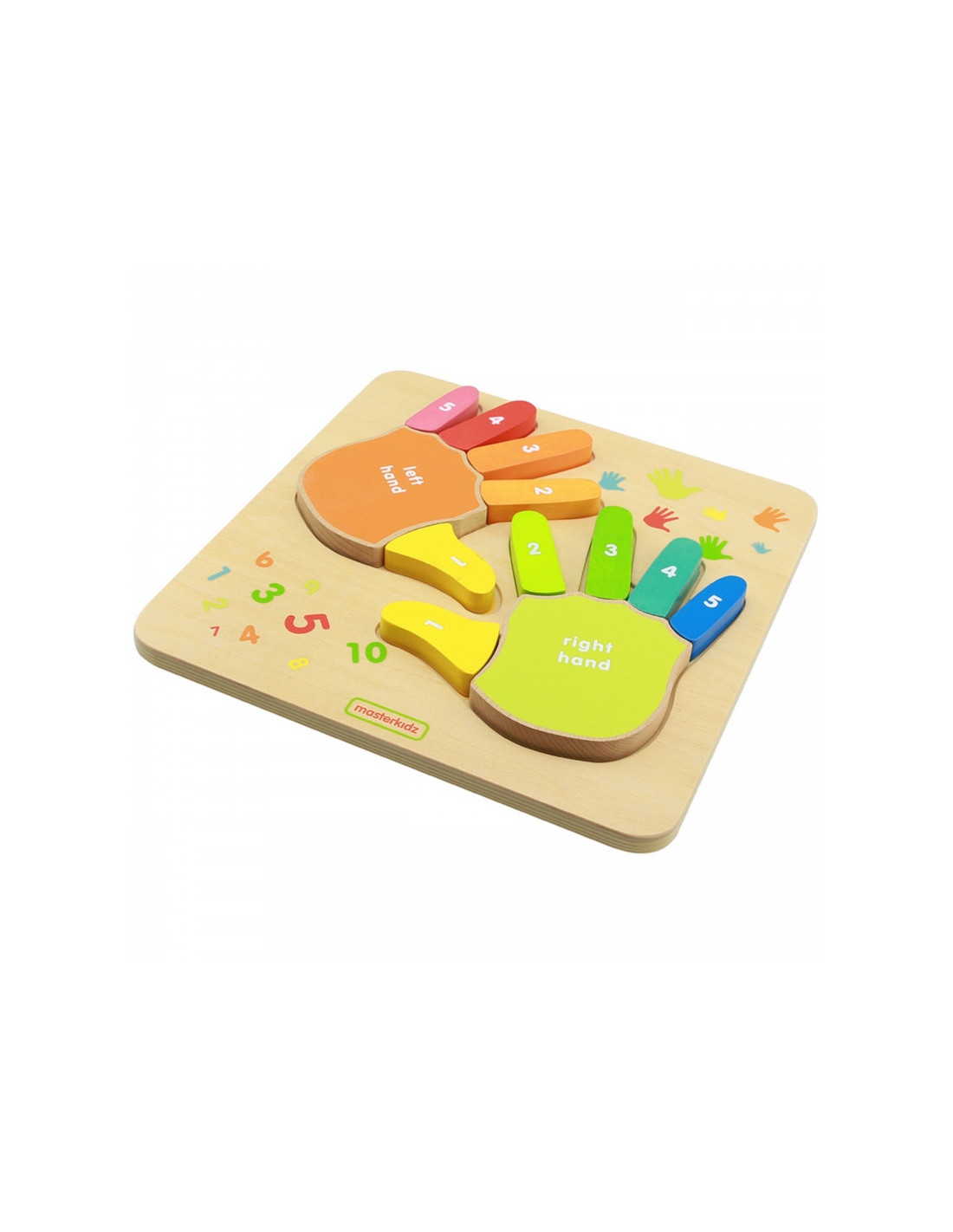 Drewniana tabliczka do nauki liczenia na palcach marki MASTERKIDZ to świetna pomoc dla maluszków, które zaczynają swoją matematyczną przygodę. Kolorowe dłonie na tabliczce są dokładnie opisane nazwami palców, oraz stronami: prawą i lewą. Każdy z palców ma również przypisaną cyferkę, dzięki czemu dziecko może zdobytą wiedzę przełożyć na liczenie na własnych palcach, gdy już zrozumie zasadę.