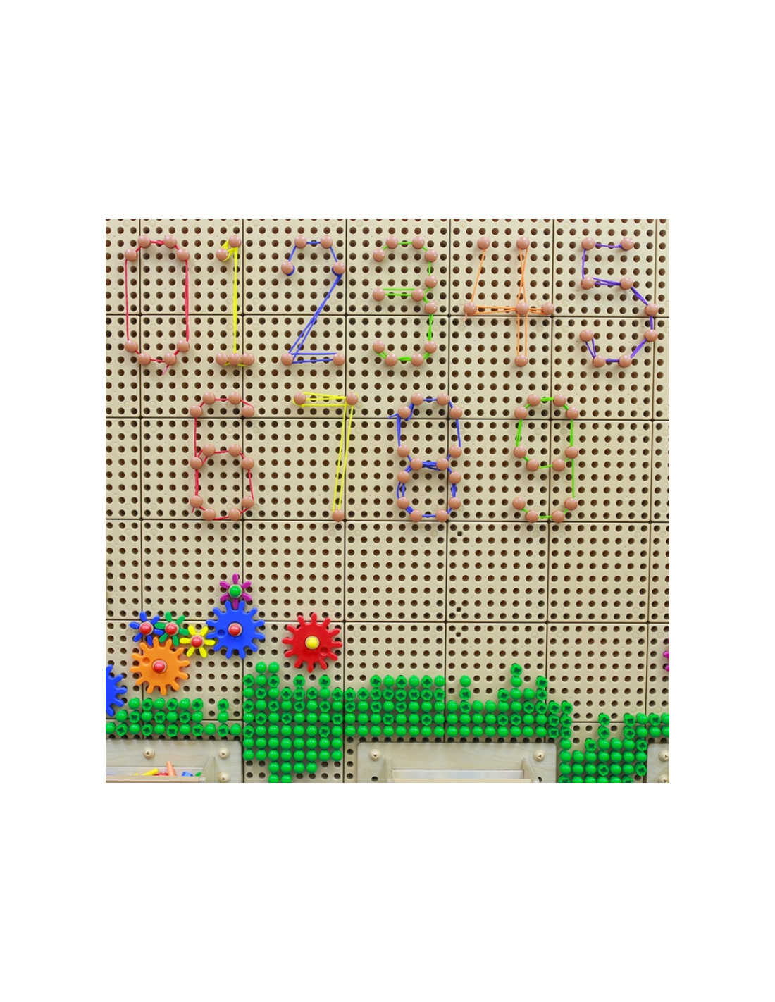 Umieść kołki w odpowiednich miejscach, a następnie połącz je za pomocą kolorowych sznurków. Tym sposobem można "rysować" literki, cyferki, figury geometryczne, a także wszystko inne, co nam przyjdzie do głowy.